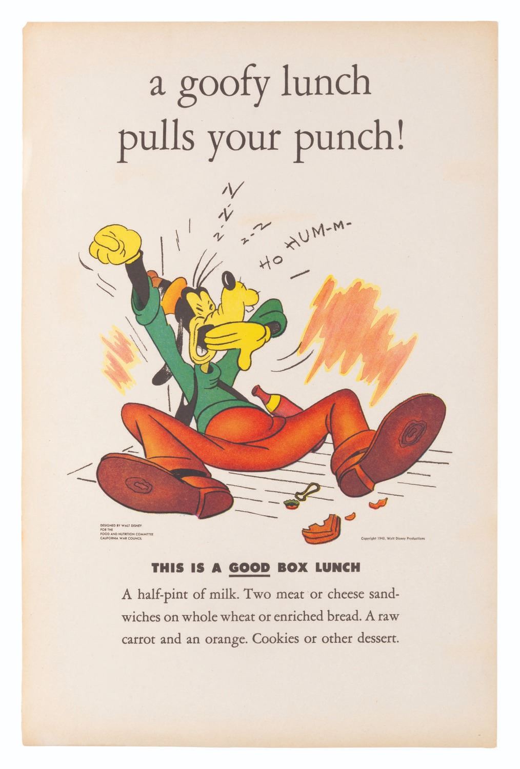 (Disney, 1943) A World War II motivational poster created by Walt Disney Studios for the Food and Nutrition Committee of the California War Council showing the ill effect eating a “goofy” lunch has on productivity. Measuring 12.5” x 19”, the poster is in very good condition with light browning from age, especially to the edges, and three faint .25” tears to the edges, with some small creases.