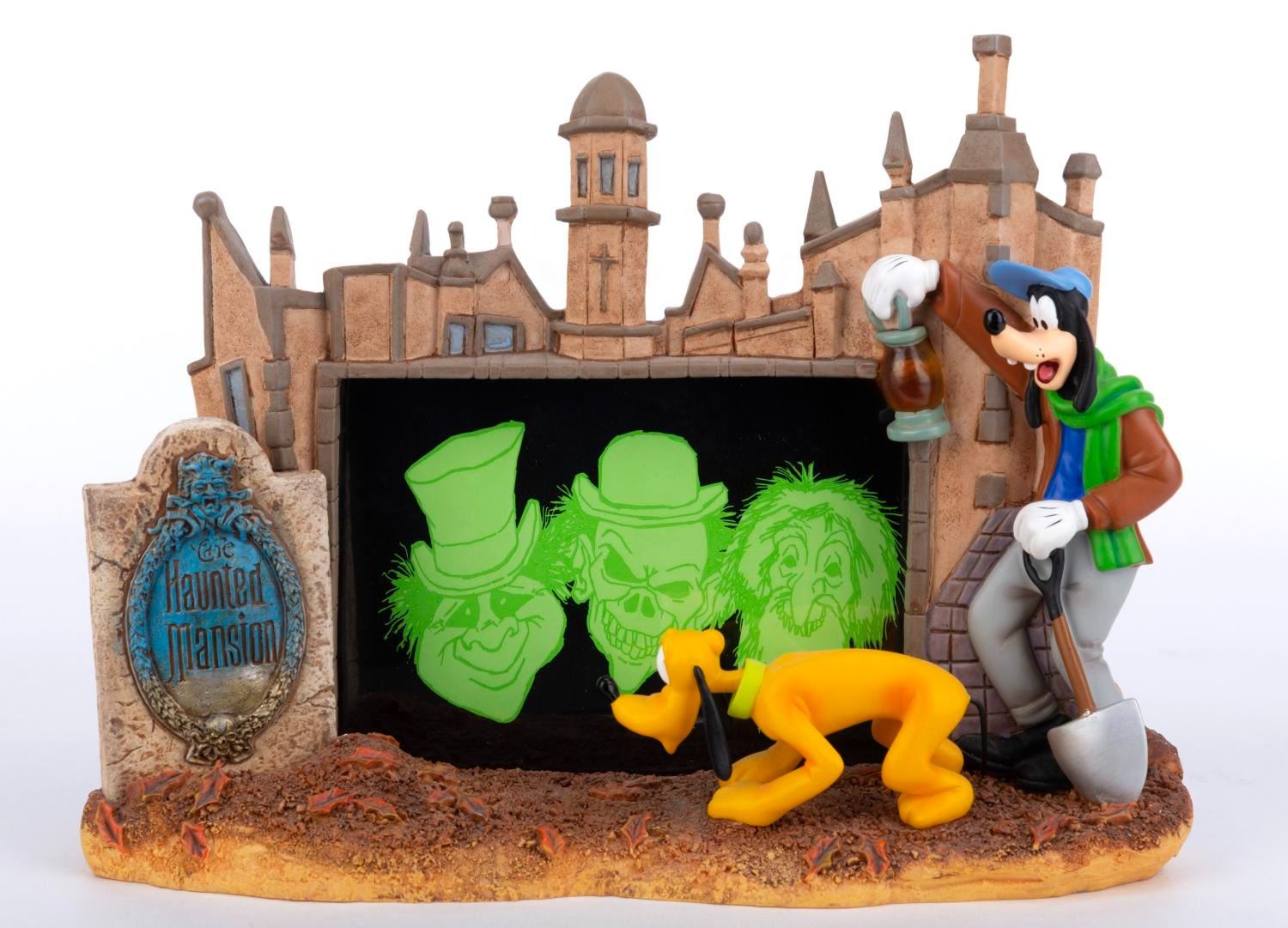 (Walt Disney World) A Haunted Mansion figural photo frame featuring Goofy and Pluto as The Groundskeeper and his dog at the Walt Disney World Haunted Mansion, with an illuminating light feature. Measuring 8.5"x6.5", this piece has been tested for function and is in fine condition.