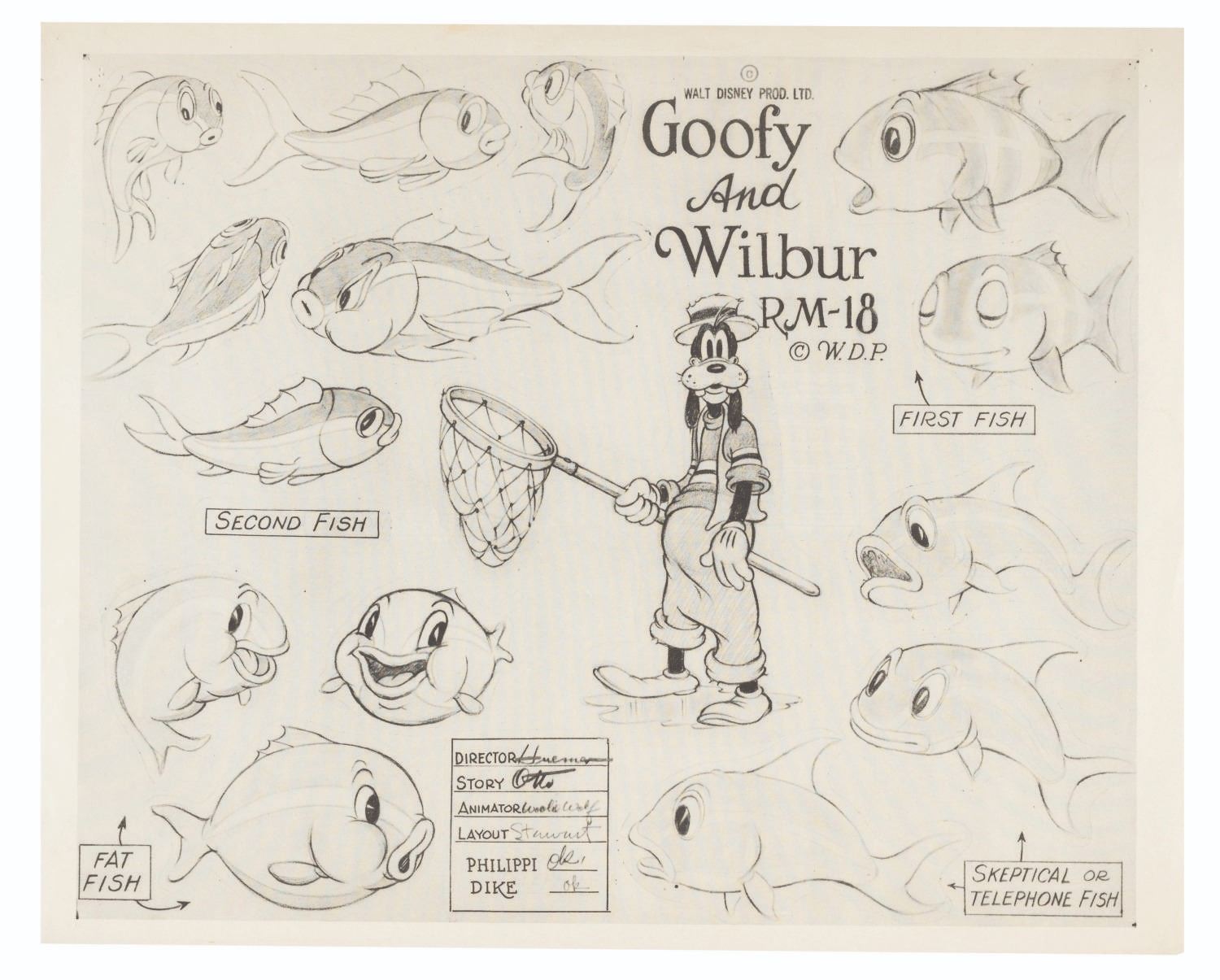 (Disney, 1939) A studio copy model sheet of various fish from the 1939 short “Goofy and Wilbur” which is Goofy’s first solo cartoon. Original character drawings were grouped together on a single sheet to create a model sheet. Photostat copies were then created and distributed to the animators to make sure the look of the characters remained consistent throughout the film. The model sheet measures 140” x 12.5” and is in very good condition with minor pinholes and handling from production use.