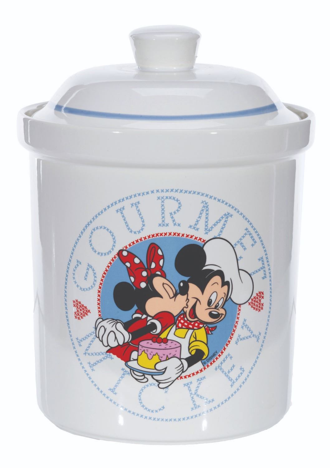 (Treasure Craft, 1980s-90s) A Gourmet Mickey ceramic canister with a lid. Measuring 6.75" x 9", the canister displays in fine condition with very light smudges on the lid's handle and a very small chip along the bottom edge.