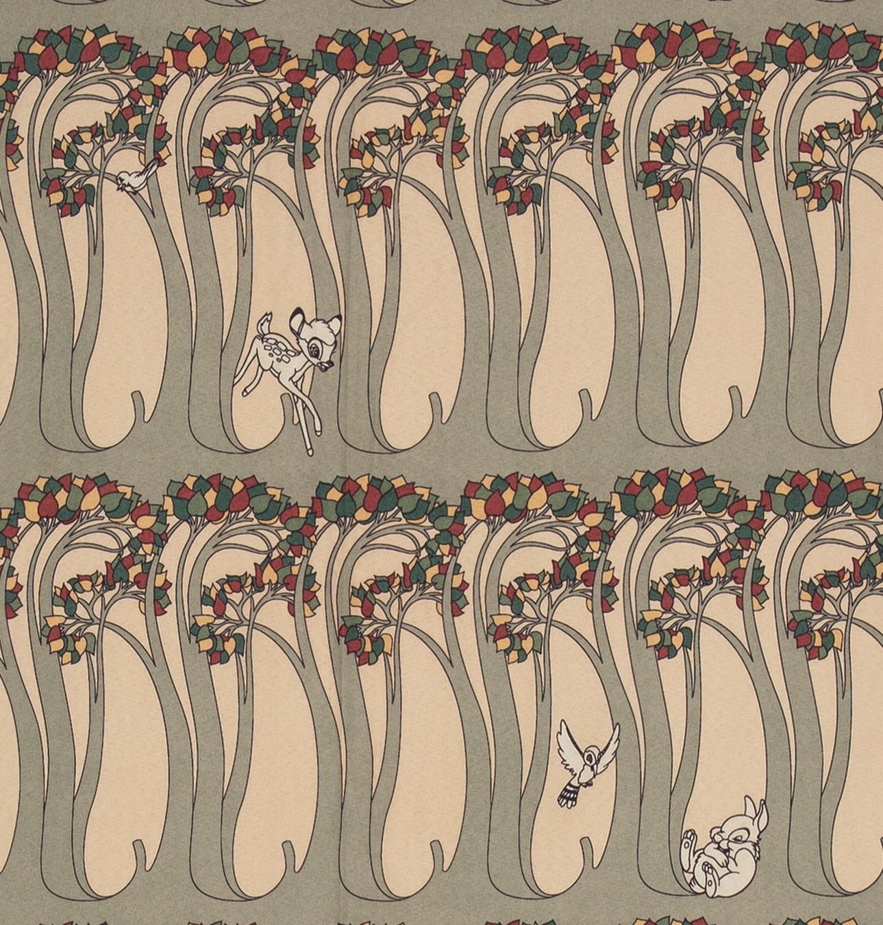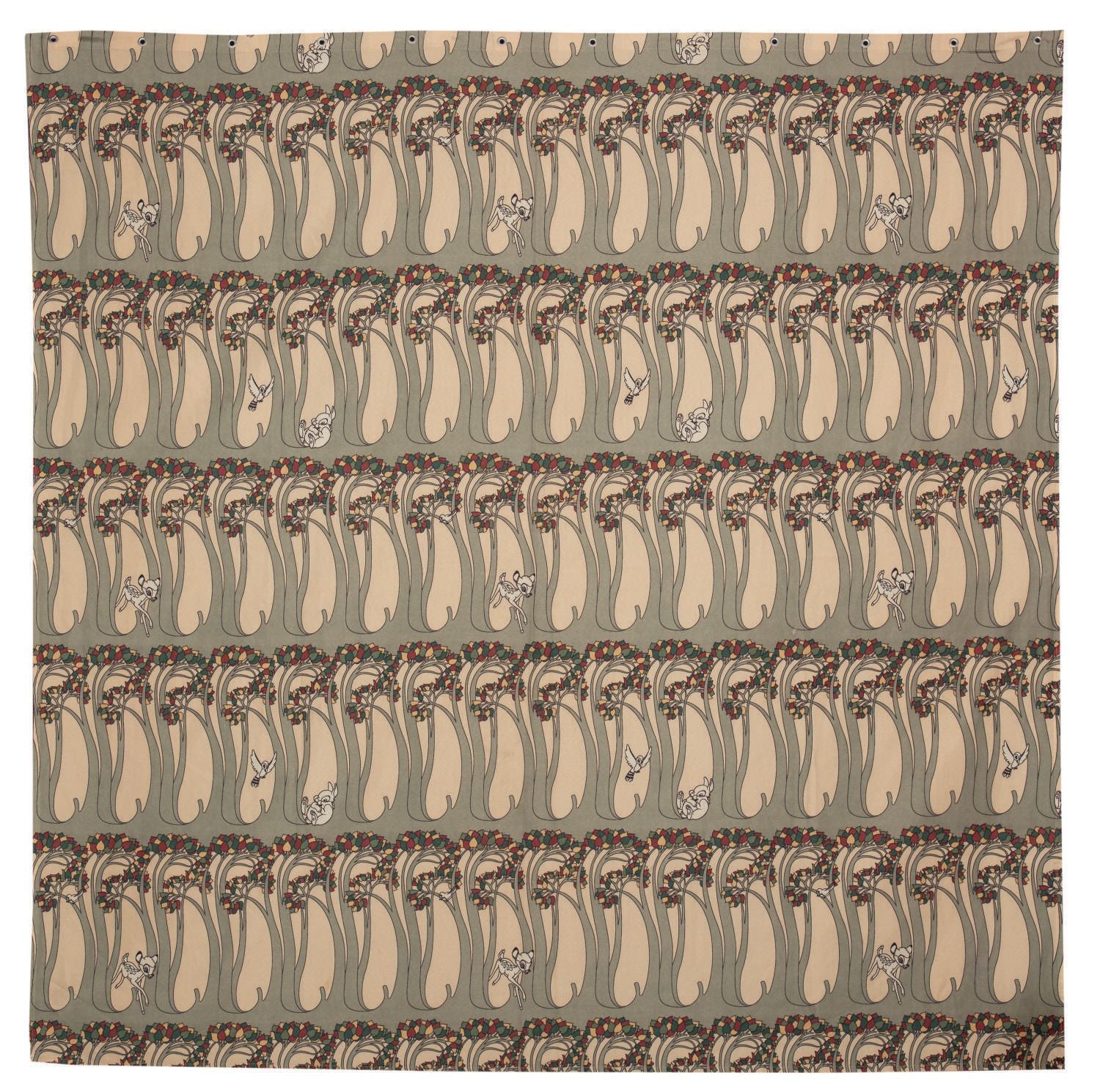 (Disney's Grand Californian, 2000s) A Bambi shower curtain from the Disney's Grand Californian Hotel. The Grand Californian shower curtain features the young prince Bambi and Thumper frolicking through the forest, enhanced with the four-tone palette of the Grand Californian Hotel Resort. Measuring 70"x70" the guest suite shower curtain exhibits some fading, as well as fabric loss and wear to edges, and worn plastic label from Park use.