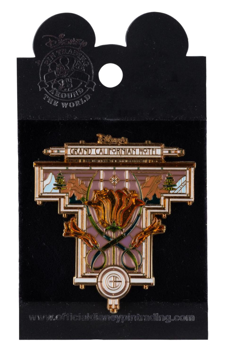 (Disneyland Resort, 2002) A Grand Californian Hotel pin featuring Grizzly Peak and the Matterhorn with a Golden Poppies design after the Hotel’s stained glass windows. The pin is in fine condition on the original card.