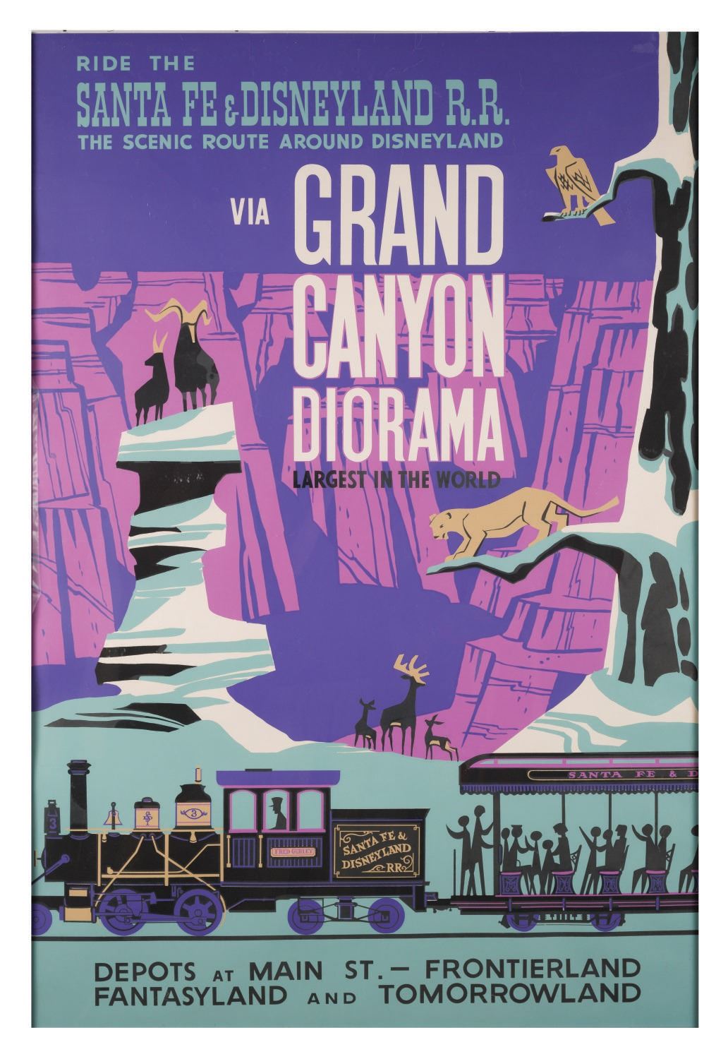 (Disneyland, 1958) An original hand-silkscreened attraction poster for the "Santa Fe & Disneyland R.R. via Grand Canyon Diorama." Designed by Paul Hartley, this rare early variant of the poster lists the Fantasyland Depot along the bottom, which was removed from the poster in 1962. Measuring 36"x54" the poster is in very good condition, linen backed for preservation, with minor wear to edges, a few mild creases and spots of wear to the paint, particularly visible in the black layer.
