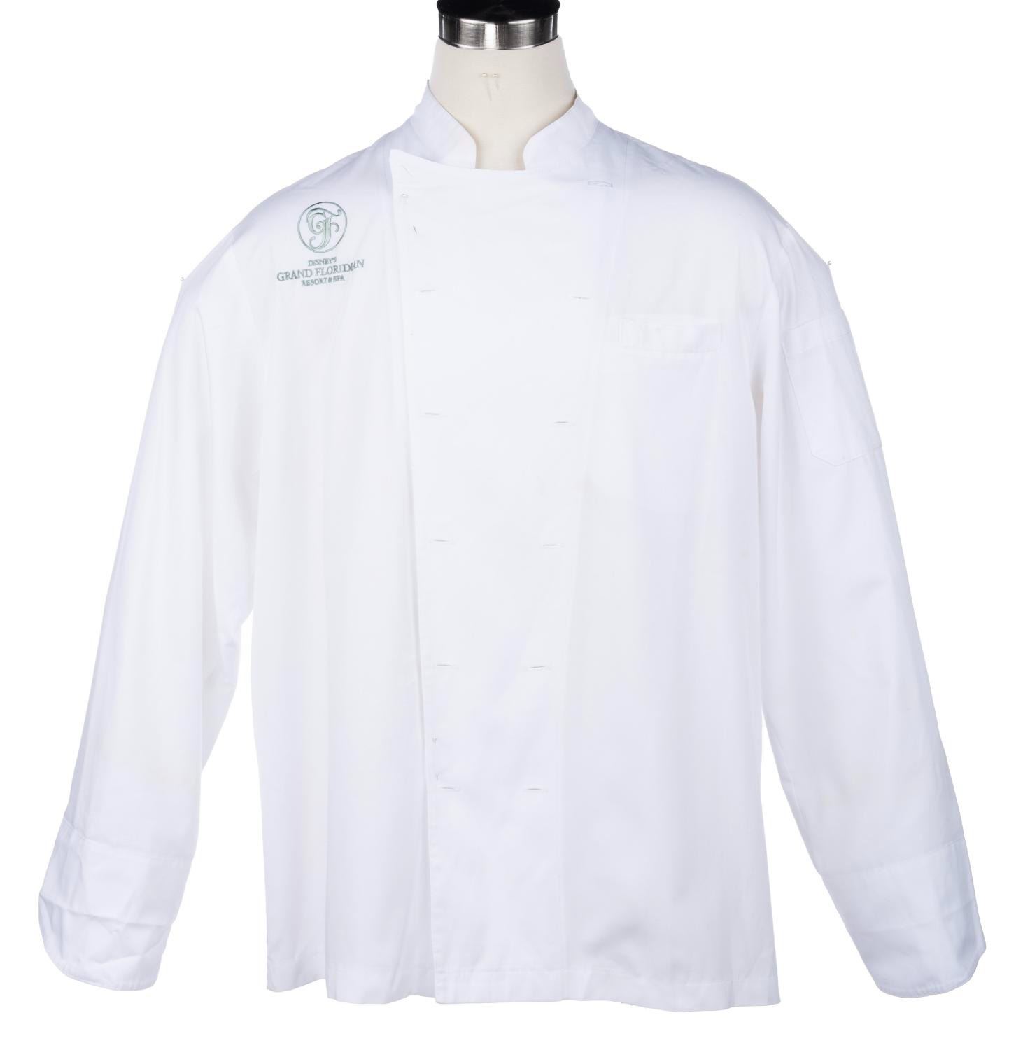 (Walt Disney World) A chef's coat worn by Cast Members of the Grand Floridian Resort and Spa at Walt Disney World. Measuring a Size XL/L, the coat is in very good condition with stains and wear from Resort use.
