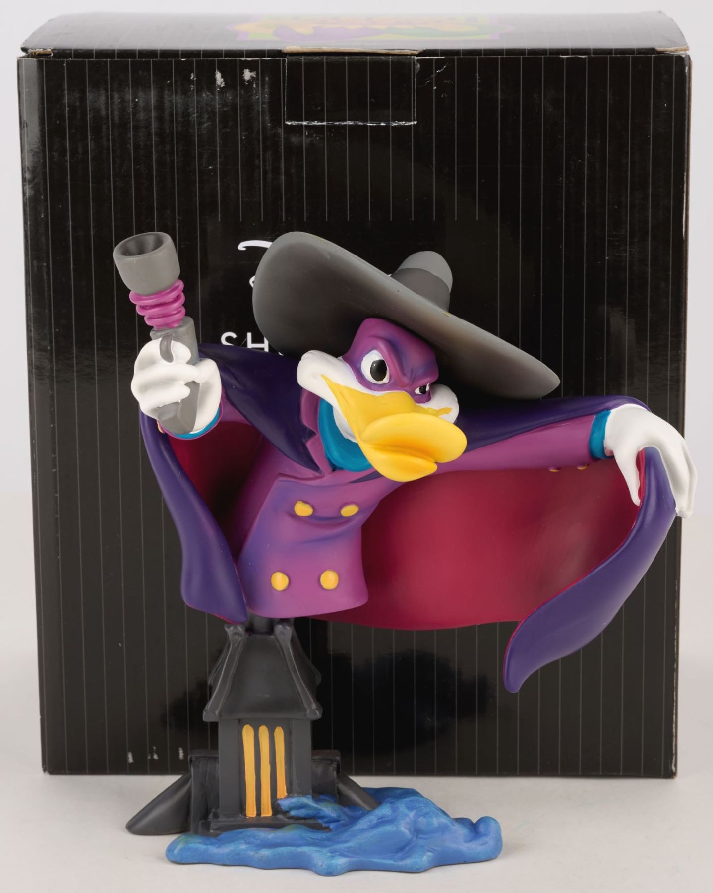 (Enesco, 2016) A Grand Jester Studios figurine bust of Darkwing Duck from the Disney animated series of the same name. Measuring 6.5" x 3.5" and 7.75" tall, the stone resin figurine is in fine condition and comes with the original 8" x 5.5" x 9.25" box.
