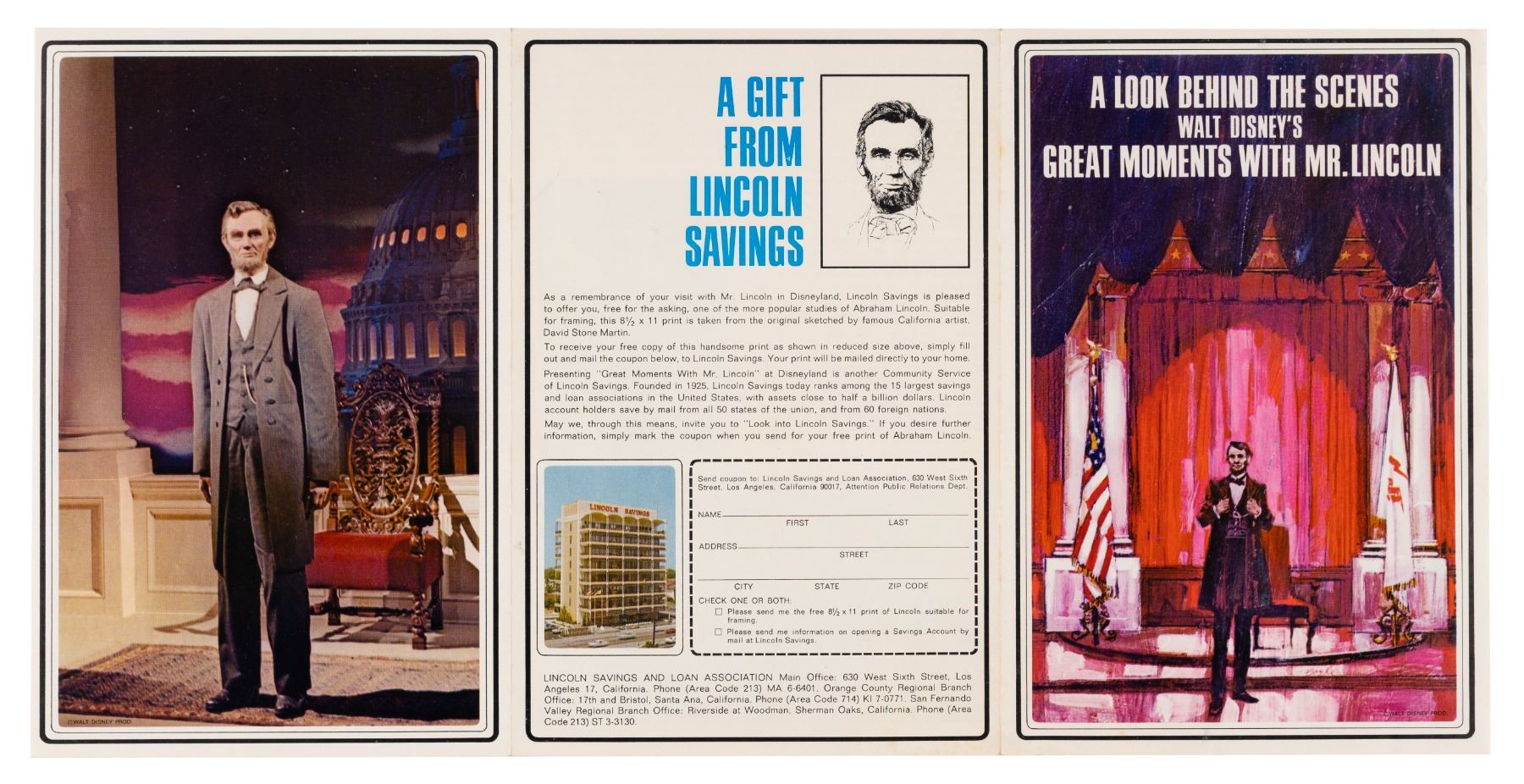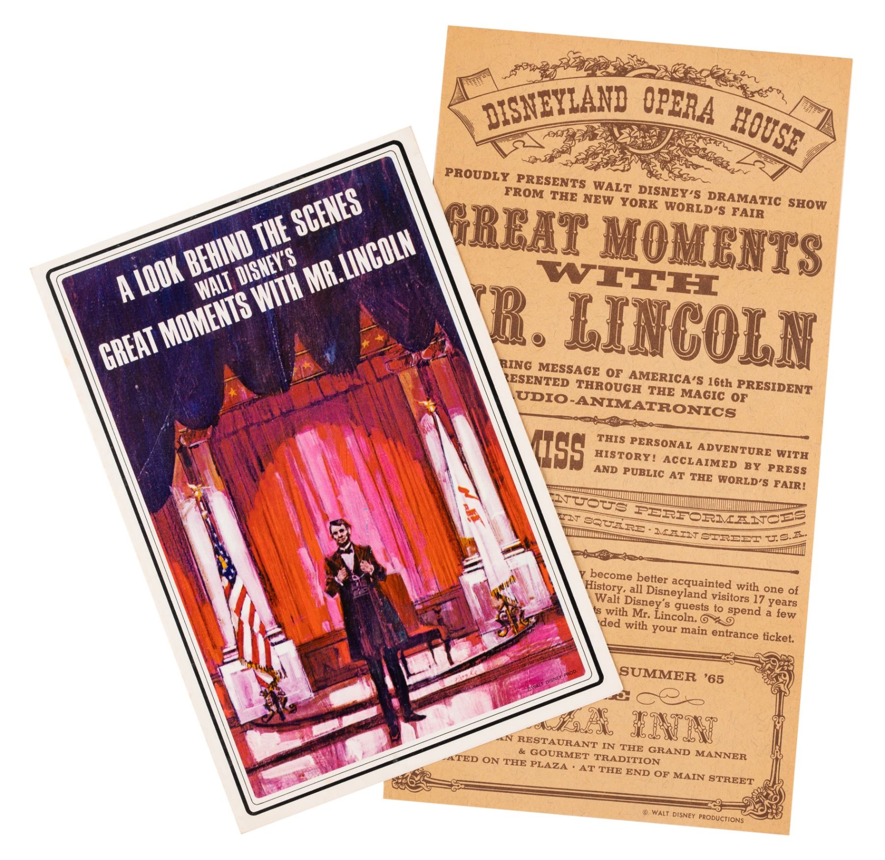 (Disneyland, 1965) A pair of rare early promotional items for the Great Moments with Mr. Lincoln attraction. The handbill was distributed at Park entrances to announce the new attraction at the Disneyland Opera House. The tri-folded brochure explains the technology behind the innovative audio-animatronic attraction. The handbill measures 11" x 5.75" and has faint horizontal creases from being folded and a tiny tear in the top edge. The brochure is 8.5" x 5.75" and exhibits minor handling wear. Both are in very good condition.
