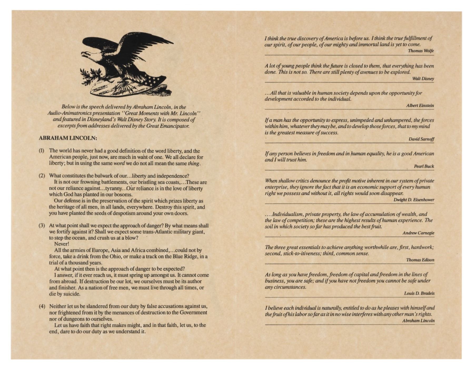 (Disneyland, 1970s-80s) A Great Moments with Mr. Lincoln souvenir program. Inside is the text of Lincoln’s speech from the attraction, as well as sources on the back. Measuring 5.5” x 8.5”, the program displays in fine condition with a small spot on the second “n” in “Lincoln.”