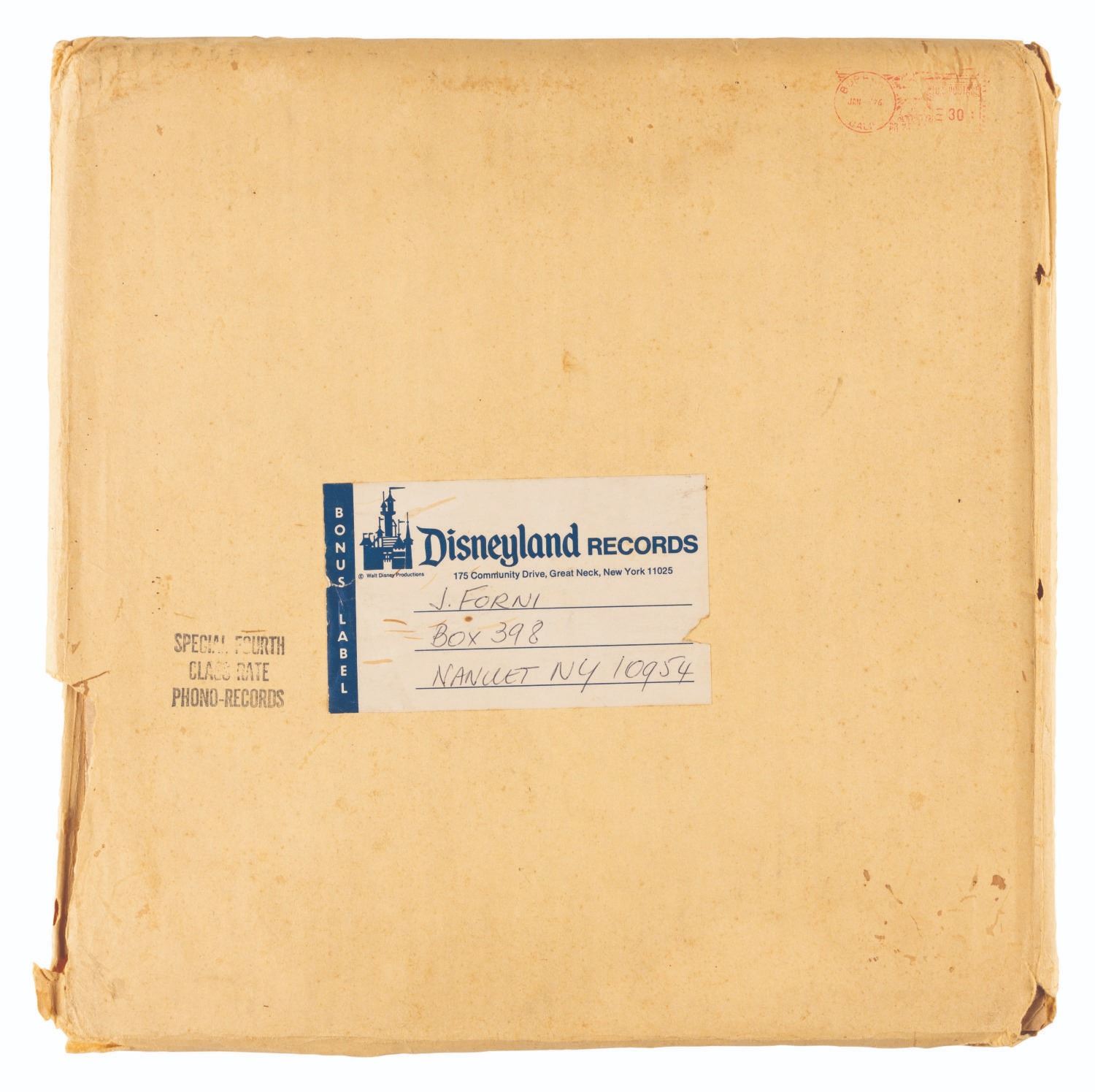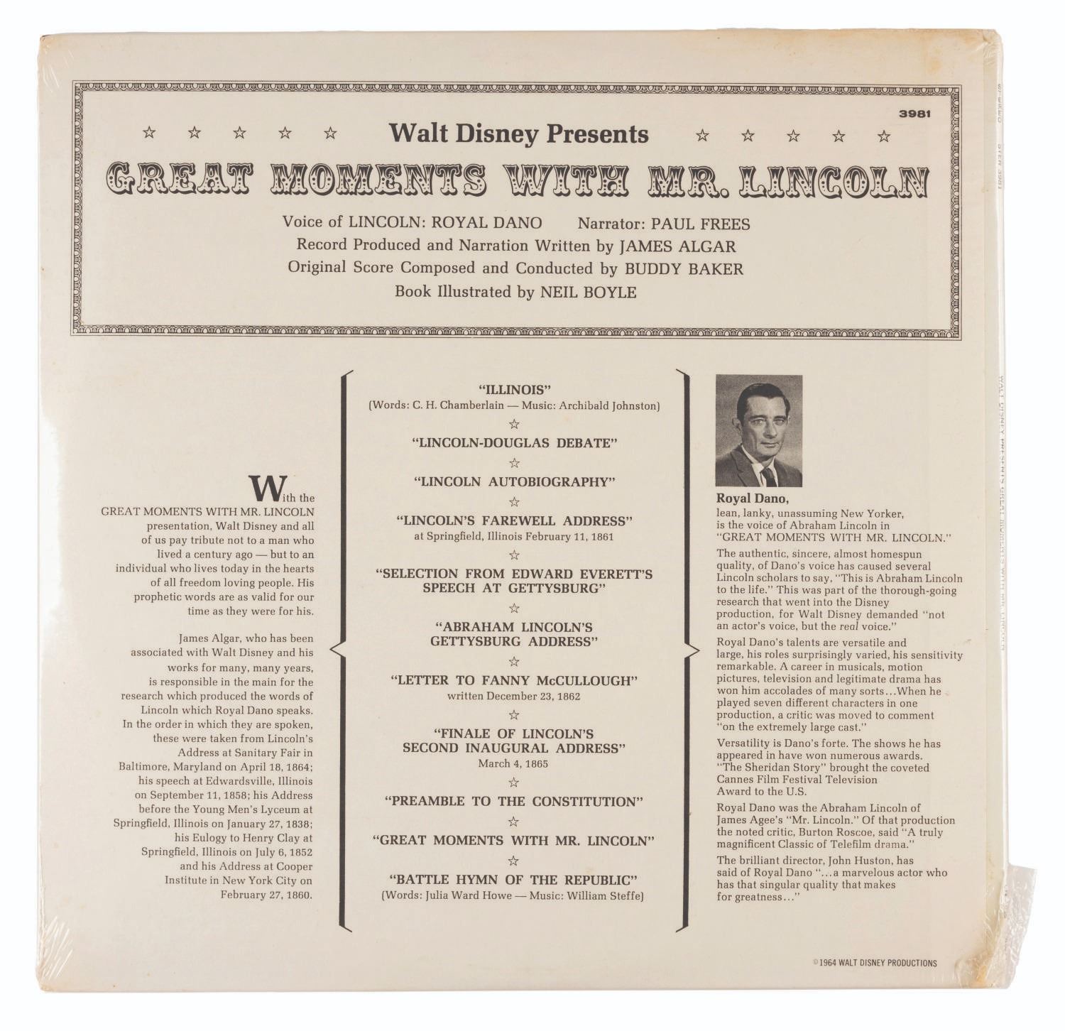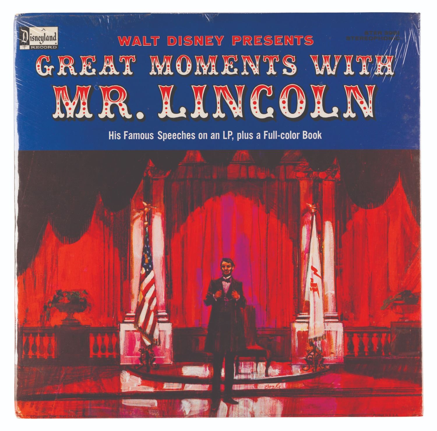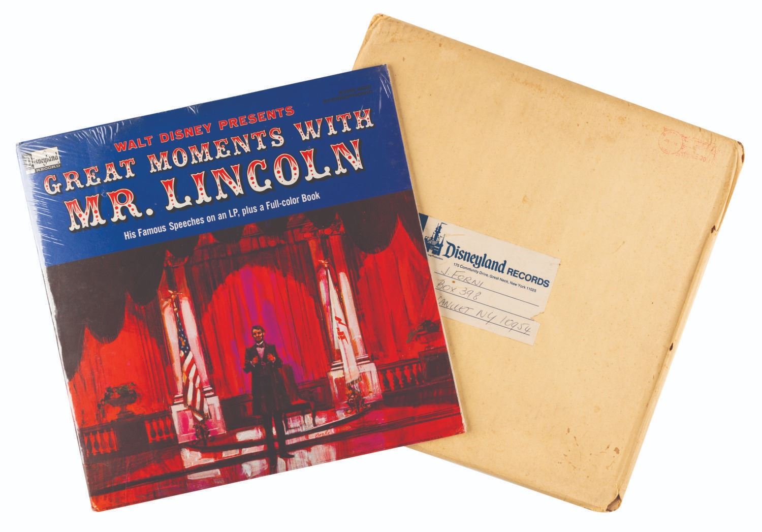 (Disneyland, 1964) An extremely rare unopened Walt Disney Presents Great Moments with Mr. Lincoln record featuring several of Lincoln's speeches and a full-color book. The record was created for the World's Fair version of the attraction, as it would not come to Disneyland until 1965. Included is the original Disneyland Records shipping sleeve. Measuring 12.5" x 12.5", the album is in very good condition with light creases, discoloration from age, and tears in the packaging at the corners. The 13.25" x 13.25" original shipping sleeve is in fair condition with heavy tears, stains, and wear from shipping.
