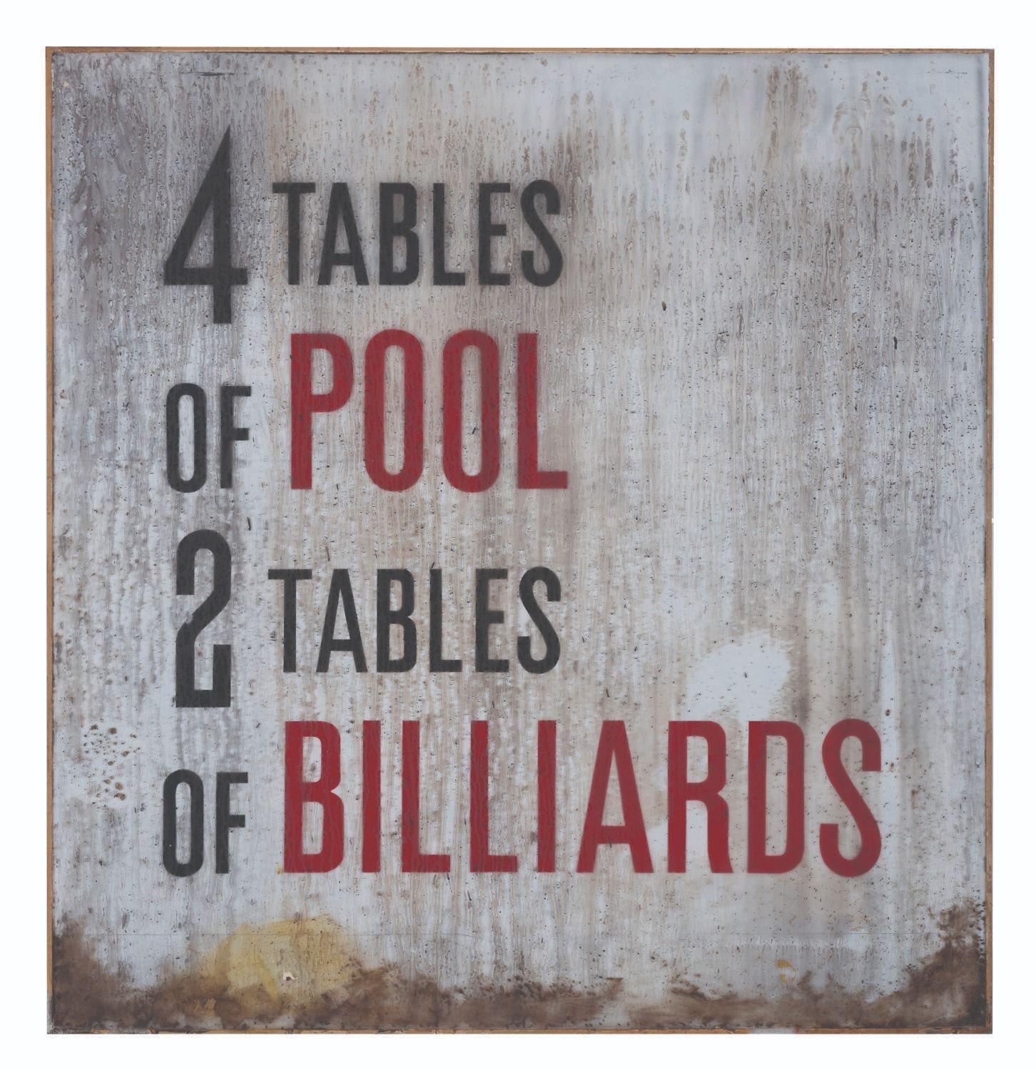 (Walt Disney World, 1980s-2000s) A pool and billiards sign from The Great Movie Ride. The attraction had a gangster section featuring many buildings modeled after those from the 1931 film, “The Public Enemy.” This sign was from a pool and billiards hall in the scene and reads, “4 Tables of Pool, 2 Tables of Billiards.” Measuring 47” x 50”, the plexiglass sign displays in good condition with intentional distress, stains, light paint loss, and wear from Park use.