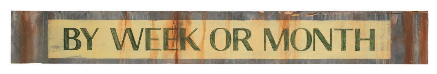 (Disney-MGM, 1989) A hand-painted prop hotel sign from the Gangster scene of the Great Movie Ride at Disney-MGM Studios. Immediately upon entering the Gangster scene, this "By Week or Month" sign is seen on a building to the left. Measuring 87"x11.25"x1", the sign is in good Park-used condition, with a 42" stress crack horizontally on its surface. long, and 4.5" deep, the distressed wooden sign displays in very good condition.