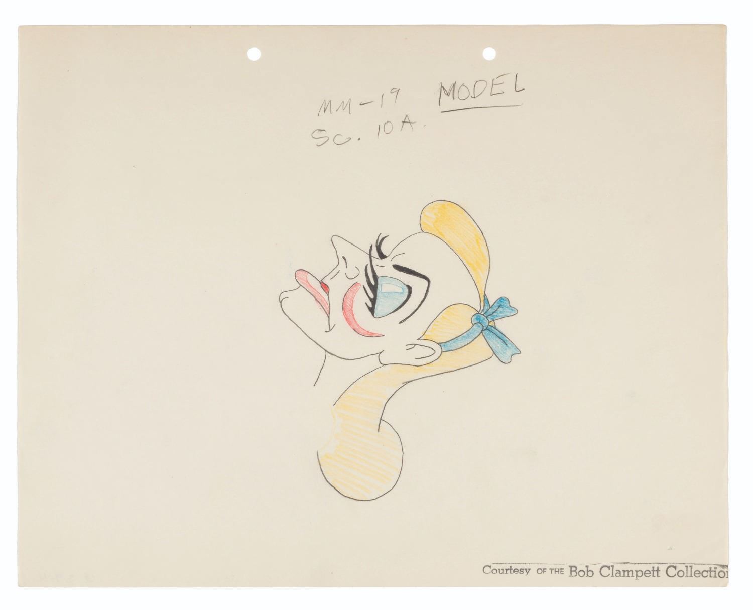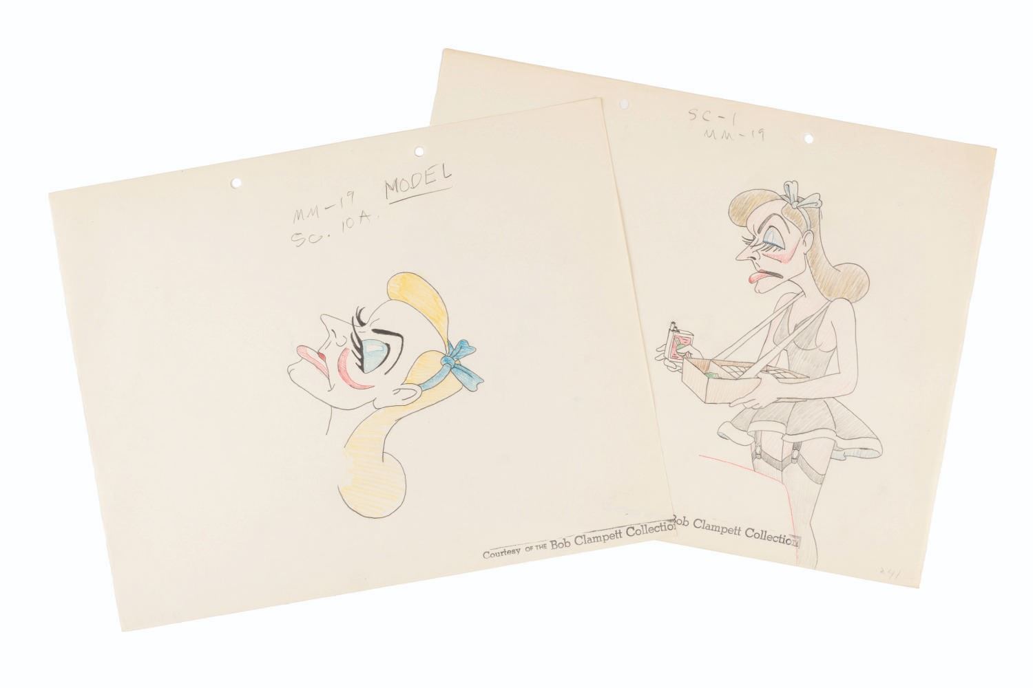 (Schlesinger, 1941) A production drawing and model drawing of Greta Garbo from the Merrie Melodies short, “Hollywood Steps Out.” Accomplished in graphite and colored pencil both drawings measure 9.5” x 12” with character image sizes of 7.5” x 5” and 5.25” x 4.25” respectively. The drawings are in good condition, stamped with “Courtesy of the Bob Clampett Collection,” with light creasing, edge wear, pinholes from production use, and light discoloration from age.
