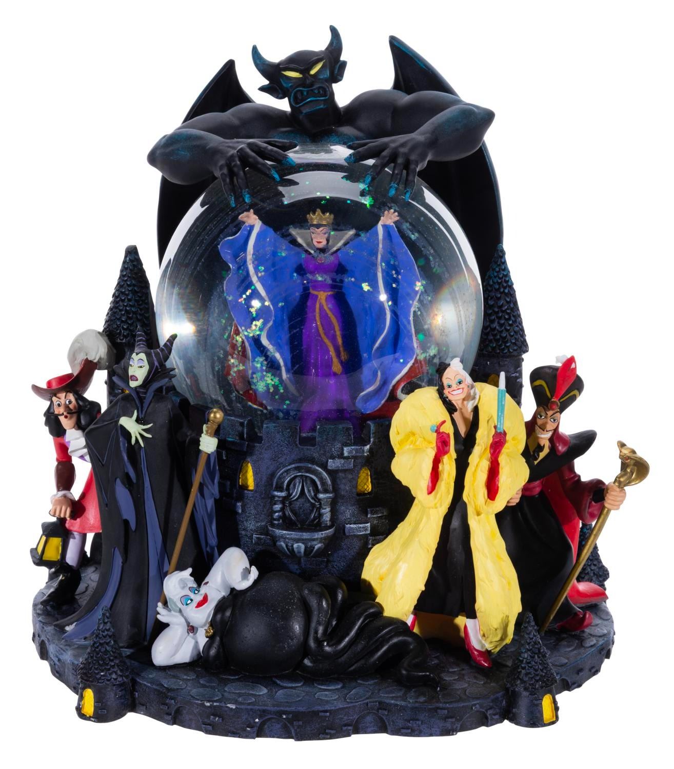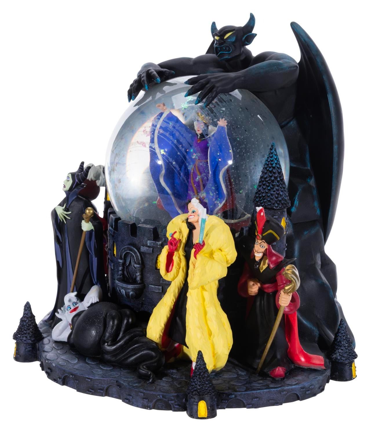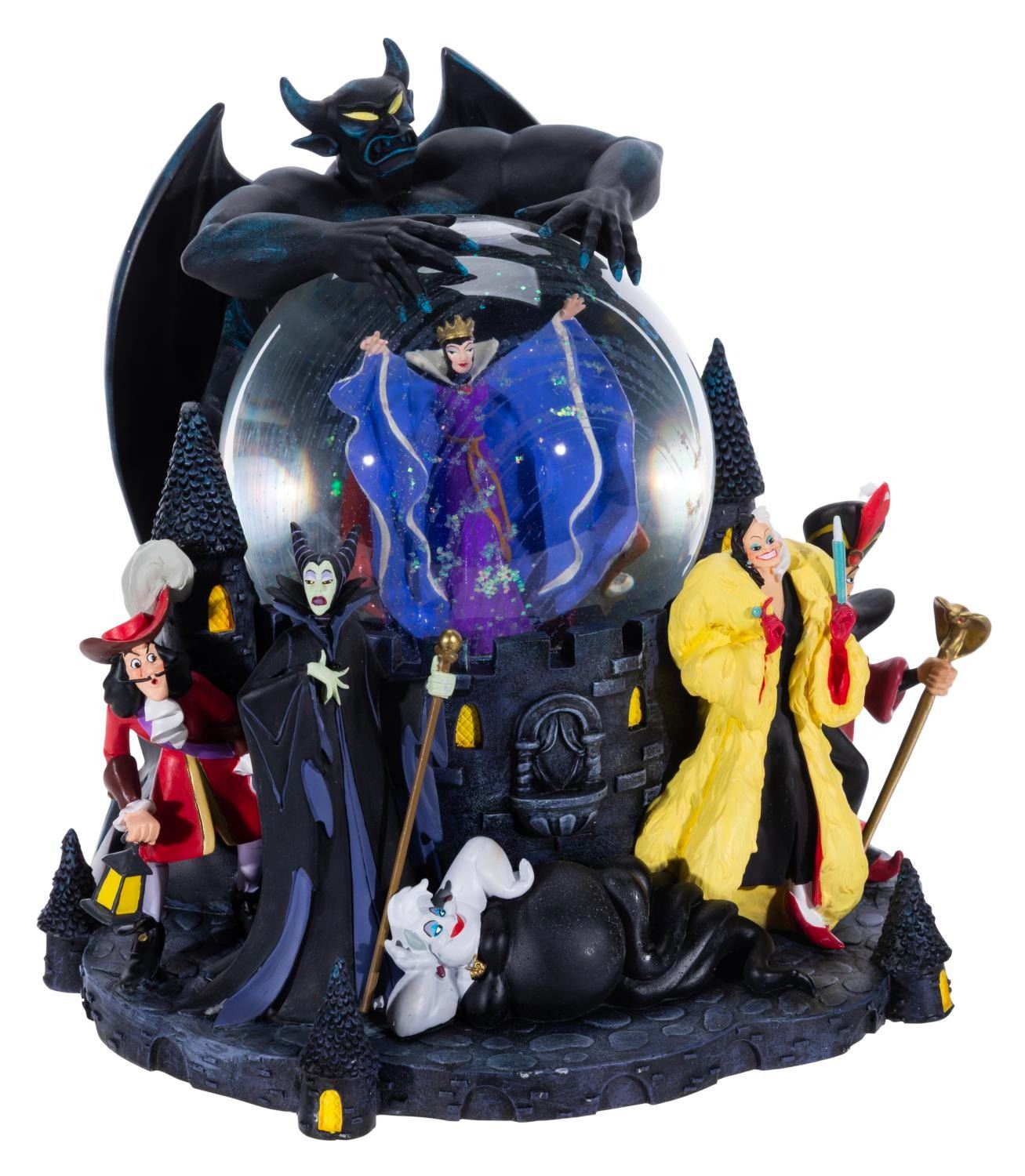 (Disney, 1990s) A musical snow globe of the many iconic Disney Villains, that when wound, plays the Haunted Mansion favourite "Grim Grinning Ghosts." Measuring 8" x 8.25" x 8.75" tall, the snow globe comes with its original box and is in very good condition with streaks in the globe and light wear.