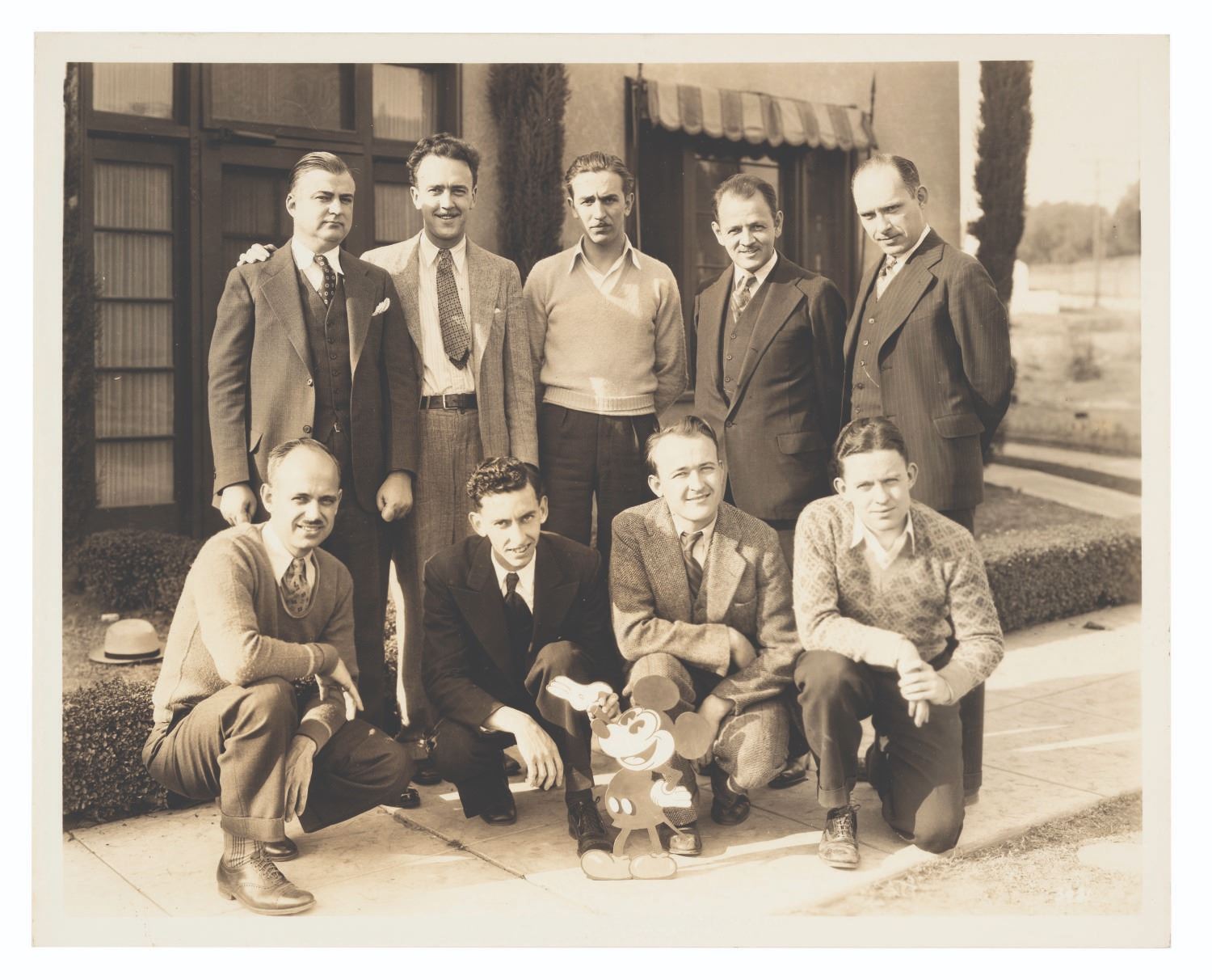 (Disney, 1930s) A rare very early print of a photo taken outside Disney’s Hyperion Studio featuring (standing) Jack King, Ub Iwerks, Walt Disney, Carl Stalling, Burt Gillett, (kneeling) Ben Sharpsteen, Dick Lundy, Merle Gibson, and Norm Ferguson. Measuring 8” x 10”, the print is in very good condition with light toning, and spots of black paper adhered to the back from being kept in an album.