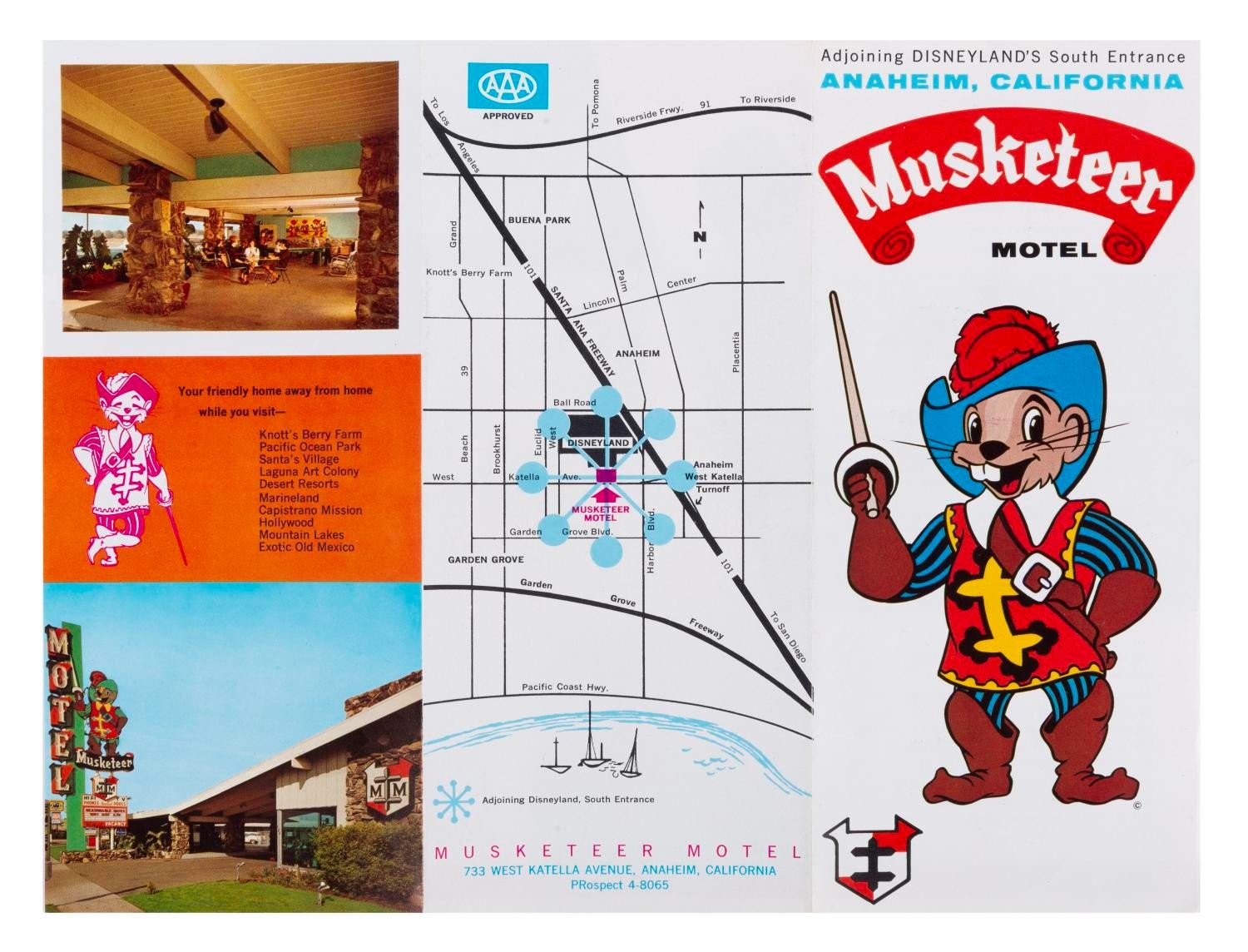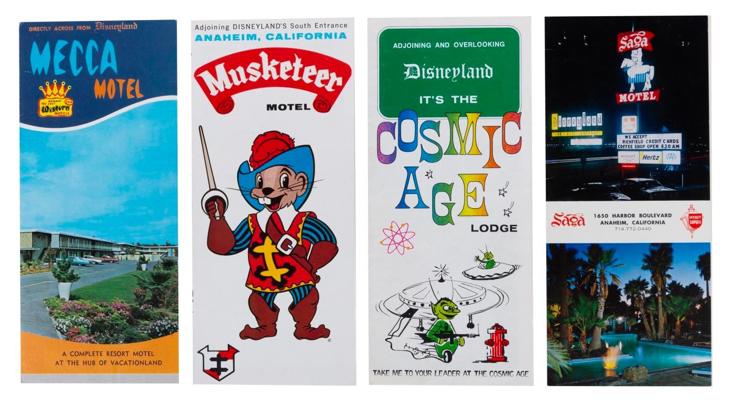 (Disneyland, 1950s-60s) A group of four motel brochures from the area near Disneyland. The brochures promote different motels around the Park's periphery and feature colorful photo images and illustrations of their luxurious accommodations. Measuring 4"x9", each brochure is in very good condition with creases and wear.