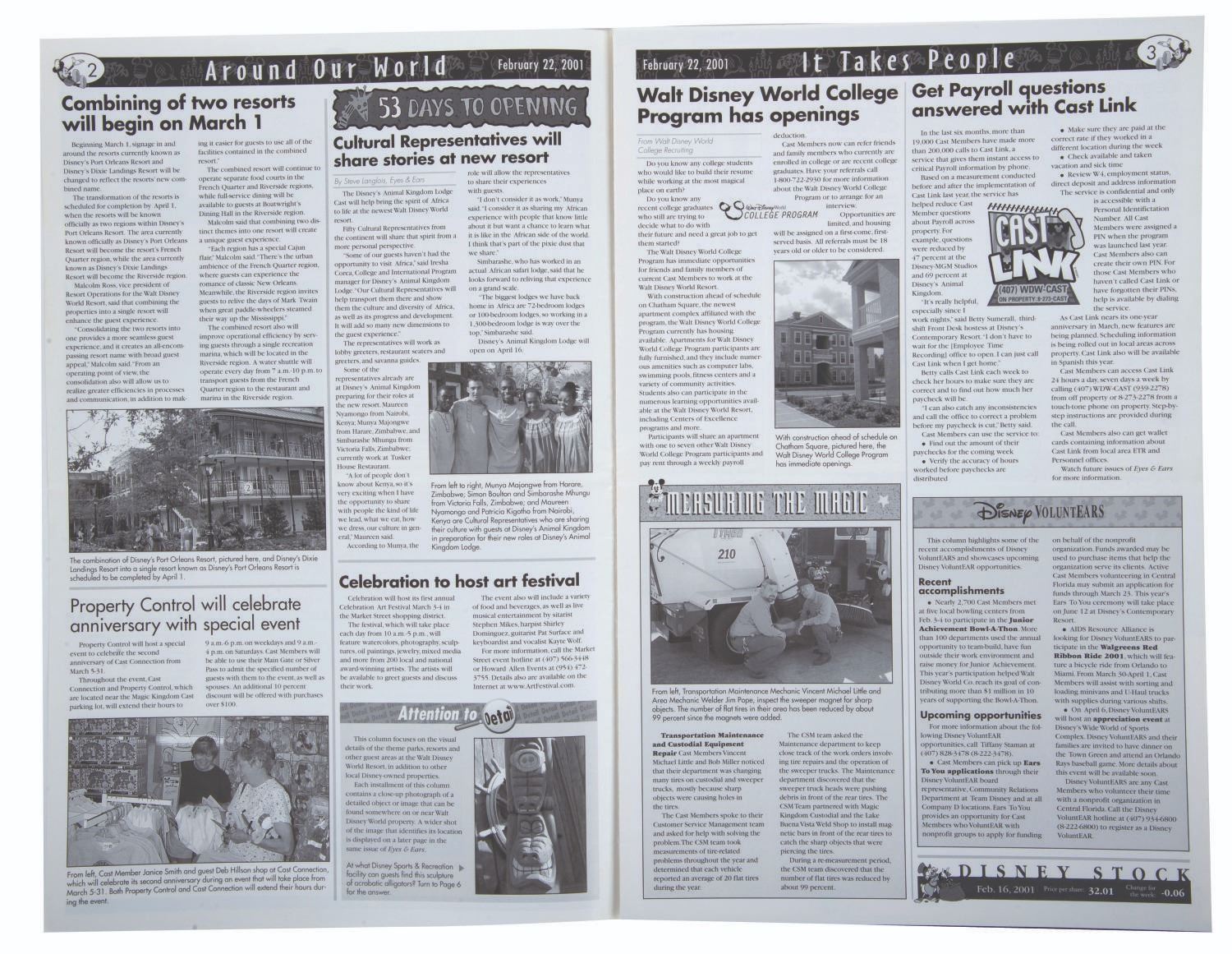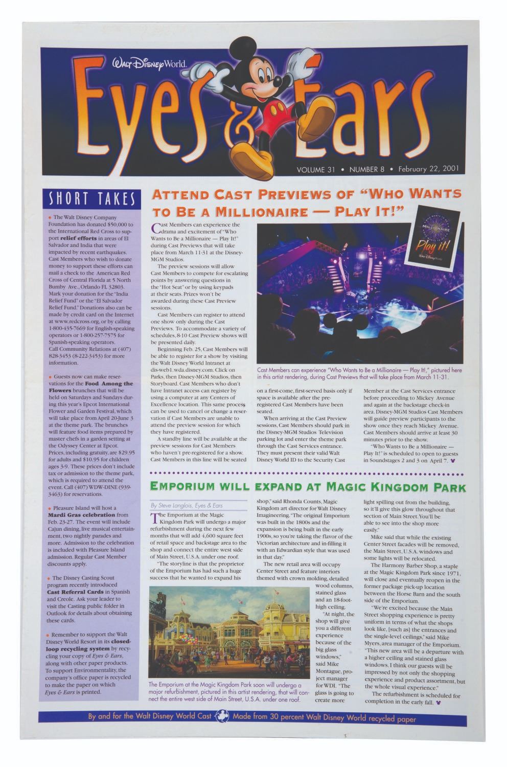 (Walt Disney World, 1995-2002) A collection of six Walt Disney World Eyes and Ears and Animal Kingdom newsletters. Highlights include articles on "Toy Story," "Treasure Planet," and Who Wants to Be a Millionaire - Play it! Measuring 11" x 17" each, the newsletters are in very good to fair condition with scratches, scuffs, creases, and wear.
