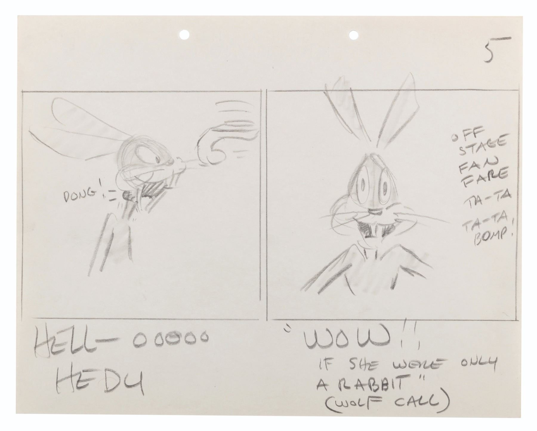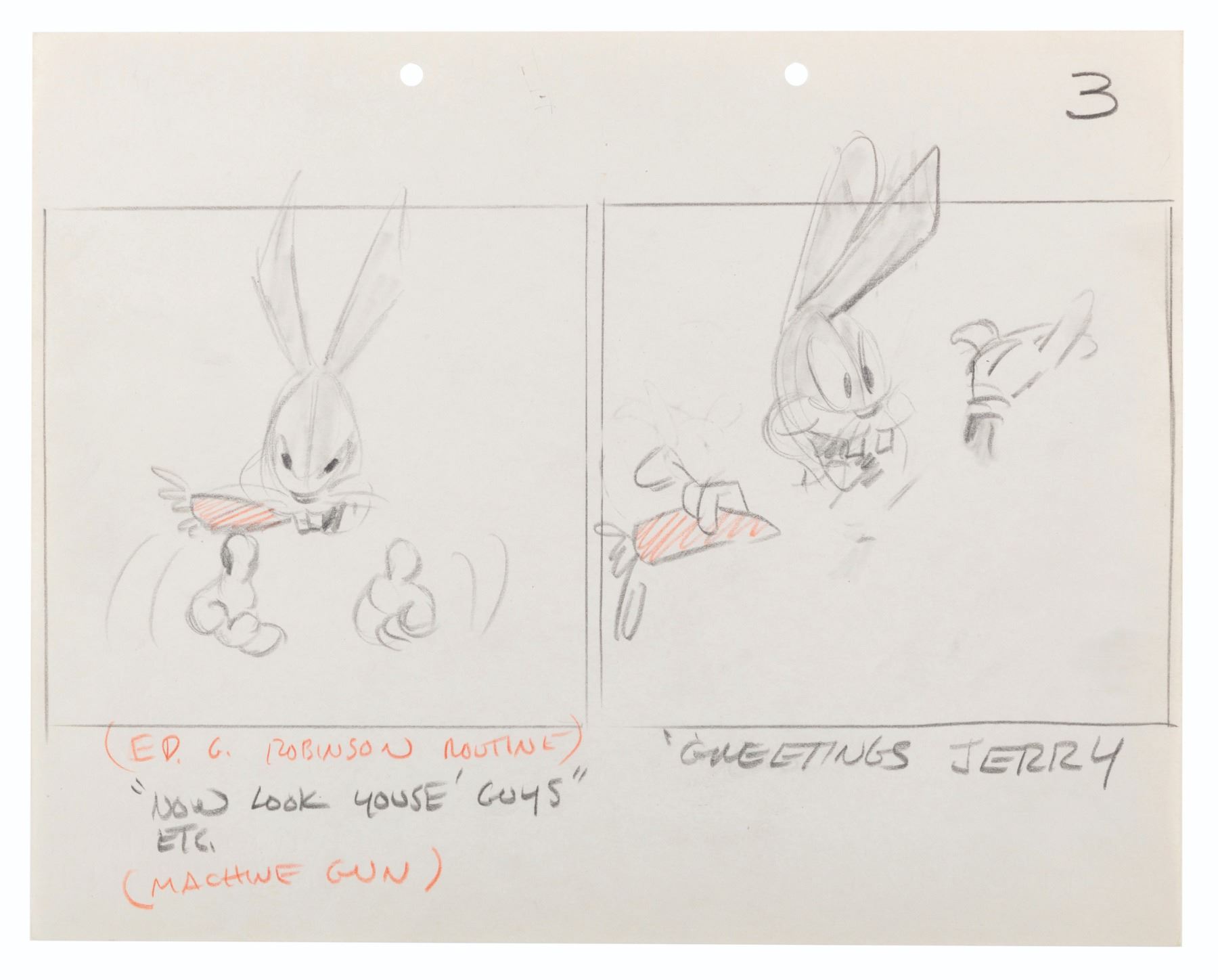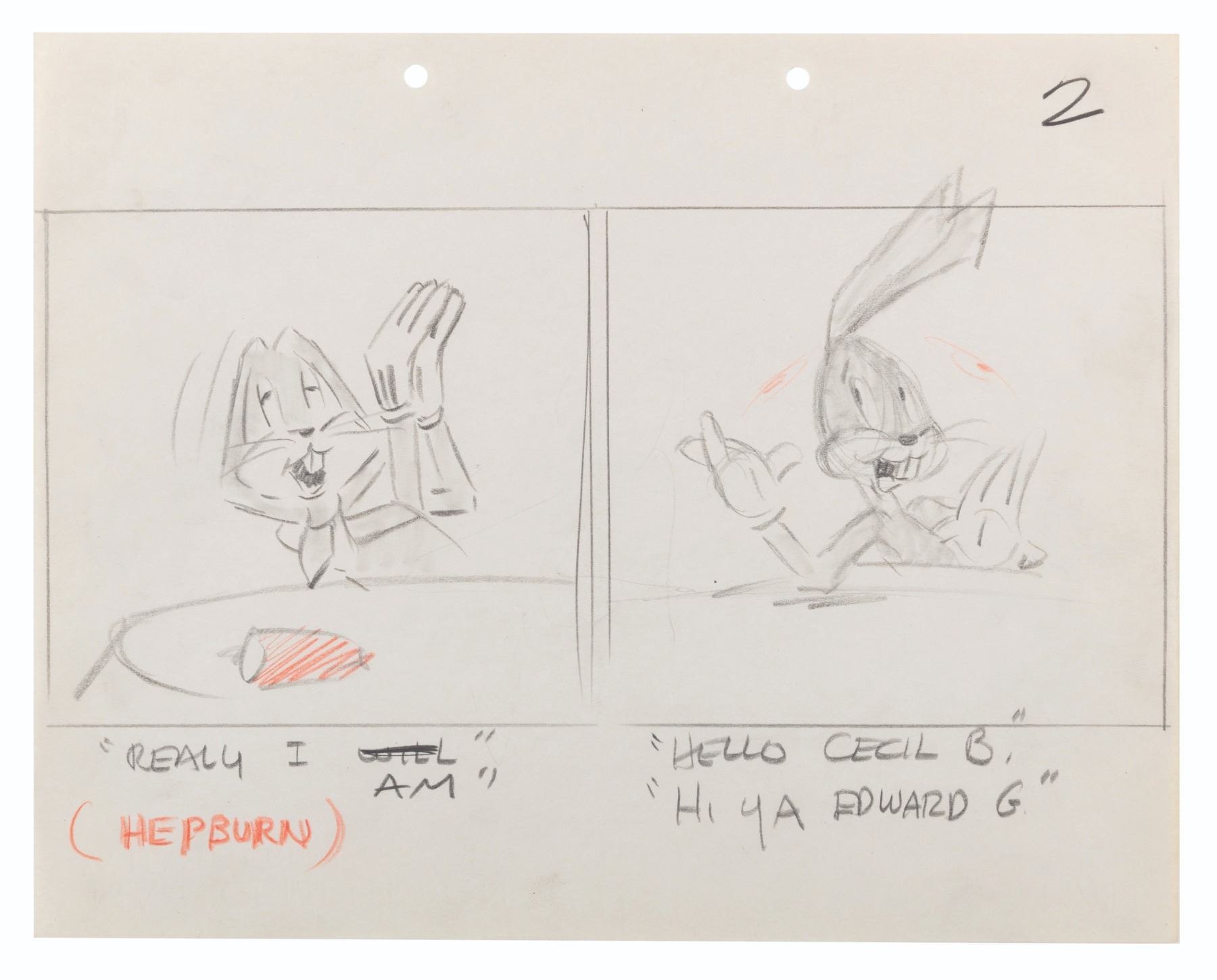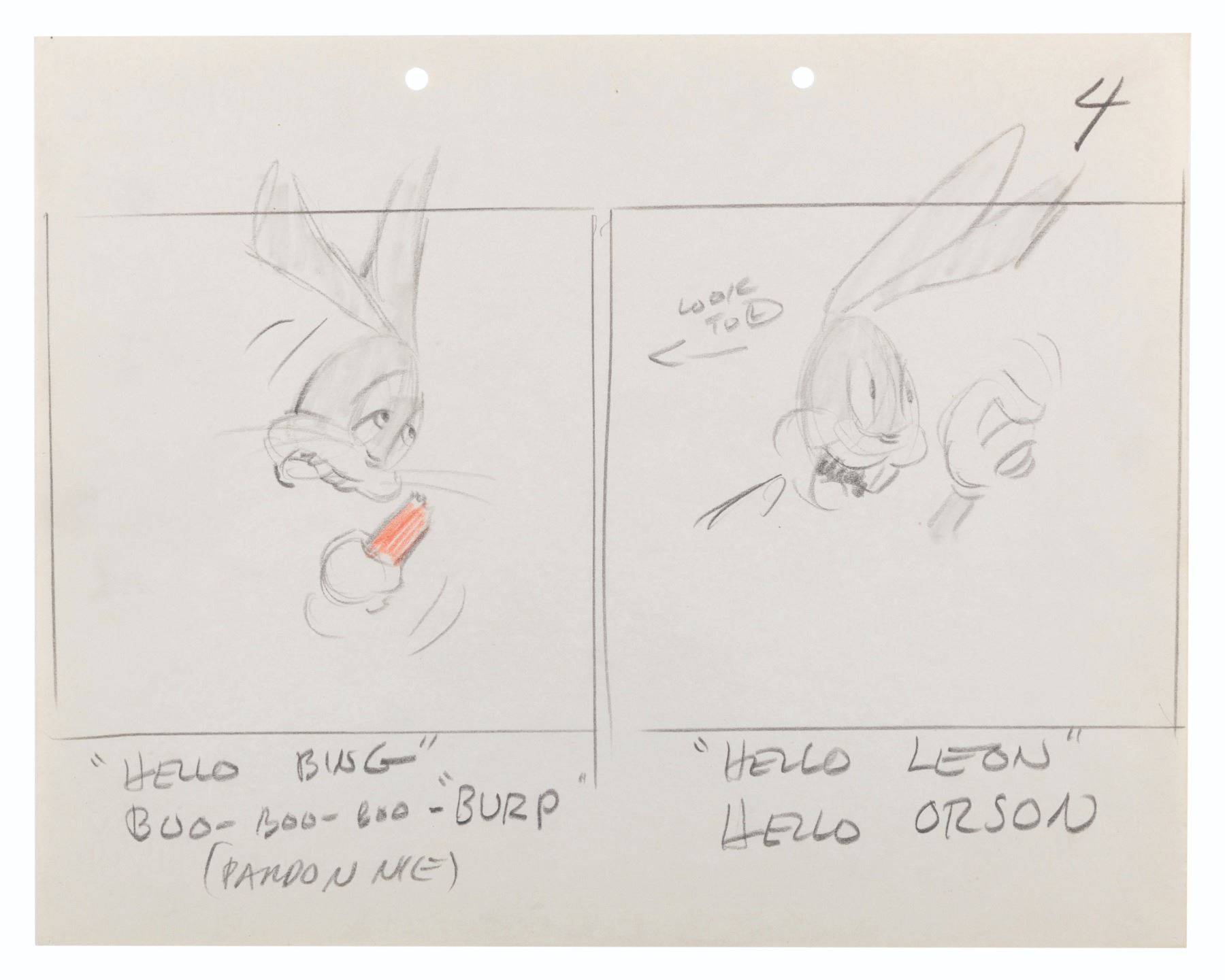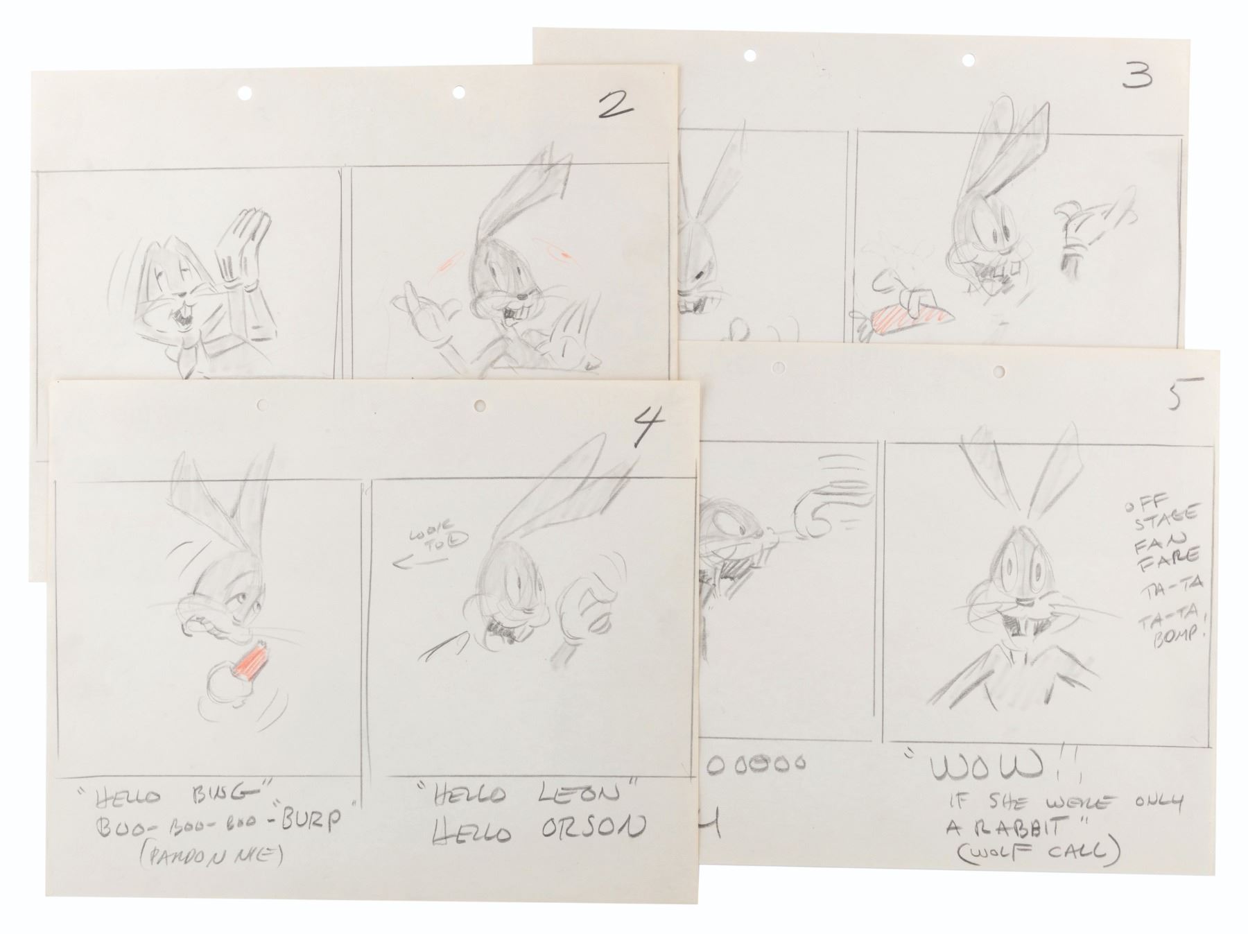 (Schlesinger, 1944) A group of four original storyboard drawings featuring Bugs Bunny from the Merrie Melodies short “What’s Cookin’ Doc?” directed by Bob Clampett. Accomplished in graphite and colored pencil, the drawings each measuring 9.5” x 12” are in very good condition with light edge wear and pin holes from production use and light discoloration from age.