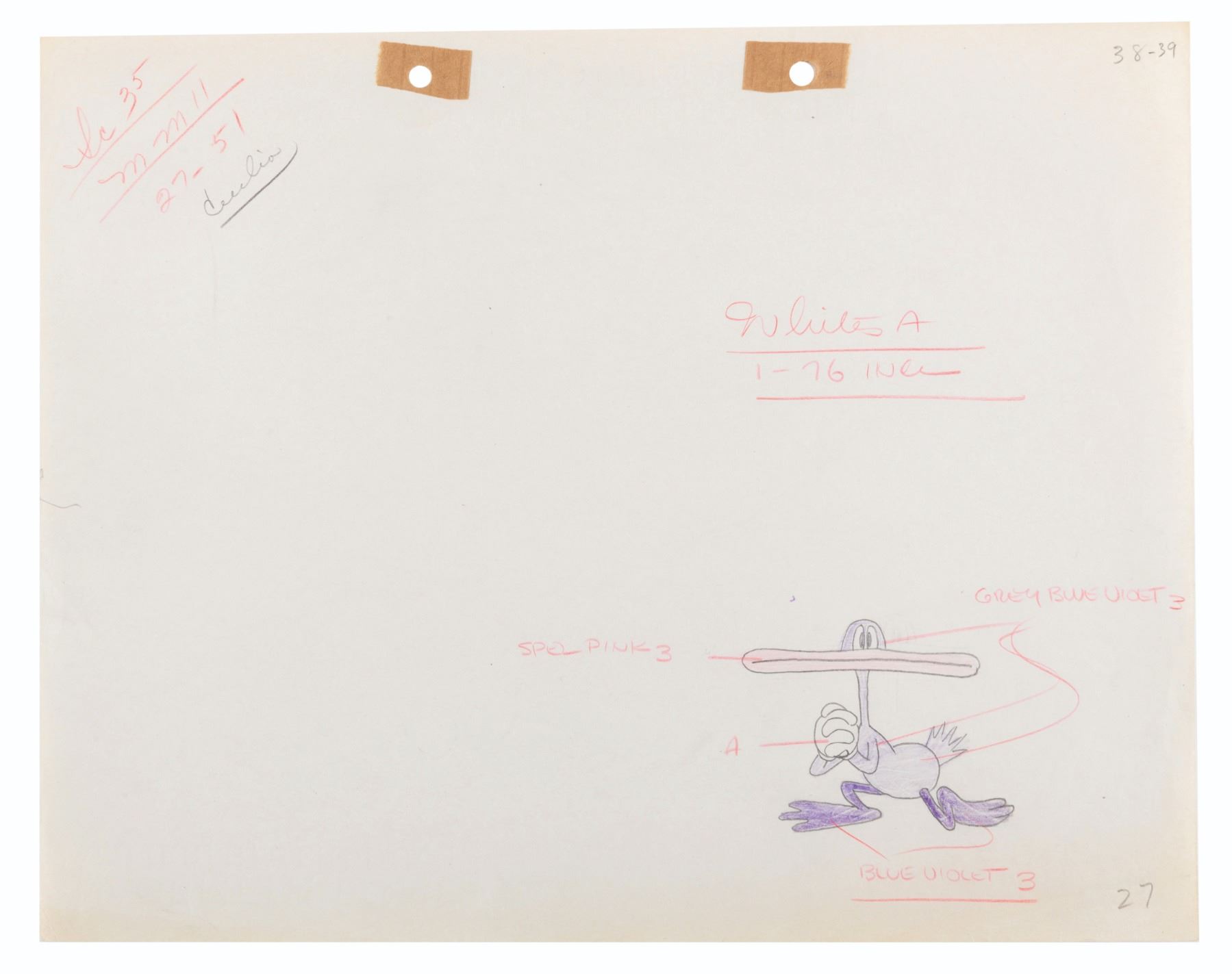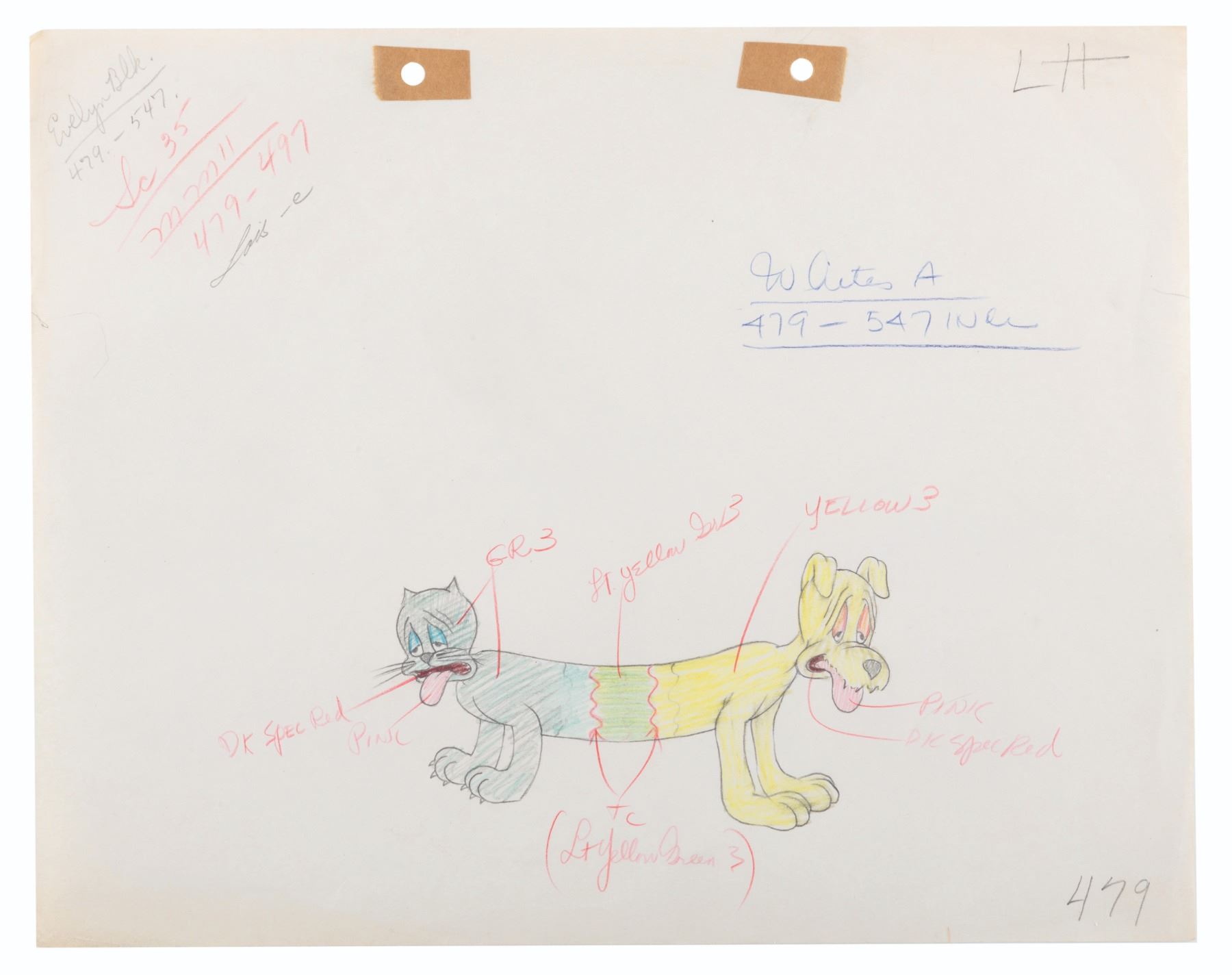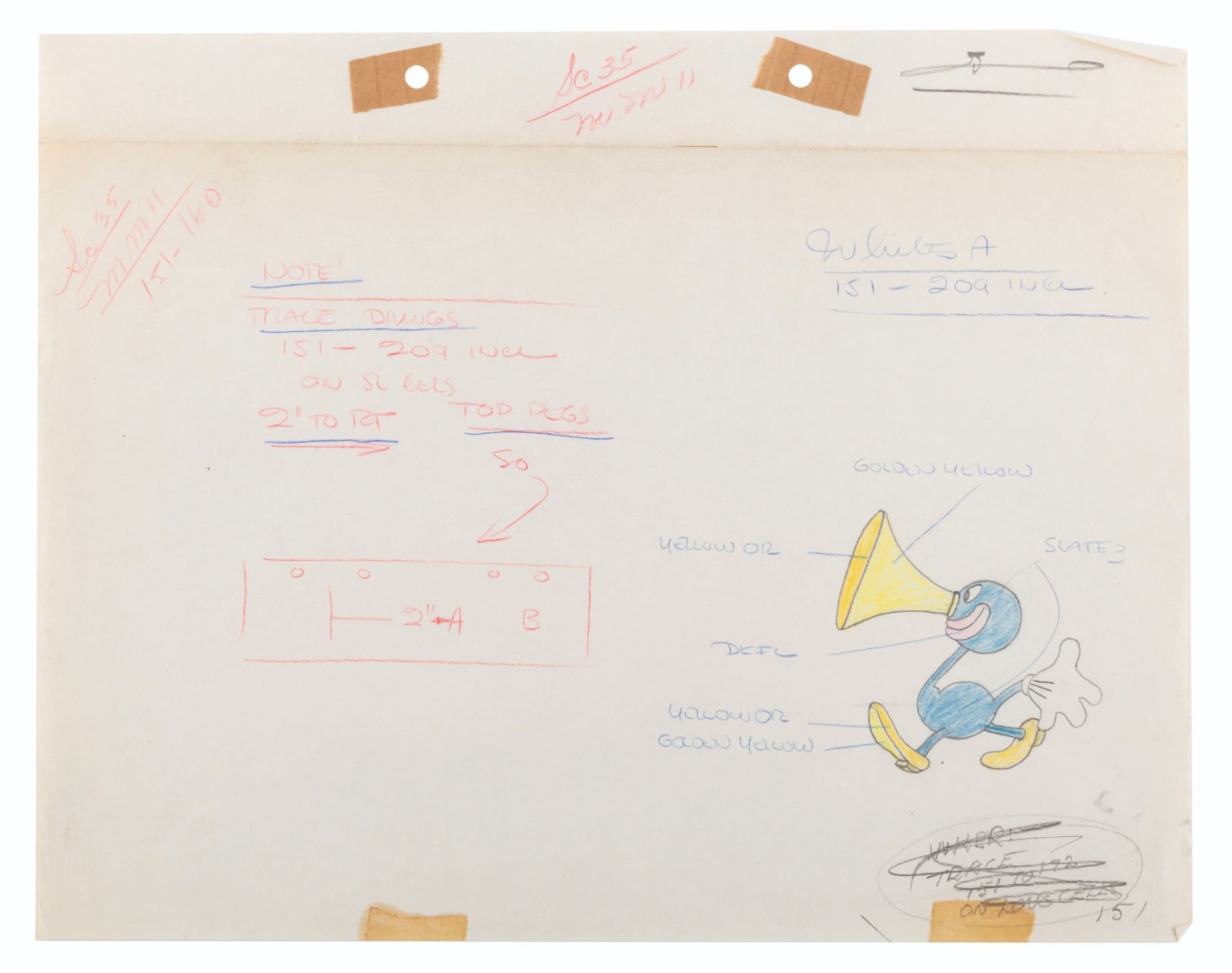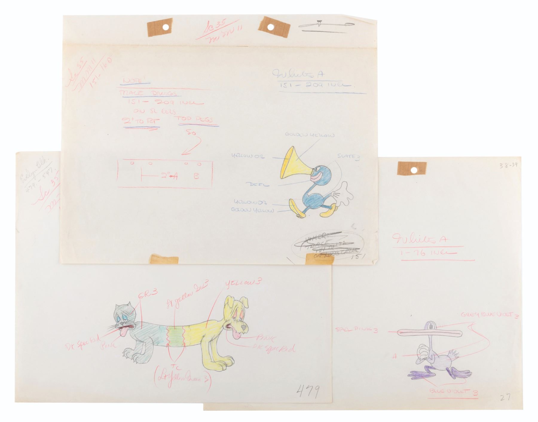 (Schlesinger, 1943) A group of three character concept drawings from the Merrie Melodies short “Tin Pan Alley Cats” directed by Bob Clampett. In this cartoon, which has the distinction of being one of the infamous "Censored 11”, Clampett revisited many of his wackiest and most surreal creations that had been seen five years earlier in “Porky in Wackyland.” Accomplished in graphite and colored pencil, the drawings measure 9.5” x 12” with character image sizes ranging from 2.75” x 2.75” to 5.25” x 3” and are in good condition with light edge wear and creasing from production use, one with a horizontal fold 1” from the top which does not affect the image, and light discoloration from age.