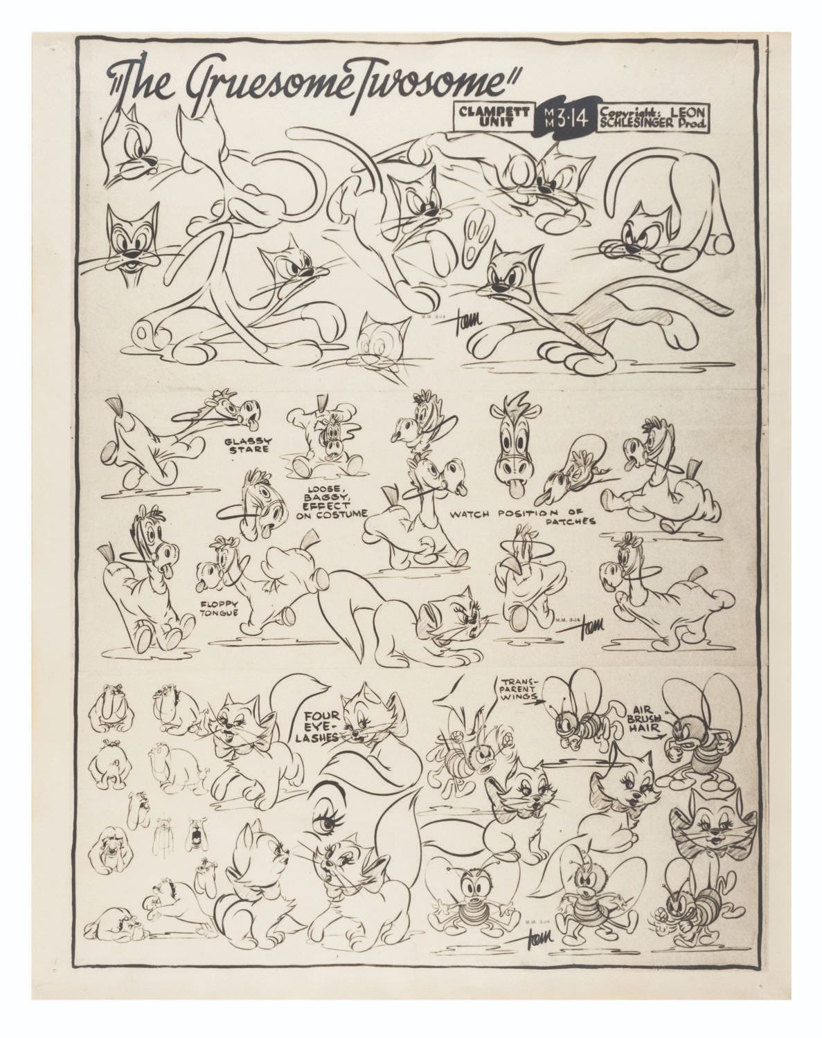 (Warner Bros., 1945) A photostat model sheet of secondary characters from the Merrie Melodies cartoon “A Gruesome Twosome.” This was the last cartoon featuring Tweety Bird to be directed by Bob Clampett. Model sheets such as these were distributed to animators and crew working on the film to ensure character design continuity. Measuring 11” x 14”, the model sheet is in very good condition with light wear from production use including pinholes at the corners, slight waviness, and a 0.5” hairline crack near the upper left corner.
