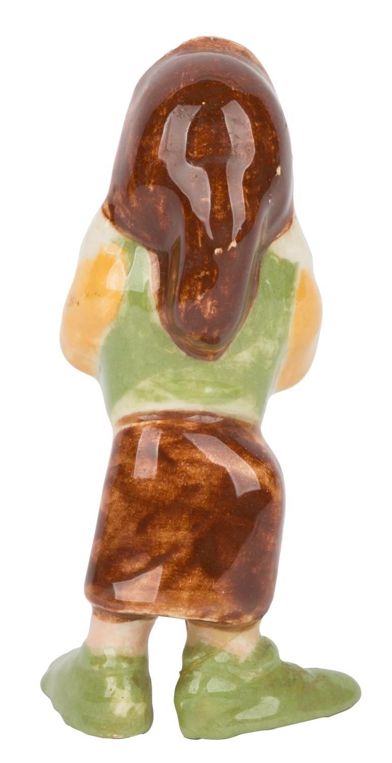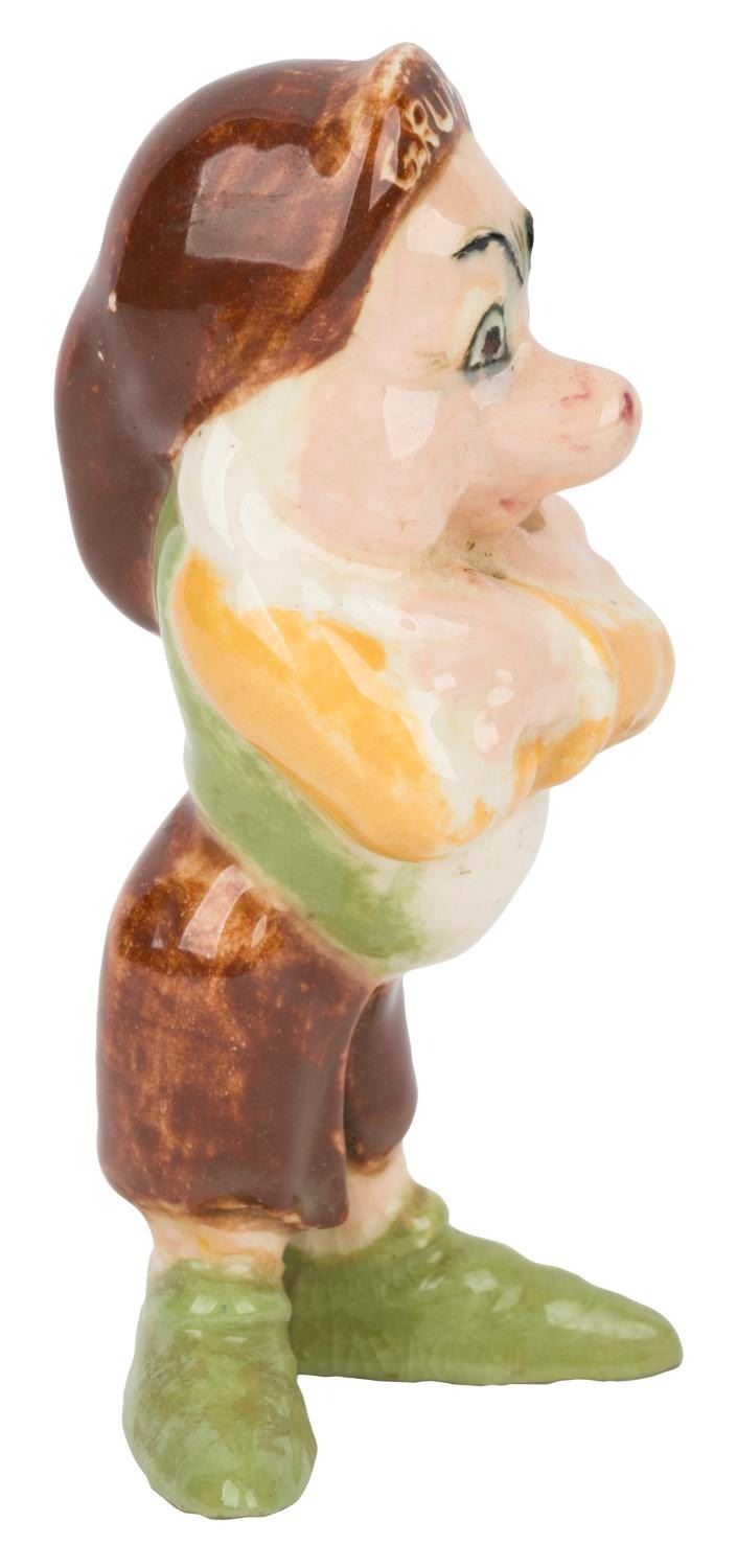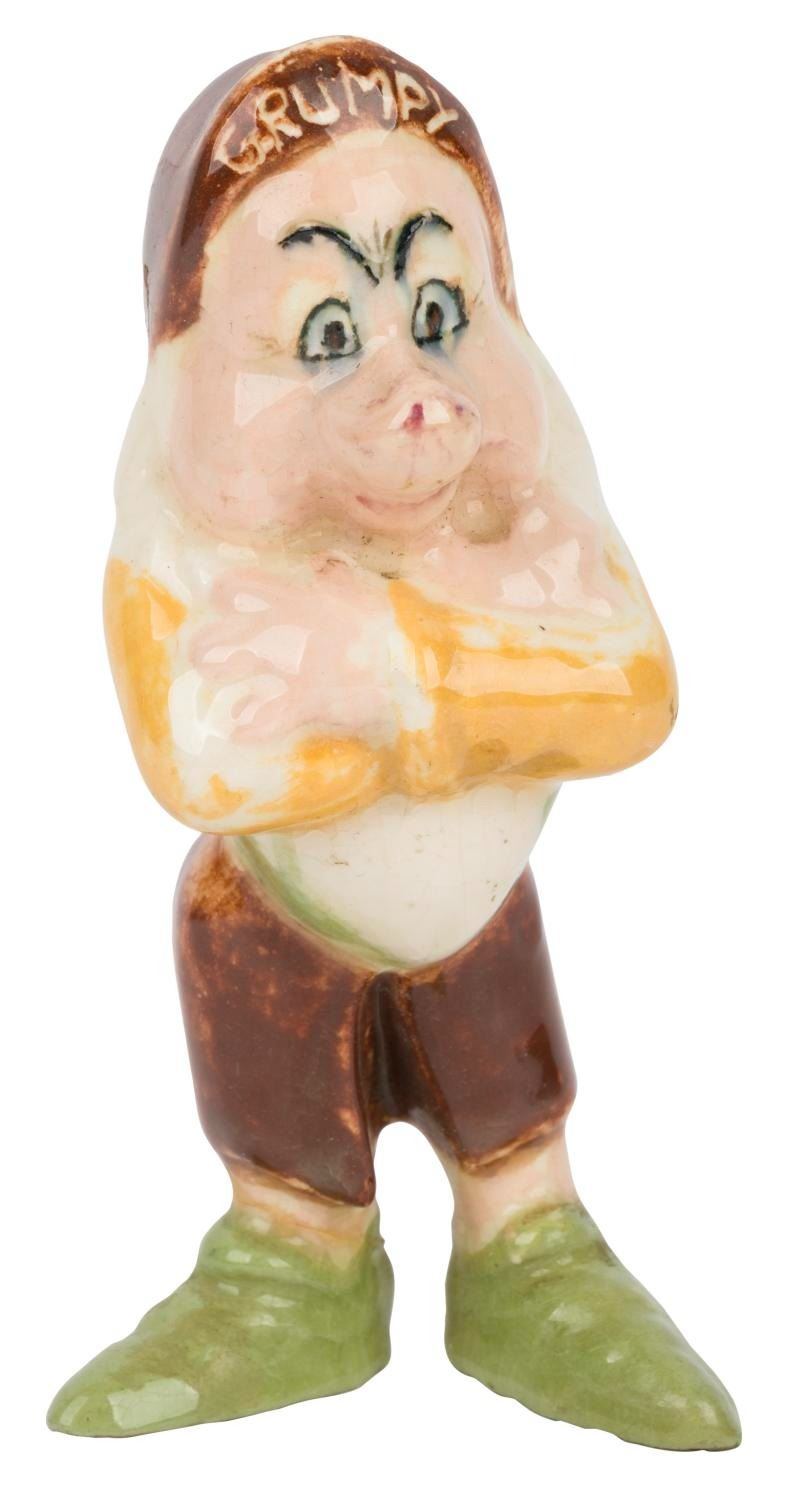 (1930s) A hand-painted ceramic figure of Grumpy from "Snow White and the Seven Dwarfs." Measuring 5" tall, Grumpy is in good condition with soiling and crazing.