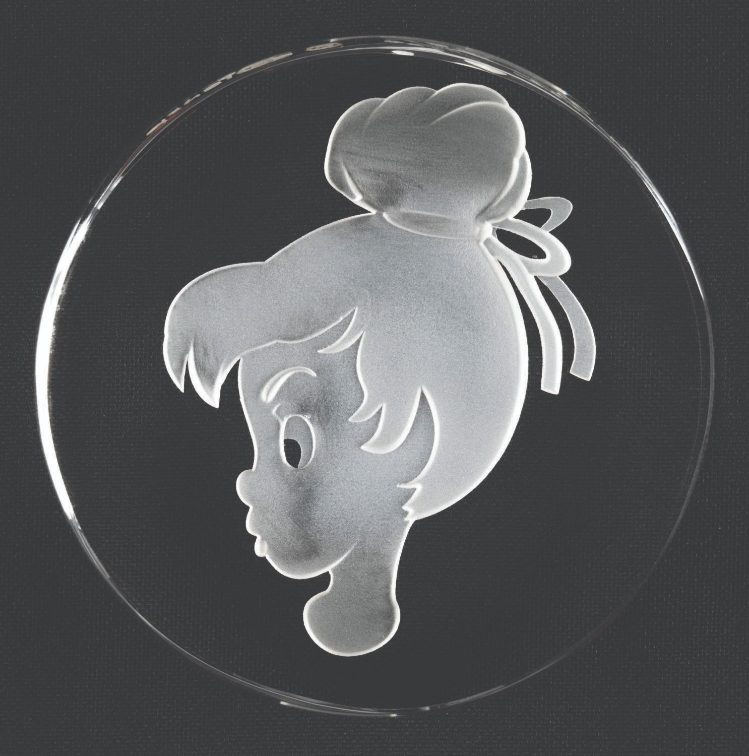 (Disney, 2000s) A Tinker Bell Guenther decorative glass paperweight, with a Guenther signature and a Disney logo etched on the side. Measuring 3" in diameter, this limited edition paperweight numbered 24/100 is in fine condition.