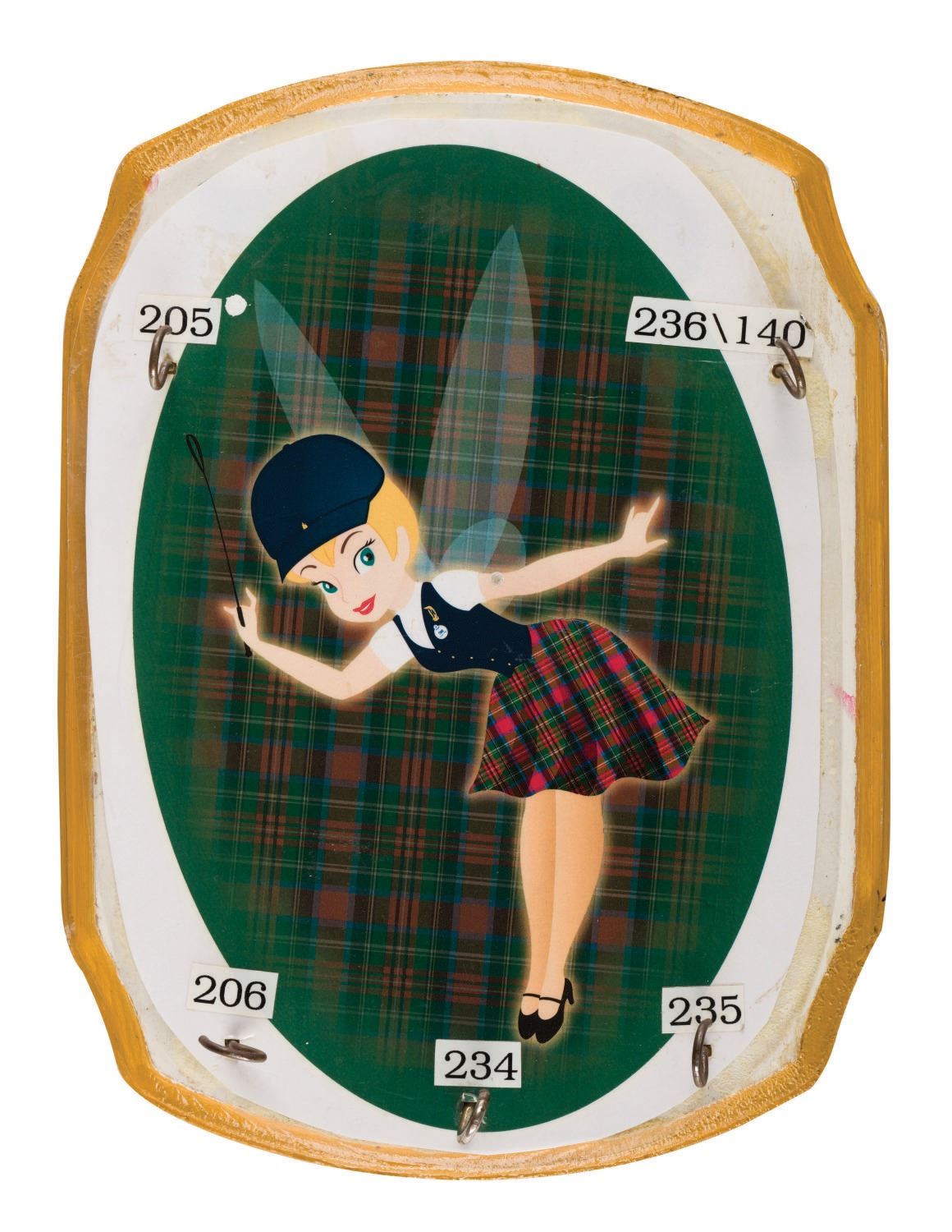 (Disneyland, 2000s) A Guided Tours Key Holder Plaque. The wooden key holder plaque features imagery of Tinker Bell dressed in a modern Disneyland Guest Relations & Guided Tour Hostess costume. The board was used backstage by tour guides at the park. The laminated imagery has been mounted with adhesive and five metallic hanger hooks are screwed into the board with numerical designations. The laminated portion has partially loosened from the board and a hand-painted Tinker Bell dressed in the original red and plaid Guided Tours costume can be seen underneath. Measuring 8.5"x11.5", the piece is in good Park-used condition with scuffs, scratches and wear throughout.