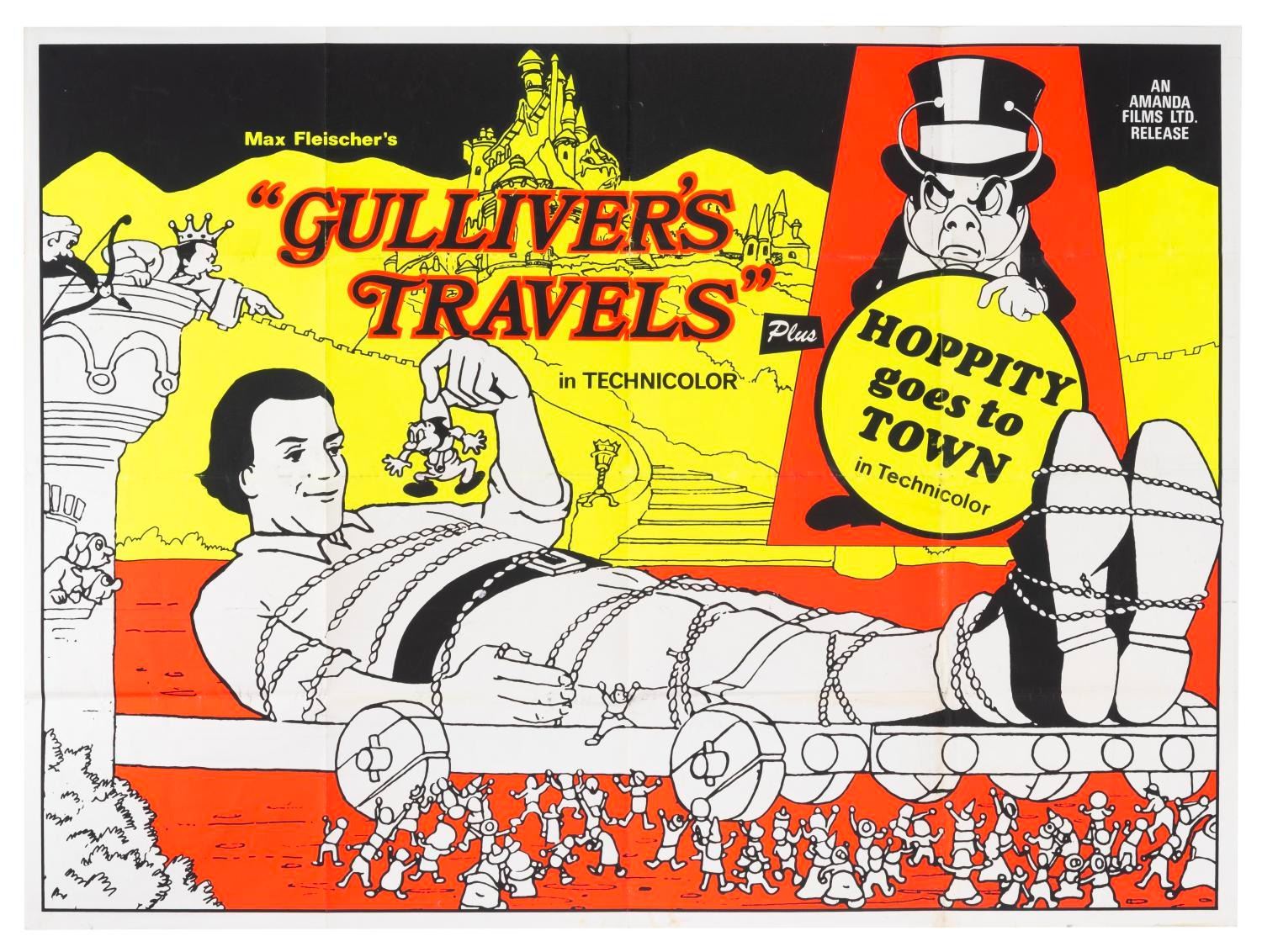 (Amanda Films LTD., 1950s) A British quad poster for the double-bill 1950s re-release of Max Fleischer's "Gulliver’s Travels " with "Hoppity Goes to Town. " Measuring 29.5 " x 40.25 ", the poster displays in very good condition with spots of discoloration, stains, wear along the original folds, and pencil inscriptions on the reverse.
