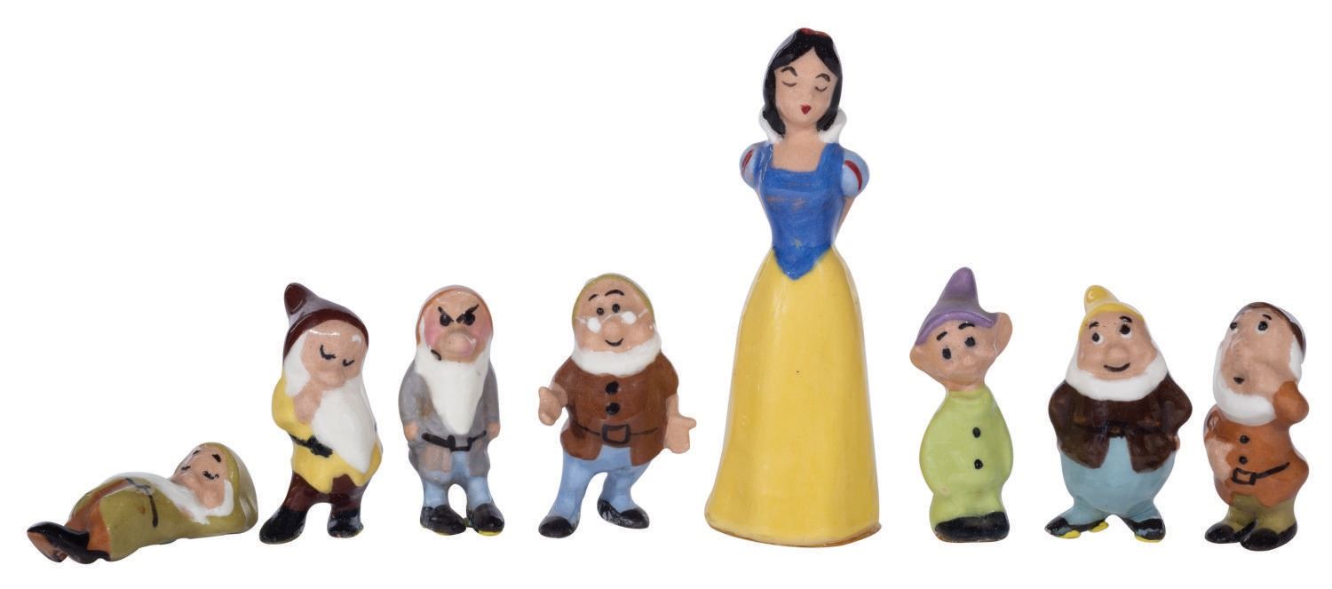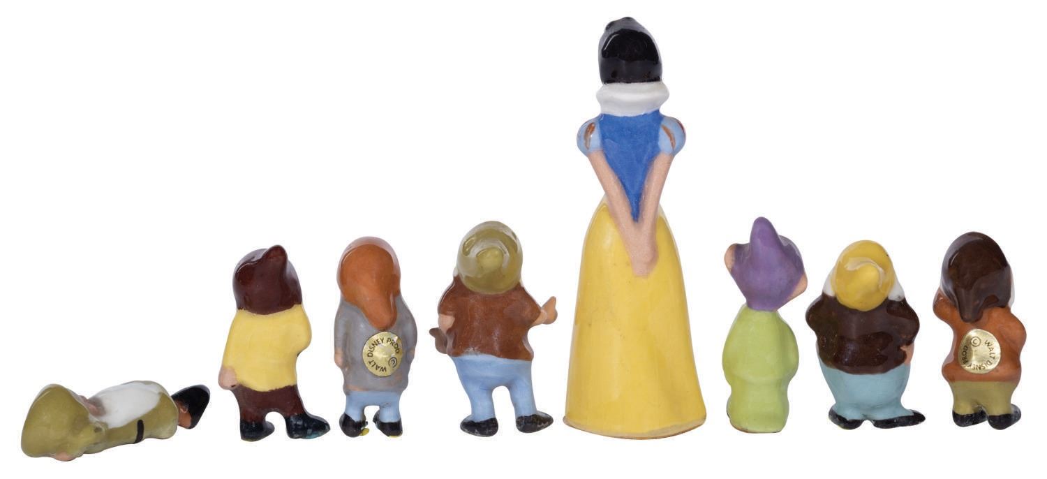(Hagen-Renaker, 1950s) A rare set of eight ceramic figurines of Snow White and the Seven Dwarfs by Hagen-Renaker. The figurines measure from 1" to 2.25" tall. Each is in fine condition. Sneezy and Grumpy retain their original Hagen-Renaker Label.