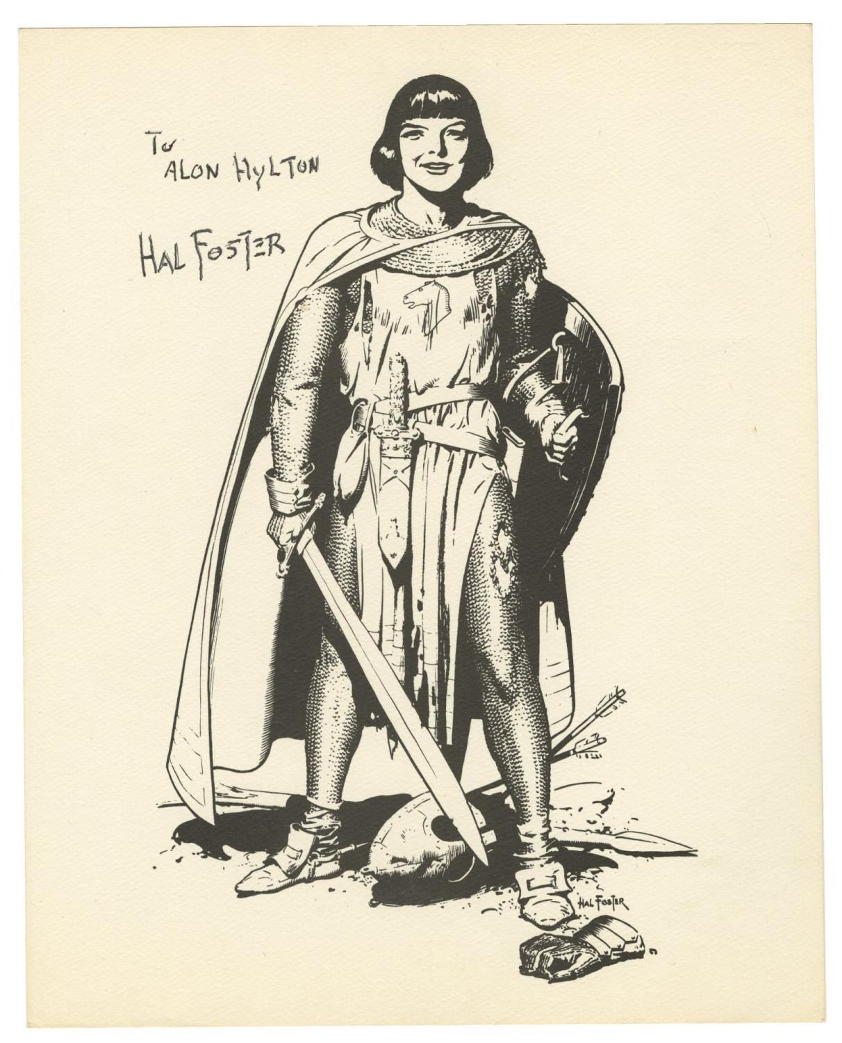 (King Features, 1980s) A printed fan card featuring imagery of "Prince Valiant" from Hal Foster's classic comic strip series. Foster created the series in 1937 and continued to work on it until the early 1980s. The card is hand-signed "To Alan Hylton" with Hal Foster's signature in the top-left corner. The card measures 10"x8" and the condition is very good overall with minor edge-wear.