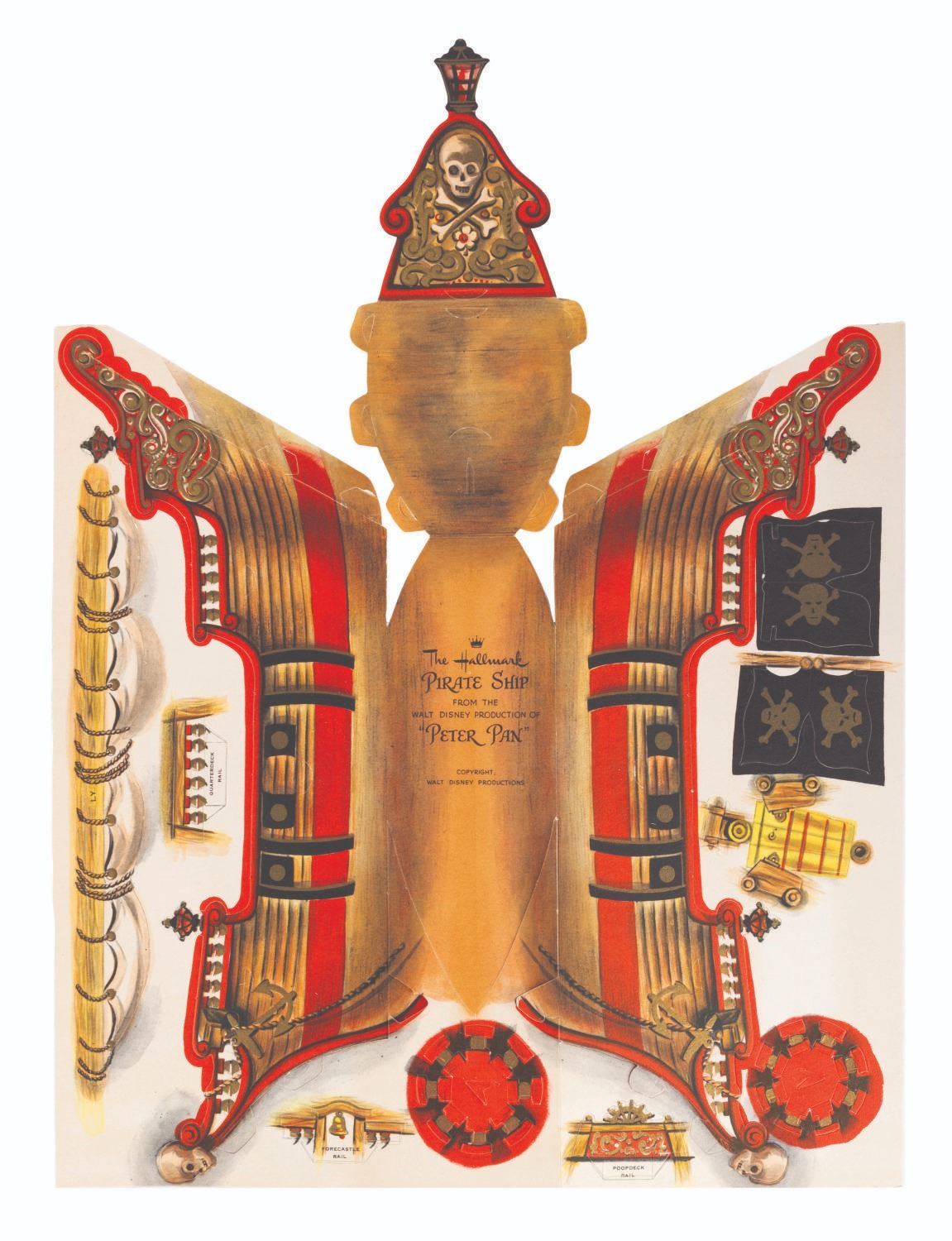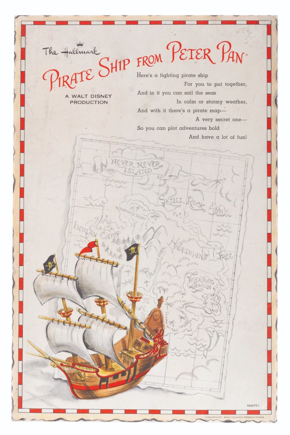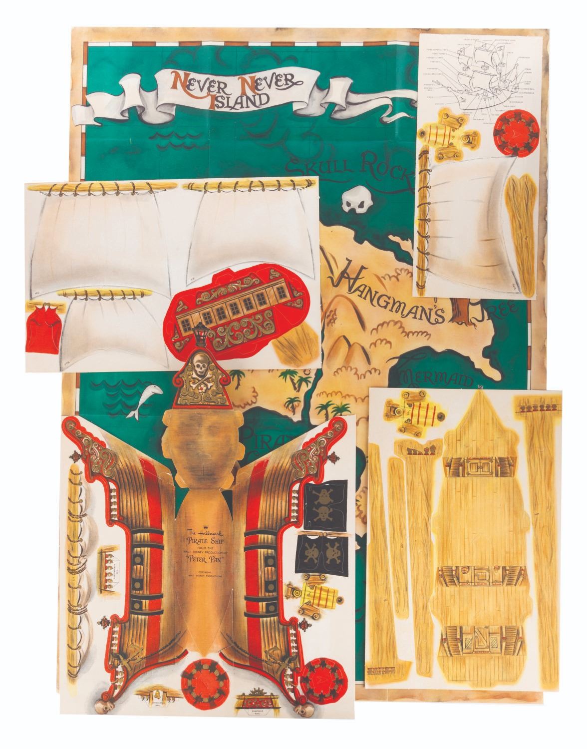 (Hallmark, 1960s) A colorful punch-out model kit by Hallmark of the pirate ship from "Peter Pan," as well as a large map of Never Land. Measuring 8.5" x 13" in the envelope, the unpunched model is in fine condition with slight discoloration from age. The outer envelope is in good condition with wear from handling and age, scuffs, and a pencil notation on the front.