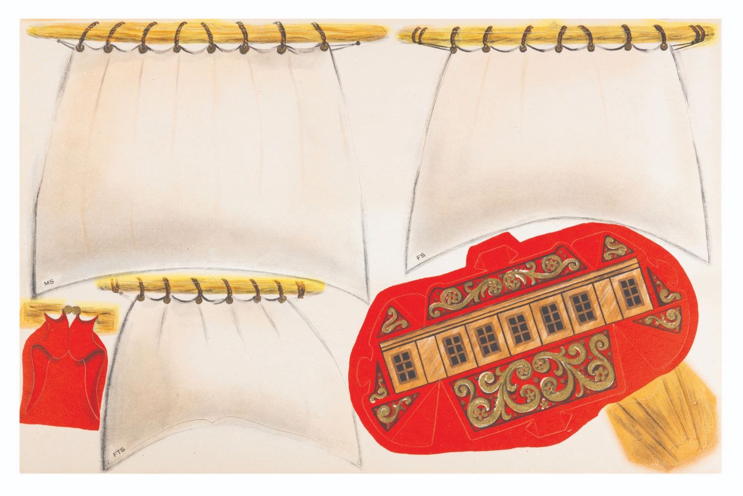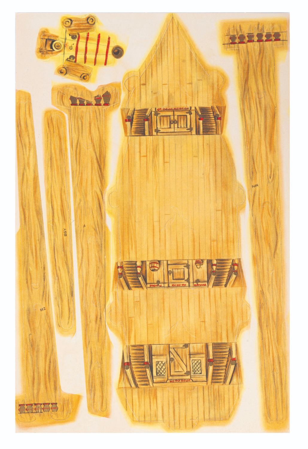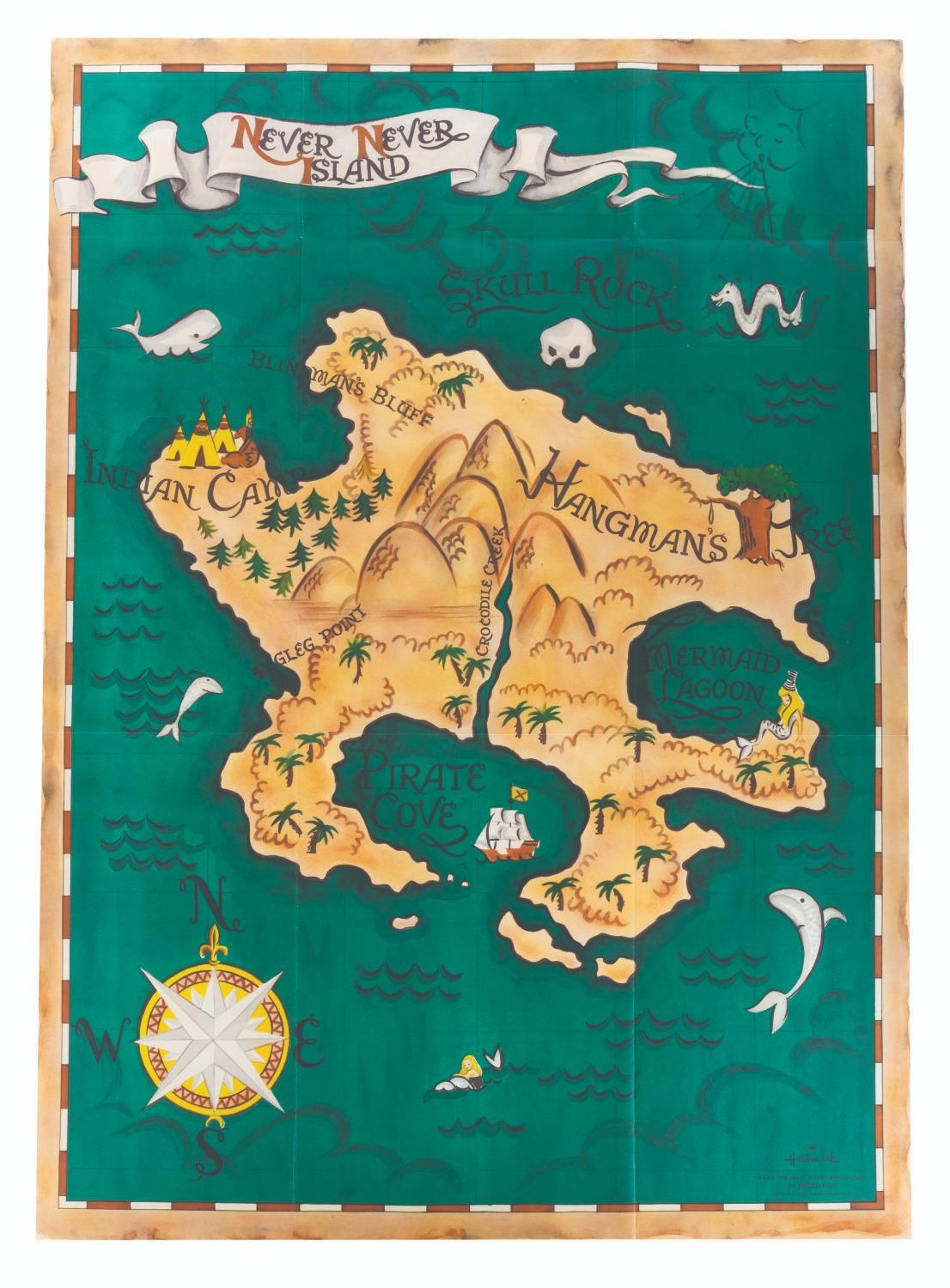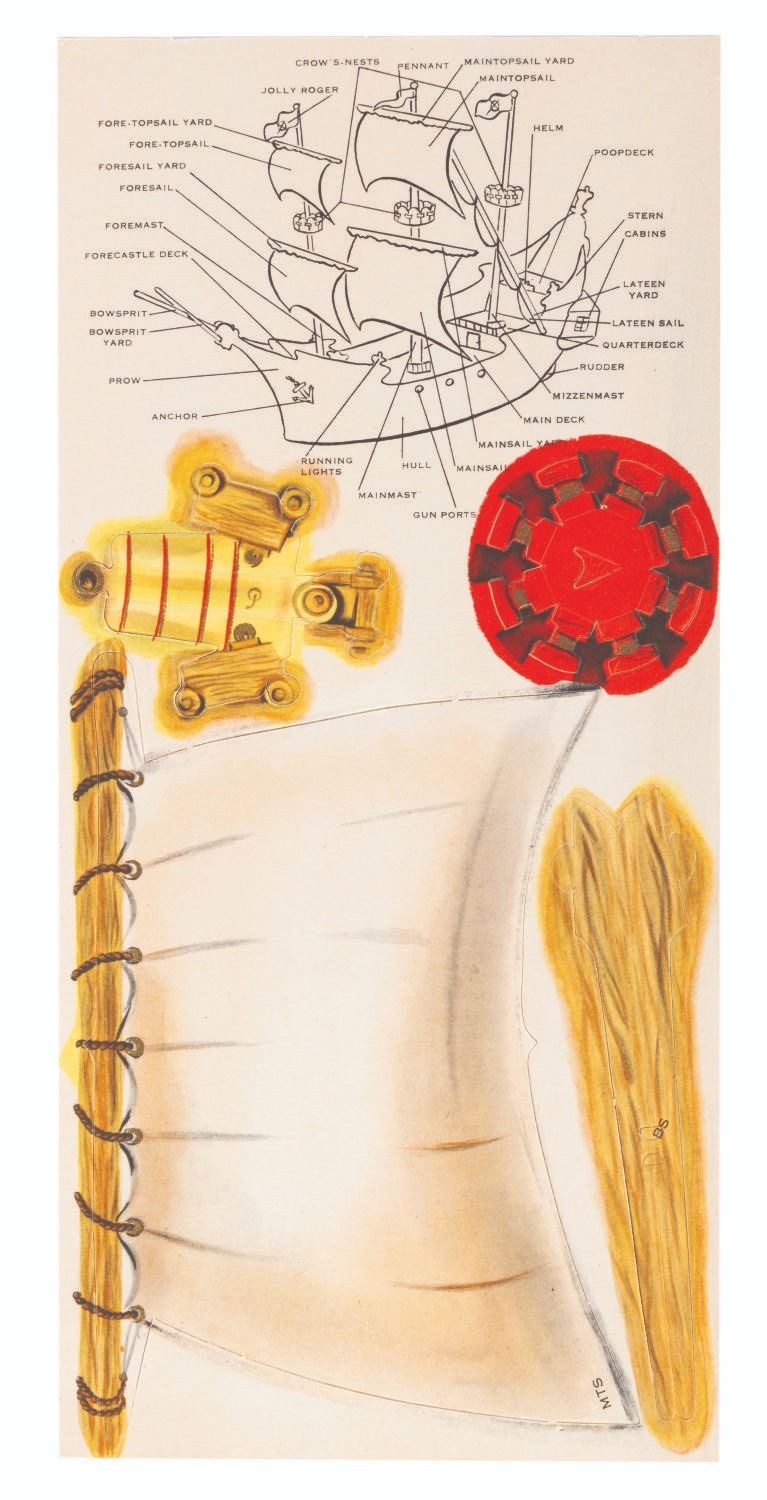 (Hallmark, 1960s) A colorful punch-out model kit by Hallmark of the pirate ship from "Peter Pan," as well as a large map of Never Land. Measuring 8.5" x 13" in the envelope, the unpunched model is in fine condition with slight discoloration from age. The outer envelope is in good condition with wear from handling and age, scuffs, and a pencil notation on the front.