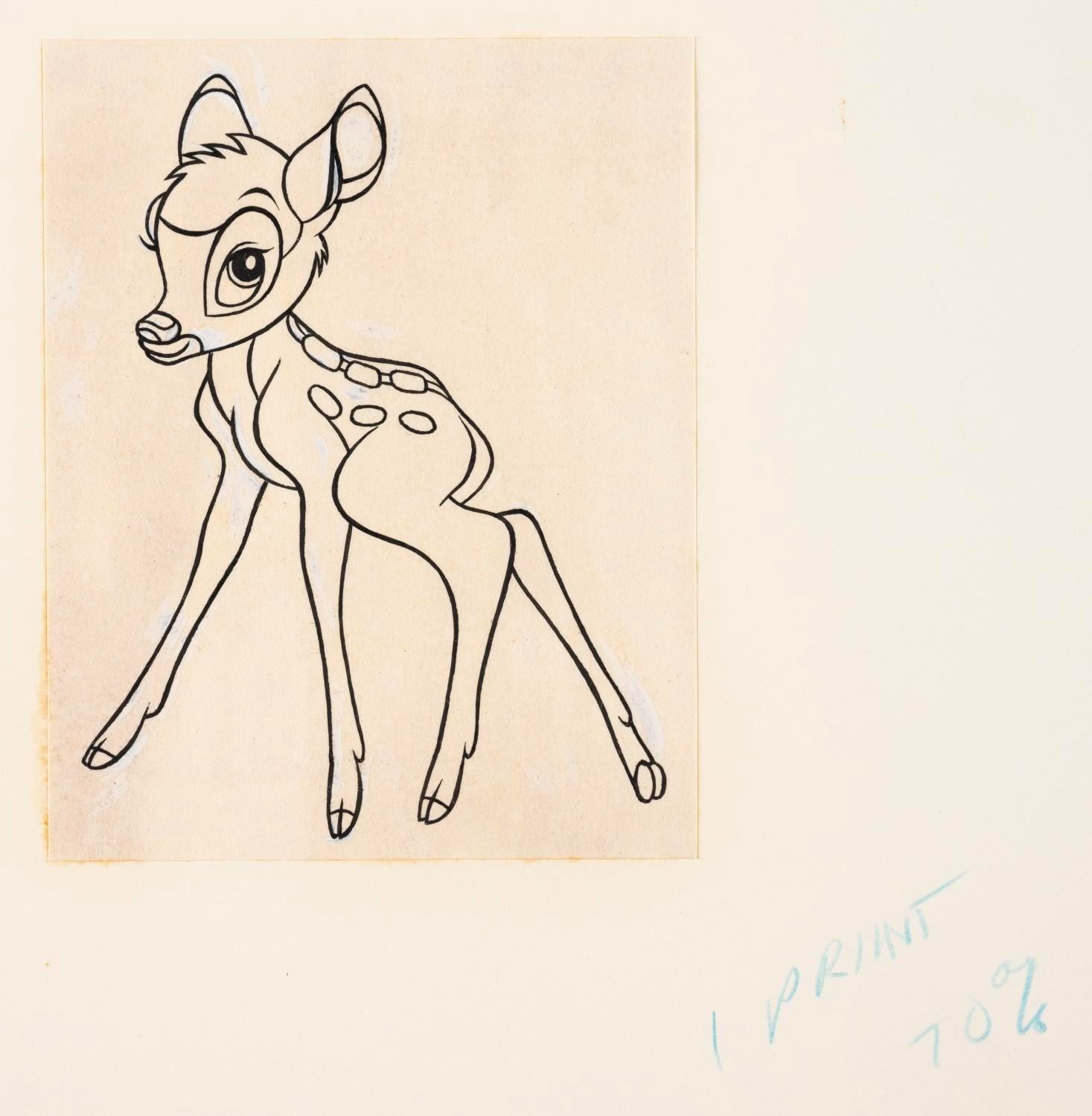 (Disney, 1980s-2000s) An original hand-drawn illustration of Bambi, likely created for promotional or merchandising purposes. Measuring 2.75” x 3.5” on drawing paper adhered to 7.75” x 10.5” artist’s board, the ink and graphite drawing is in very good condition with light discoloration and wear from production use, while the vellum cover is missing a 1.5” x 4.75” section at the bottom left.