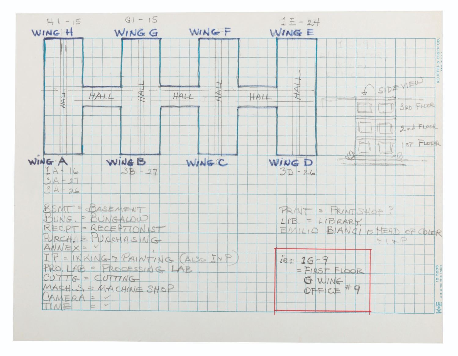 (Disney, 1978) A hand-drawn layout map of the Walt Disney Studios Animation Building by John Niendorff, who worked in the animation department on films including “Make Mine Music” and “The Three Caballeros.” The map includes a key that applies to this floor of the building and other floors, maps of which are not included in this lot. The drawing is accomplished in pencil and ink on graph paper. Measuring 8.5" x 11", the map is in fine condition.