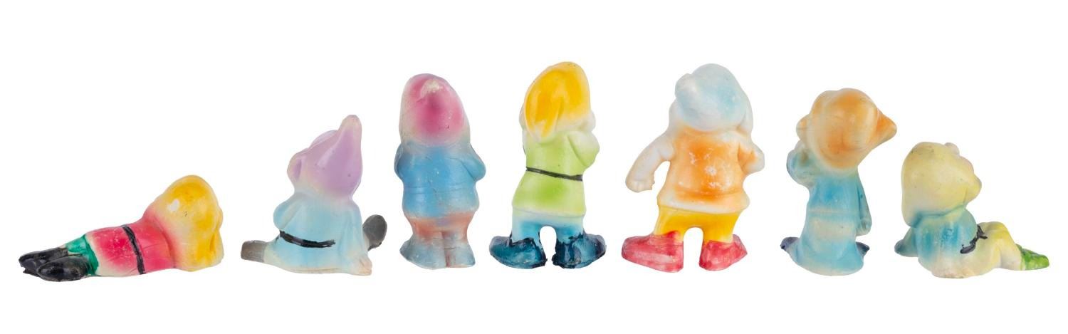 (Disney, 1970s) A collection of seven hand-painted figures of the Seven Dwarfs from Snow White. Ranging from 1.25" to 3" tall, each figure is in good condition overall with minor wear.
