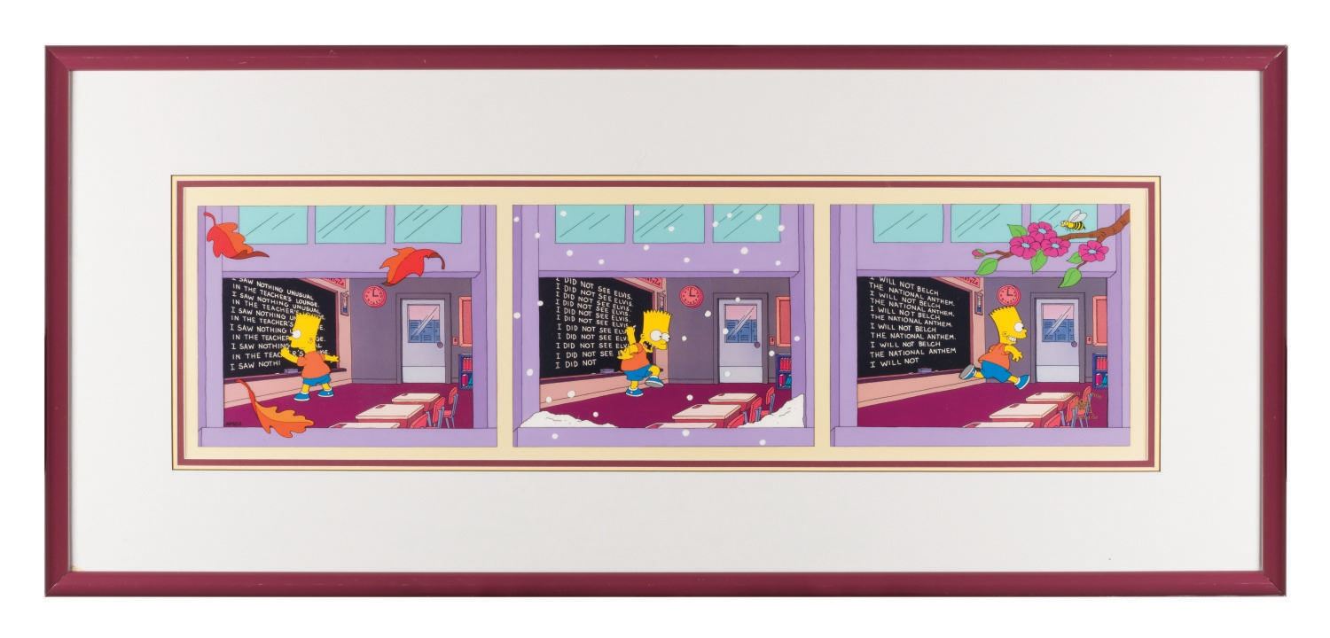 (Fox, c.1990s) A hand-painted limited edition cel featuring three scenes from the opening of "The Simpsons". The edition, titled "Blackboard Jungle" was originally released in an edition size of 300 pieces. This particular piece is one of 12 artists' proofs and is numbered 3/12 in the bottom left-hand corner. The piece is part of a limited edition, produced to a quantity of 300. The cel has a viewable image size of 9"x32" within an 18.5"x41.5" frame, with COA included, and is in fine condition. The frame is scratched and scuffed and has been retained only to protect the cel.