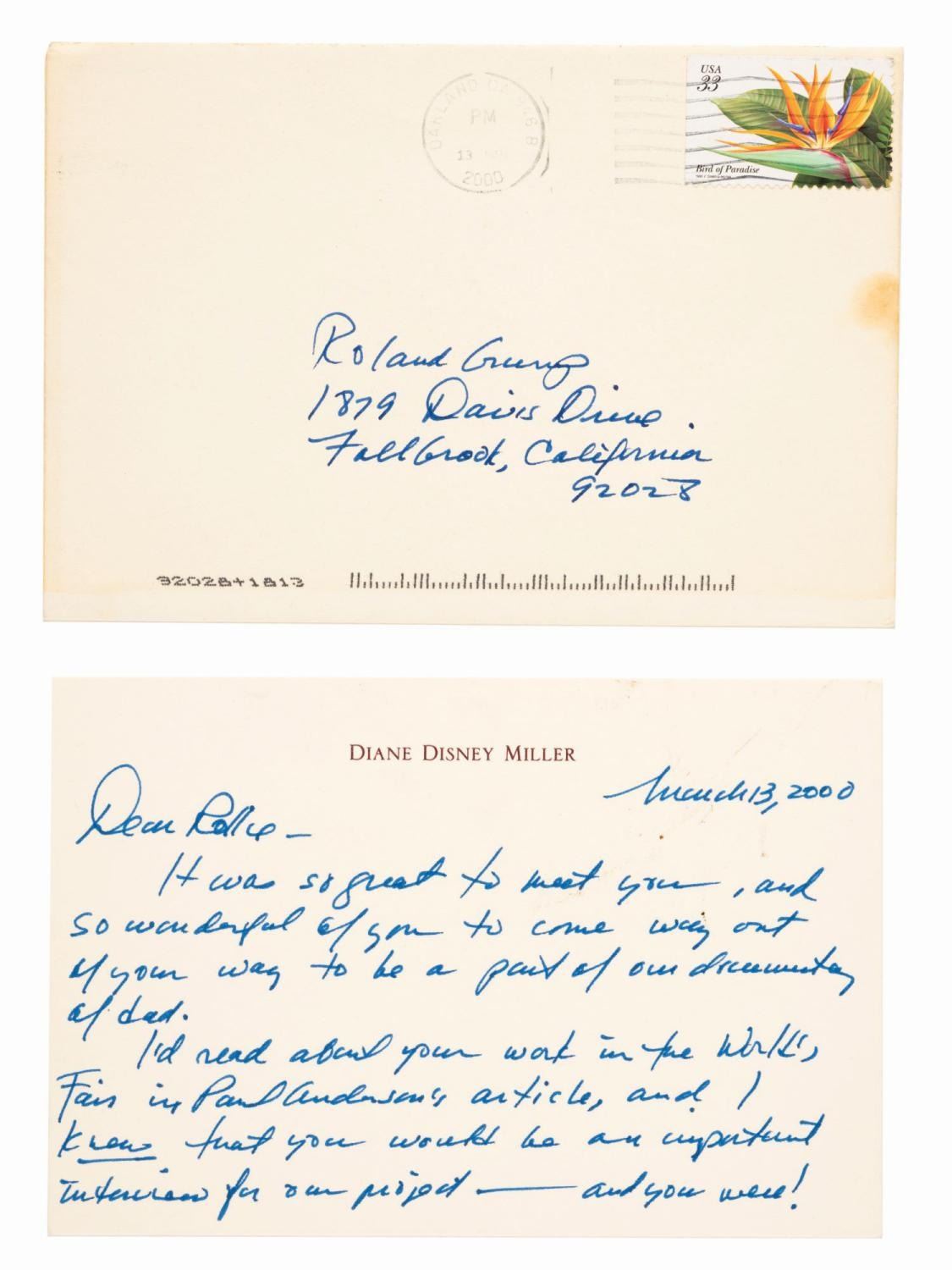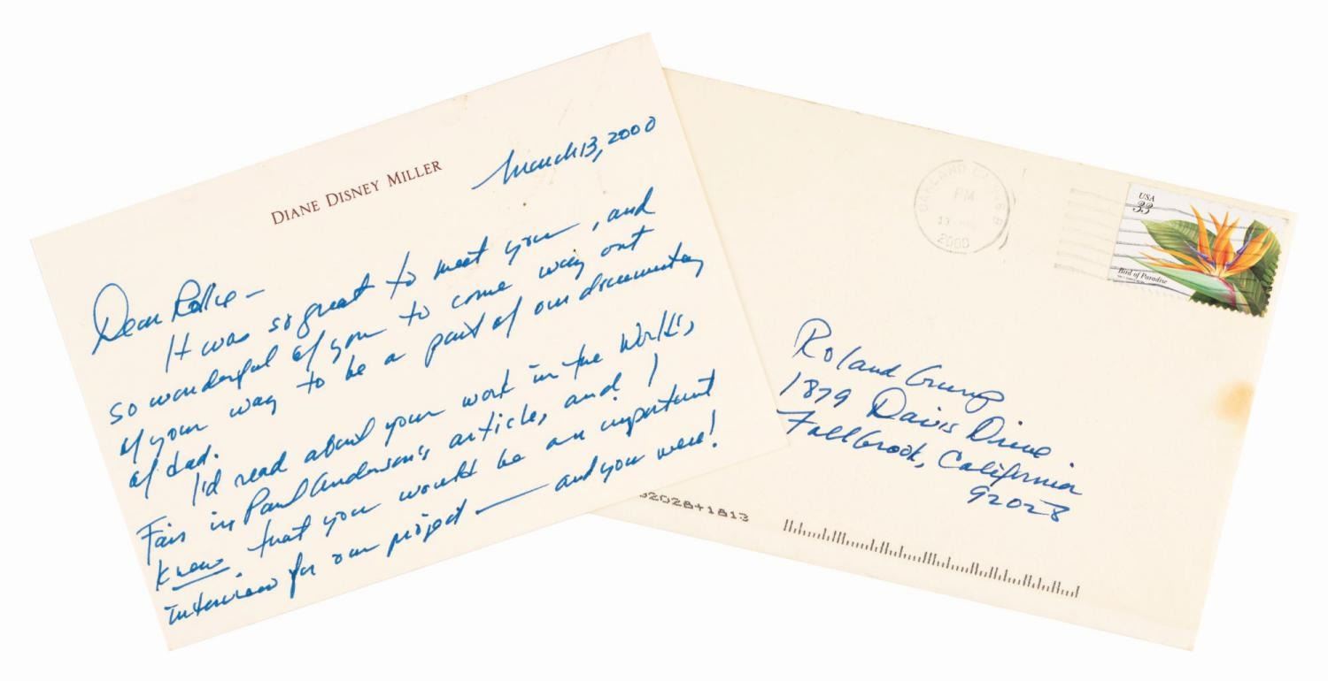 (Miller, 2000) A letter from Diane Disney Miller to Disney Legend Rolly Crump, written on Miller's personal stationery and in the original envelope. In the two-sided letter, Miller invites Crump to their home in the Valley to meet the family's new addition. She also informs the Disney Legend that they are sending him some of their wine. Measuring 4.25" x 6.5", the letter is in very good condition with some minor scuffing to the front side.