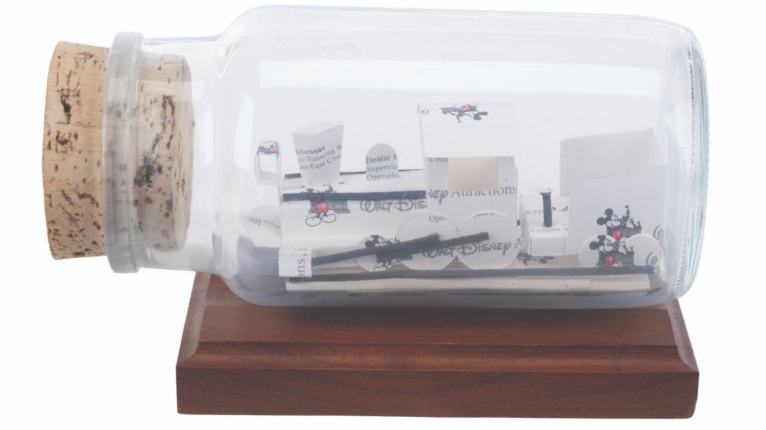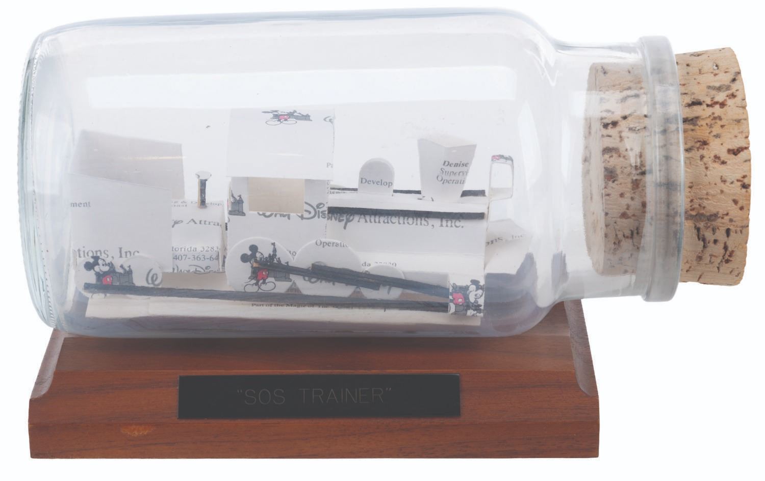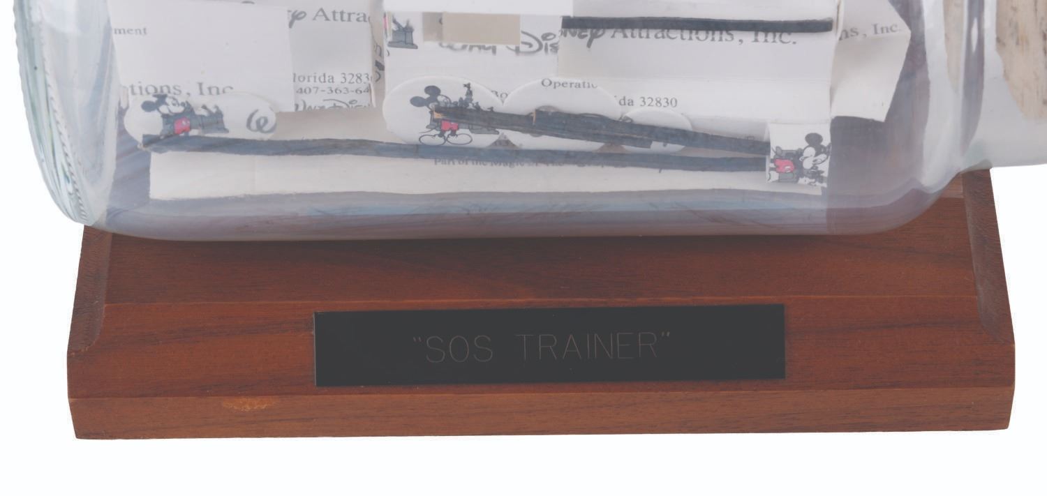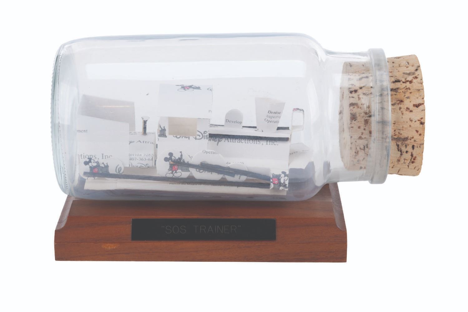 (Disney, 1990s) A Walt Disney Attractions Inc. handmade business card train in a bottle. Titled"SOS Trainer," the piece was assembled at Studio Employee Service from business cards cut and folded into the shape of a train, inside a bottle, and mounted to a wooden base. Measuring 3.5" x 7.5" x 4.25" tall, the piece is in good condition with light wear from display, age, and handling.
