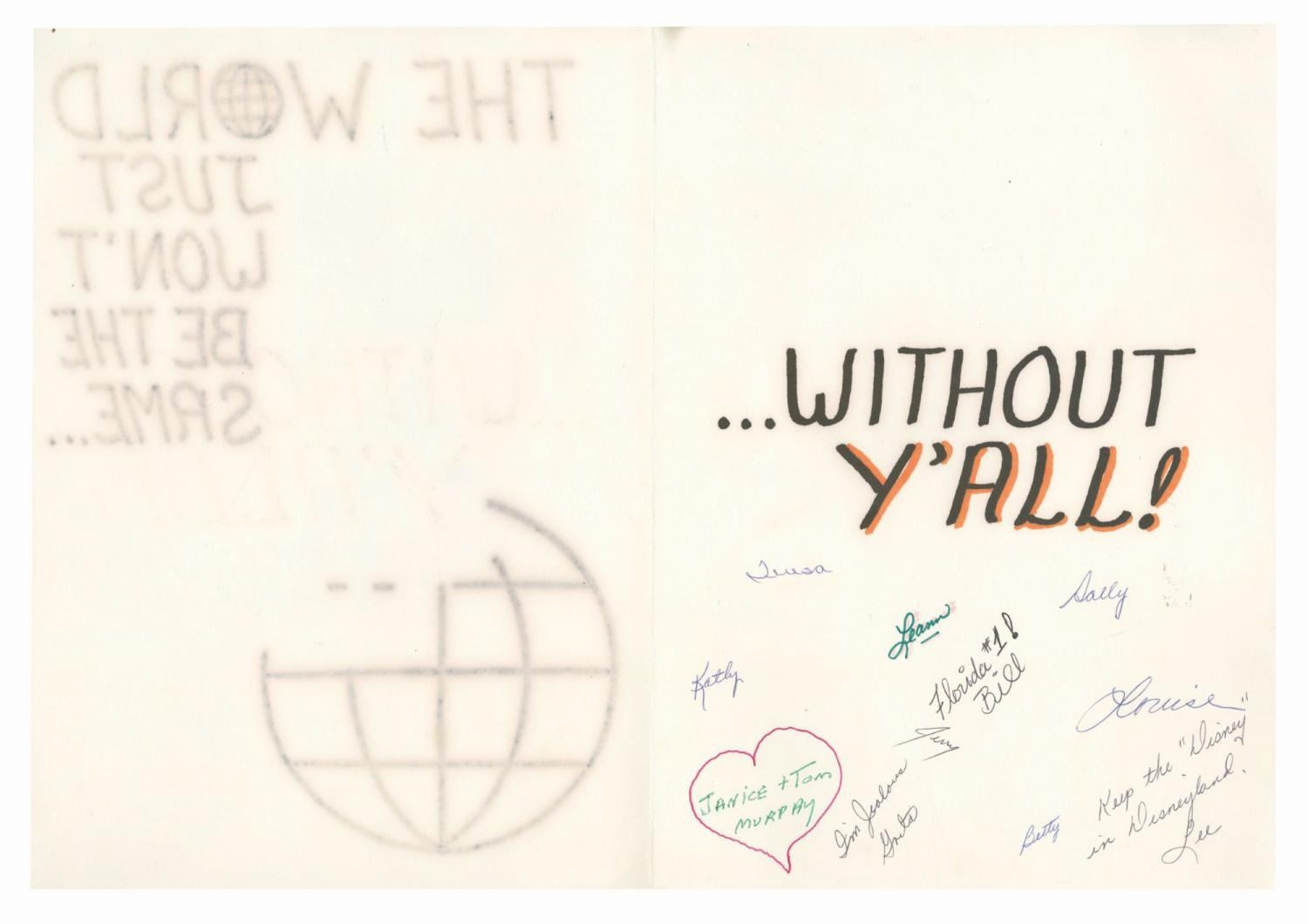 (Walt Disney World, 1990s) A unique handmade employee farewell card, featuring a glum-looking Mickey atop the Walt Disney World globe. The card reads, "The World just won't be the same..." and opens to say, "... without y'all!" and includes 12 employee signatures. The card measures 11" x 8" and is in very good condition with minor wear to the back.