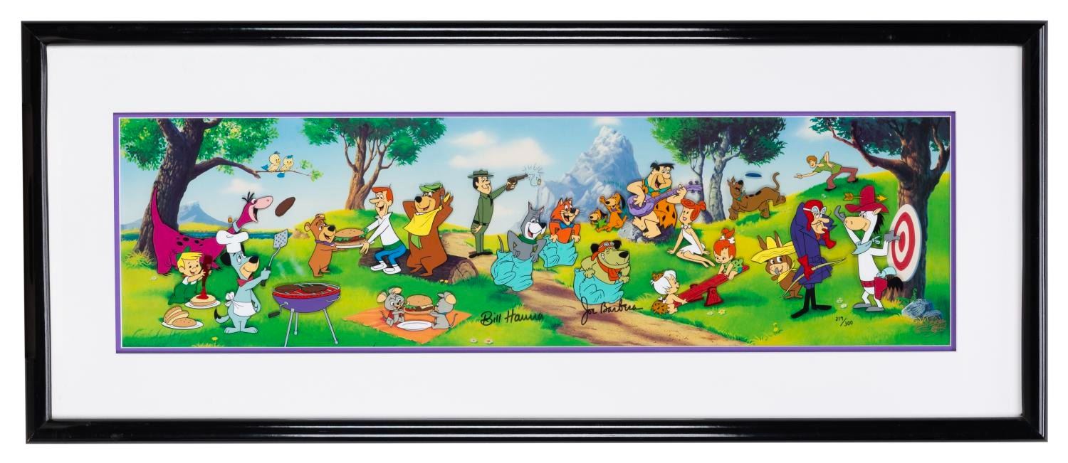 (Hanna-Barbera, 1991) A limited edition hand-painted cel titled "Company Picnic" signed by William Hanna and Joe Barbera. Numbered 217/300 and measuring 19.5" x 47" with an image size of 10.5" x 37.5", the piece is in fine condition with light wear to the frame from display.