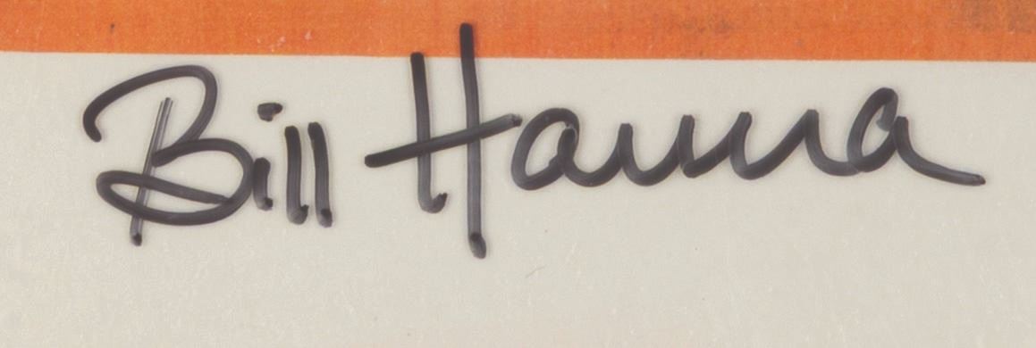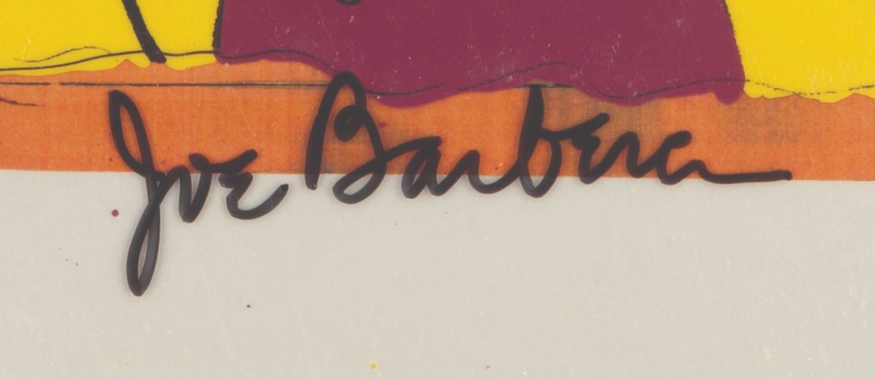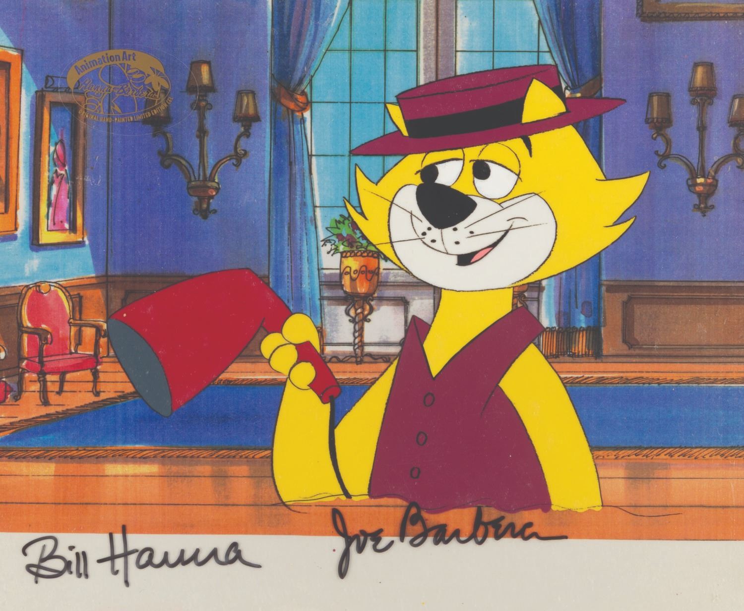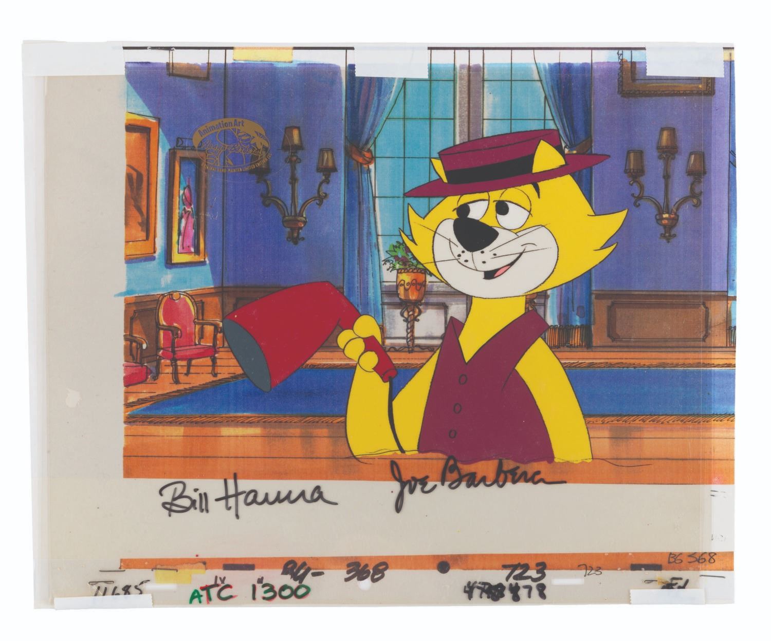 (Hanna-Barbera, 1988) An original multi-layer production cel from “Top Cat and the Beverly Hills Cats,” signed by series creators Bill Hanna and Joe Barbera. Despite being a production cel, the studio placed a “Hand-Painted Original Limited Edition Cel” sticker on the top left corner when preparing for original sale. Top Cat has an image size of 6.5” x 8” on a 10.5” x 13” cel, paired with a color copy background. The piece is in very good condition with light wear from production use, and three staples along the bottom edge of the cel attaching it to the copy background.