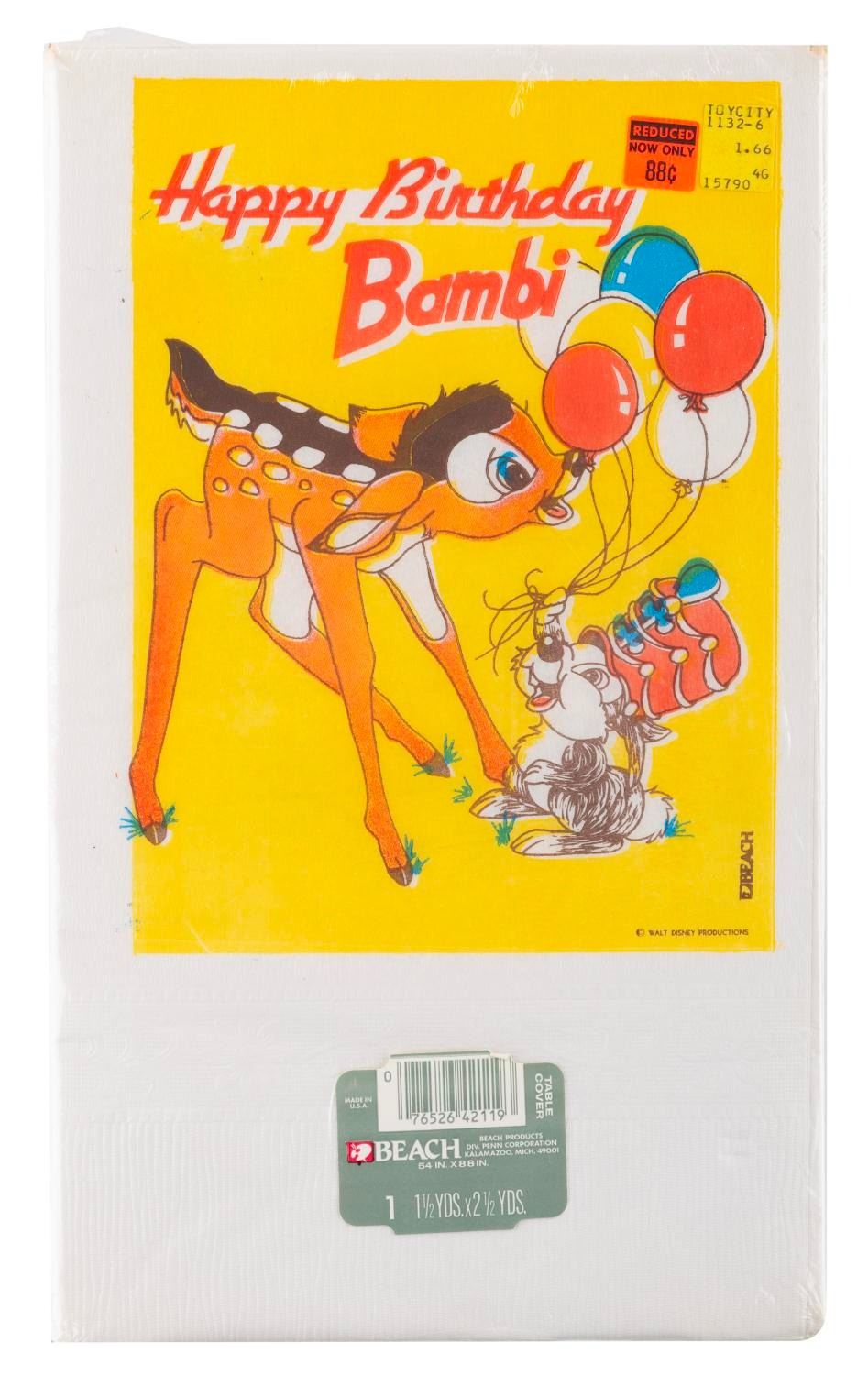 (Beach, 1980s-90s) A paper Happy Birthday Bambi table cloth. Measuring 8" x 13.5" the unopened tablecloth is in very good condition with light edge wear and discoloration from age.