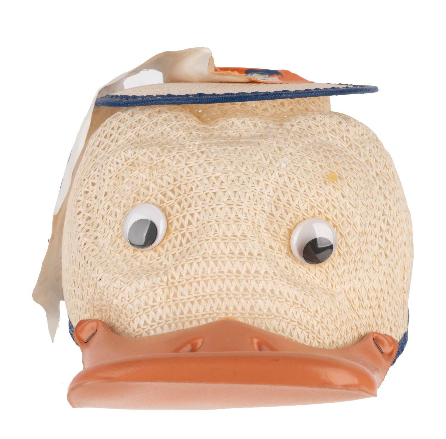 (Disneyland, 1970s) A Donald Duck squeaker cap with a "Happy Birthday Donald Duck" ribbon. Labeled size "medium", the cap measuring 9.5" x 7" x 5.25" high is in very good working condition, with creasing to the ribbon.