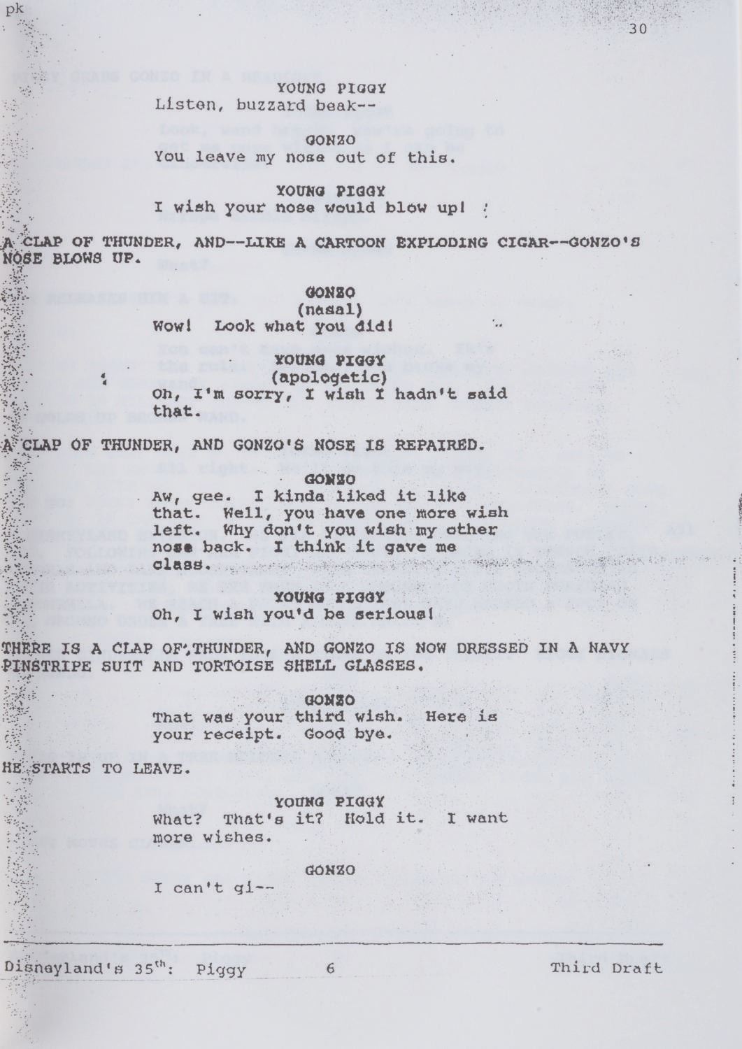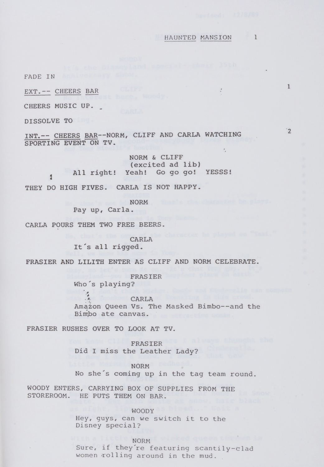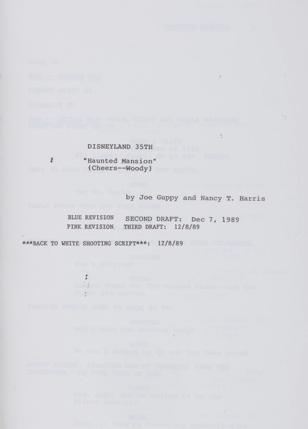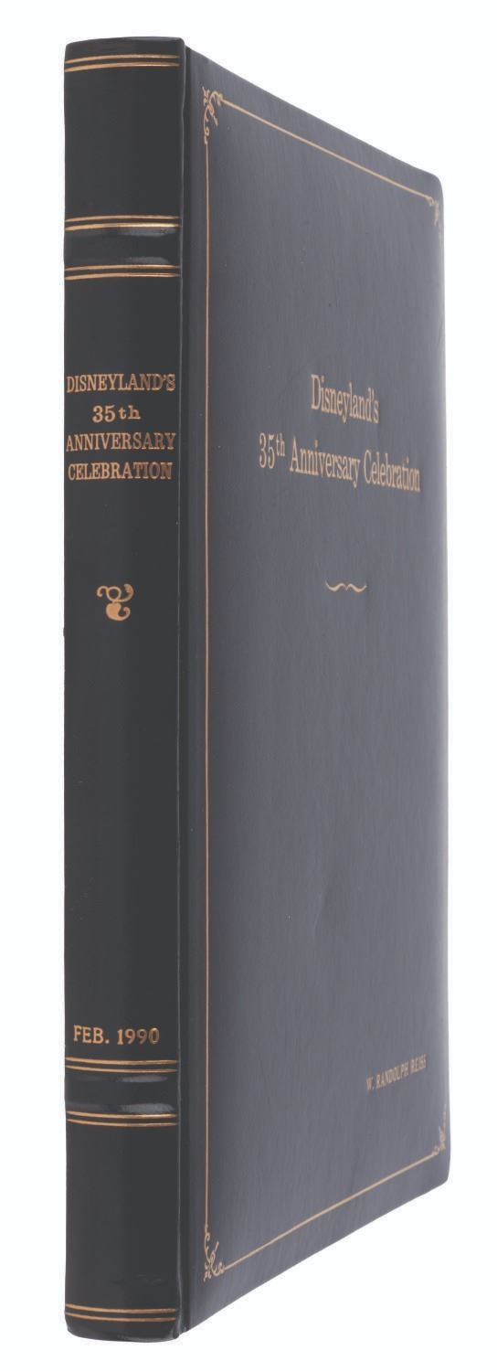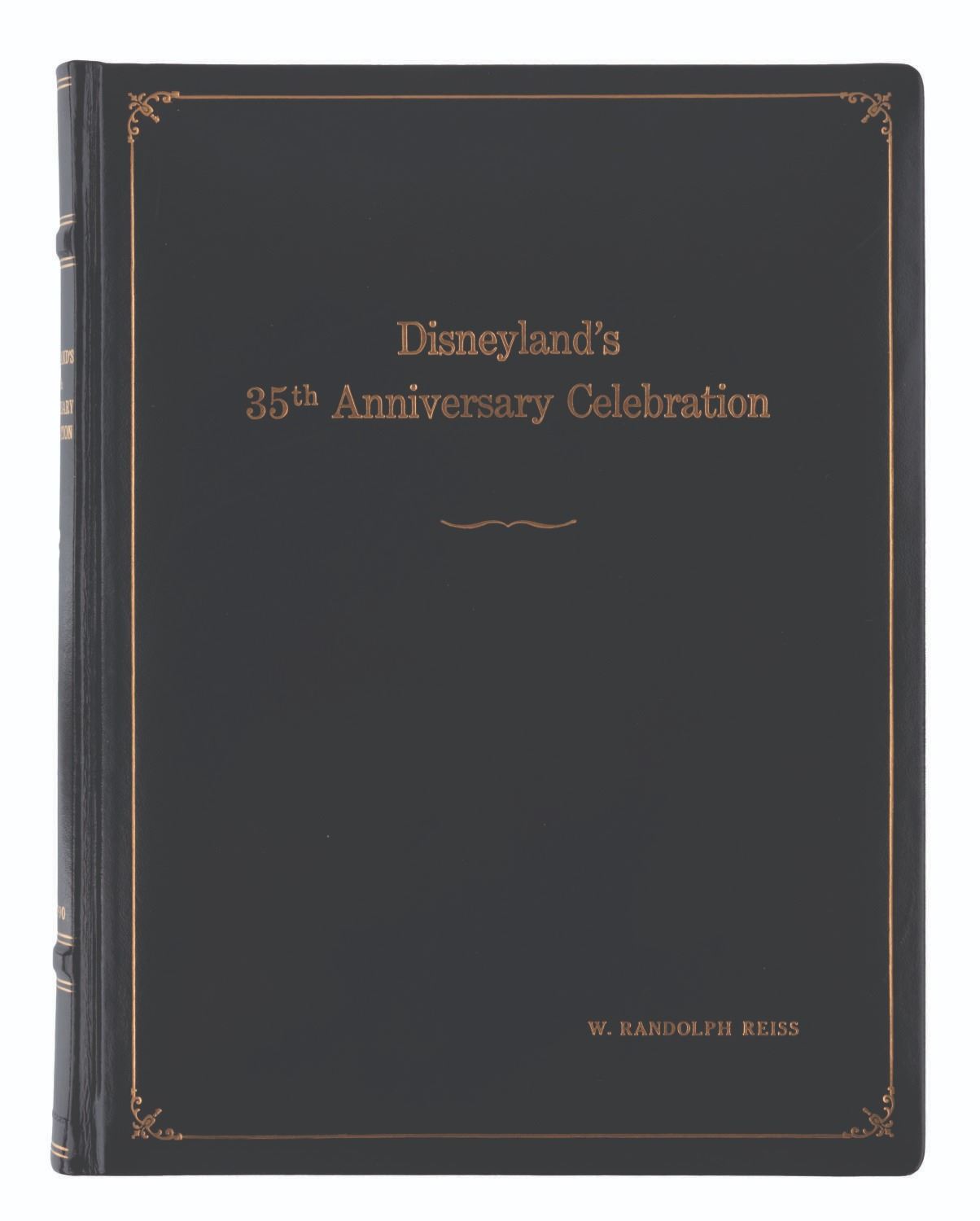 (Disneyland, 1990) A beautifully hardbound copy of the script for Disneyland's 35th Anniversary Celebration television special in 1990. The script opens with the cast of"Cheers” reminiscing about Disneyland and the Haunted Mansion, and includes sketches around the Park that featured Charles Fleischer and Jim Varney. Measuring 8.5” x 11” x 1”, the custom-bound script is in very good condition with light handling wear to the cover.