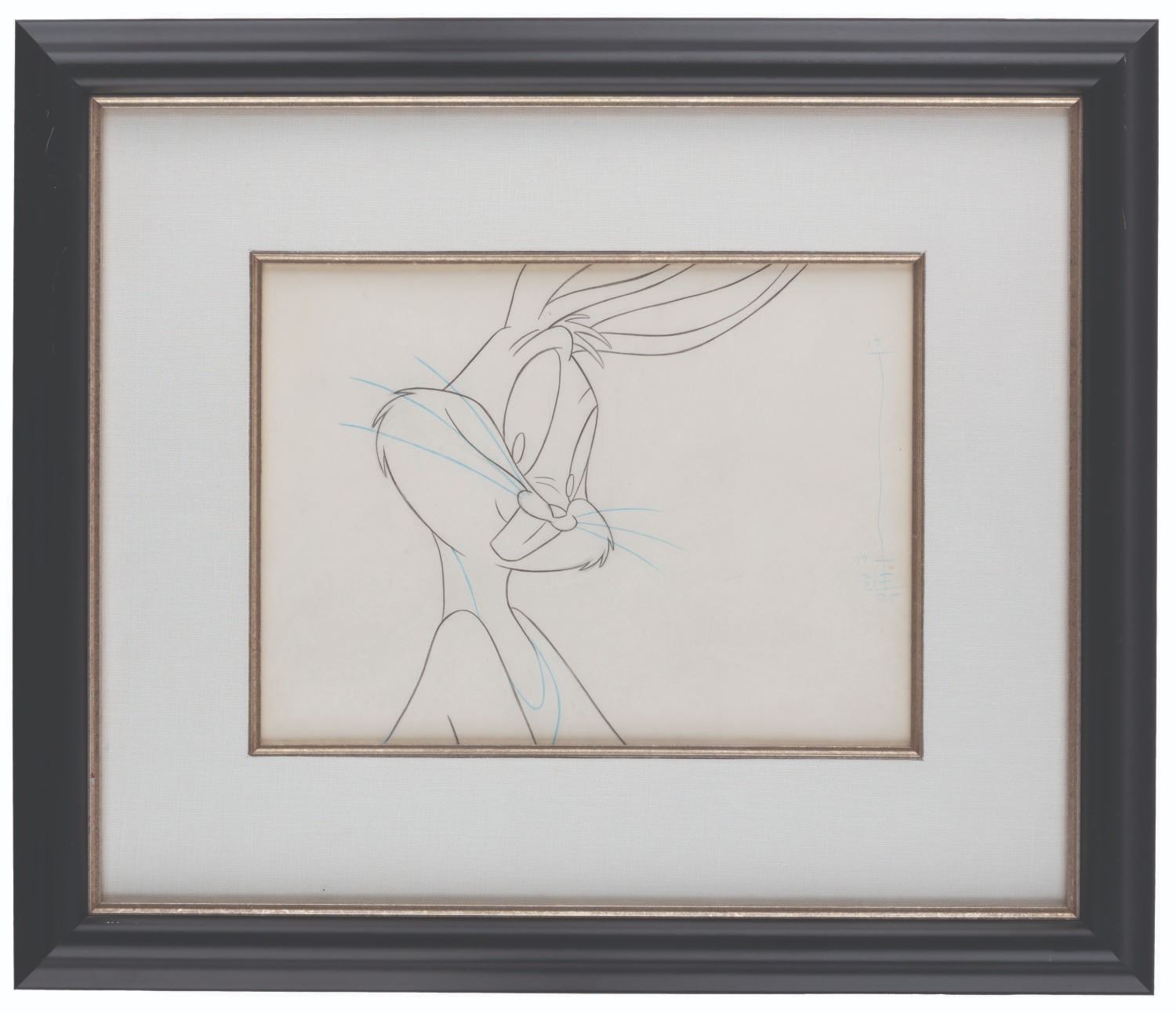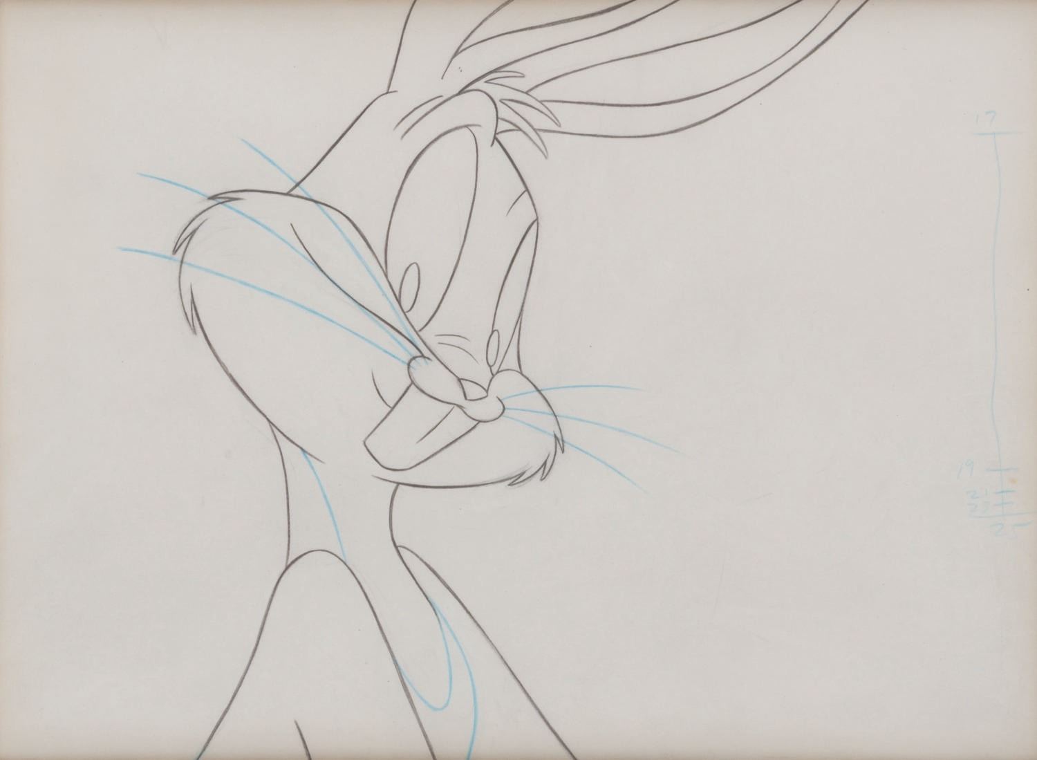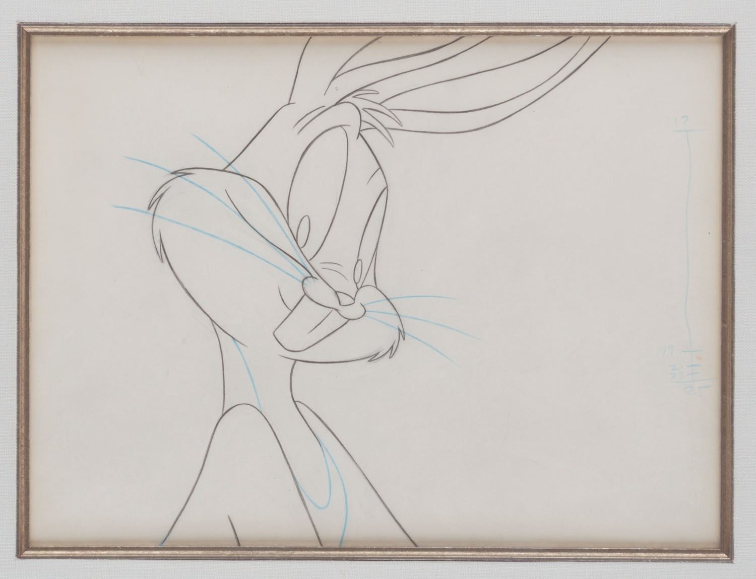 (Warner Bros., 1992) A framed original production drawing of Bugs Bunny from the "Hare Jordan" Nike commercial co-starring Michael Jordan. Bugs has an image size of 8" x 8.5" on 8.5" x 11.5" visible animation paper. The entire framed and matted piece measures 17.5" x 20.5". The art is in very good condition with creases and a spot of discoloration, while the frame displays in good condition with scratches, scuffs, and wear.