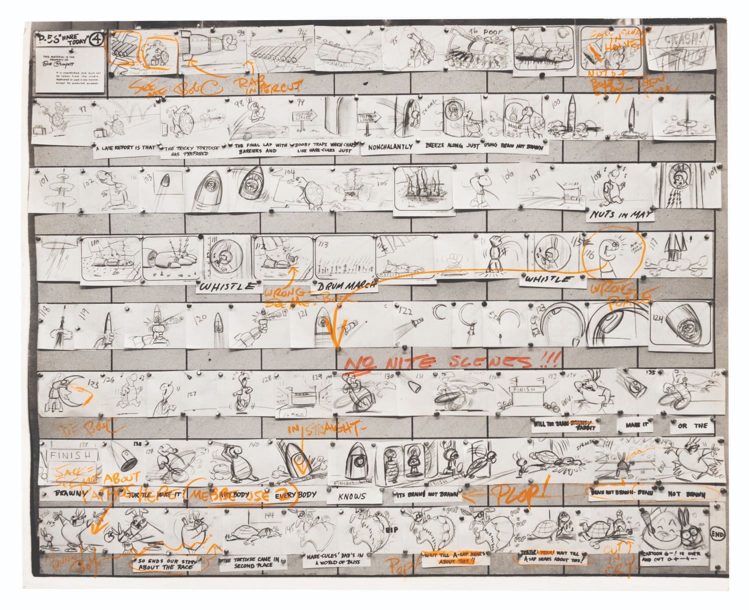 (Clampett, 1962) A photo print of Board 4 of the storyboard for the “Beany and Cecil” episode, “Hare Today, Gone Tomorrow.” The print has hand-written notations in orange grease pencil by Bob Clampett and was used by animators as a reference during production. Measuring 16” x 20”, the print displays in good condition with edge wear, light creases and pinholes from production use, and light warping from age.