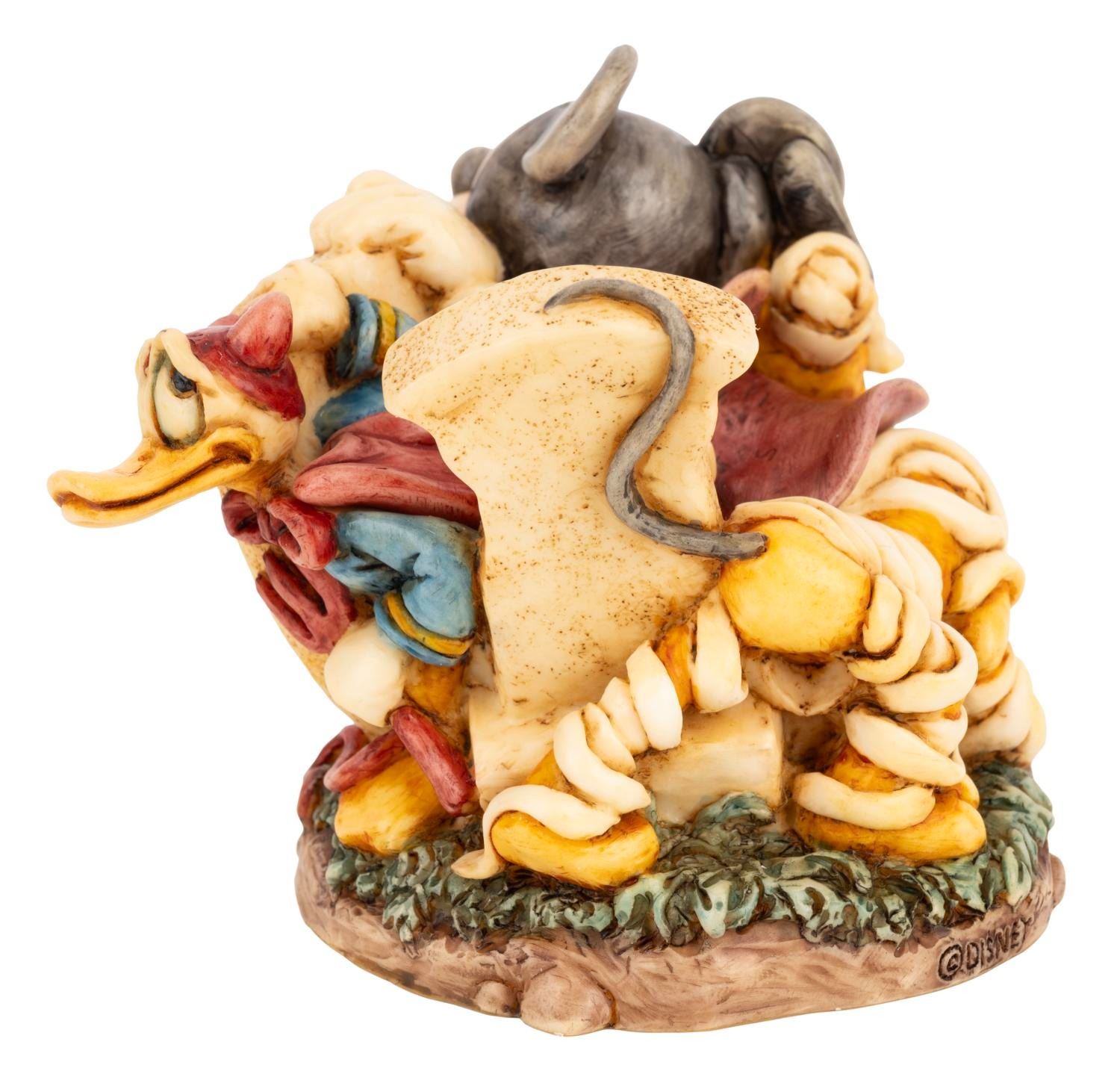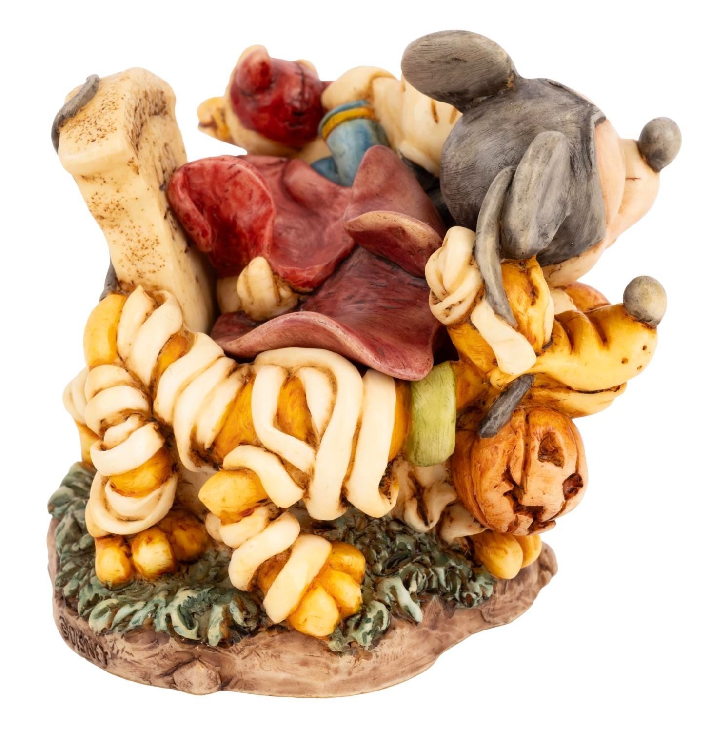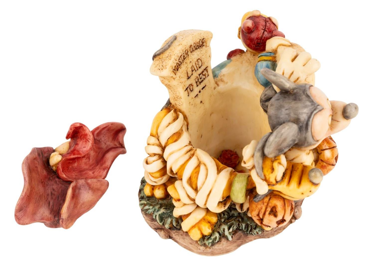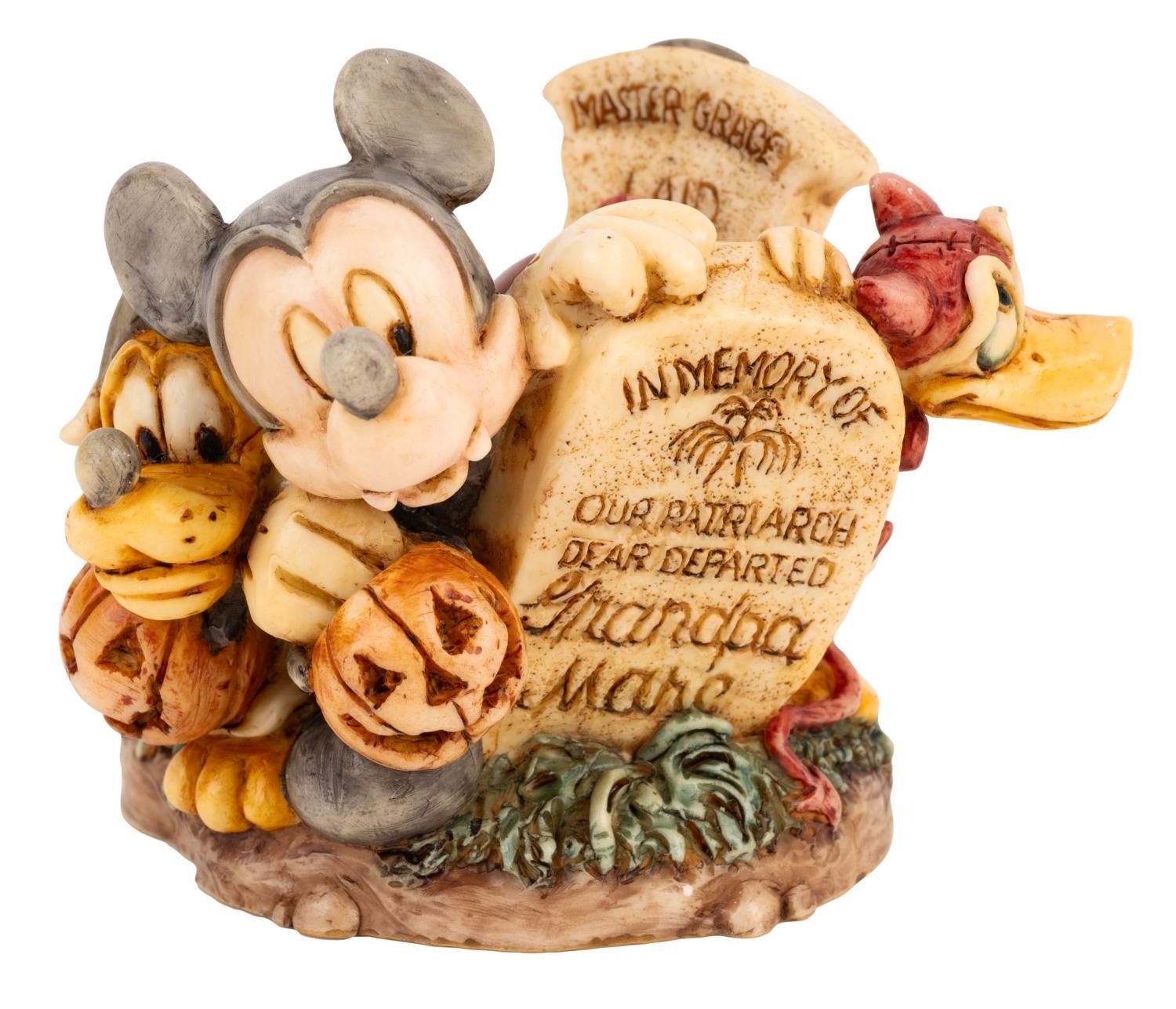 (Walt Disney World, 2003) A Harmony Kingdom halloween box, released at the Happy Haunts event. The figure features Mickey, Donald, and Pluto trick-or-treating by the tombstones of Master Yale Gracey and Marc Davis, and was released in an edition size of 500. Measuring 3.25" tall and 3.75" in diameter, this piece is in fine condition.