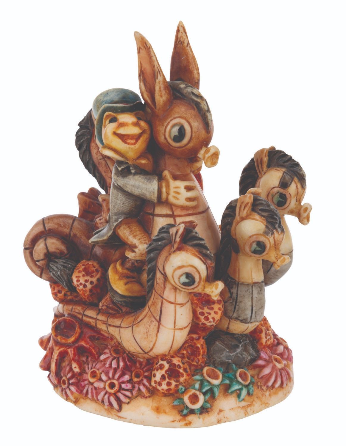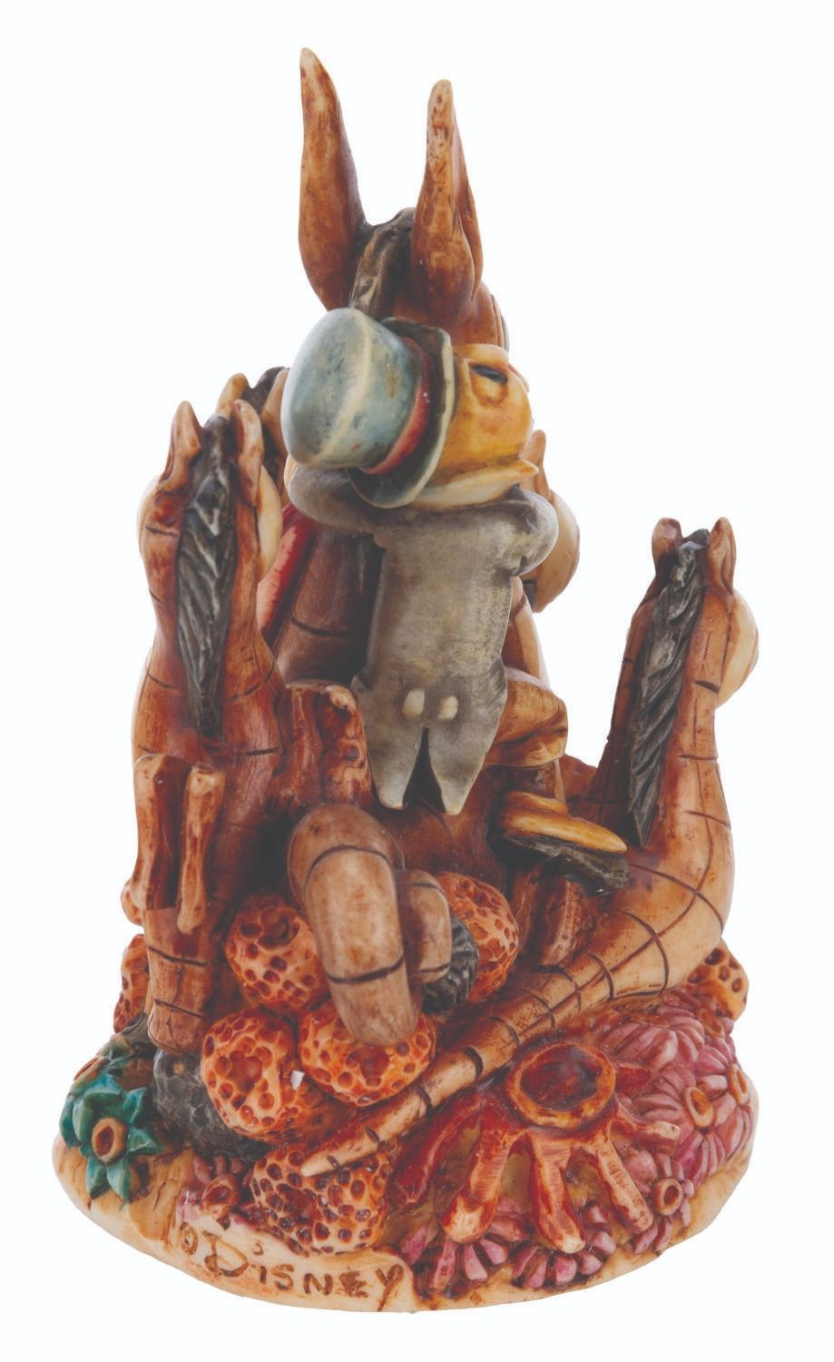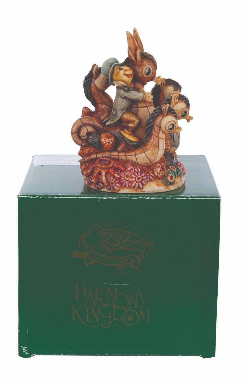 (Harmony Kingdom, 2004) A trinket box figurine titled "Jiminy Cricket and Seahorses" released in a limited edition of 500 by Disney Auctions. Jiminy himself is the “lid” of the figural box, with a starfish hidden inside. Standing 4.25” tall and 3.5” in diameter, the box is in fine condition.