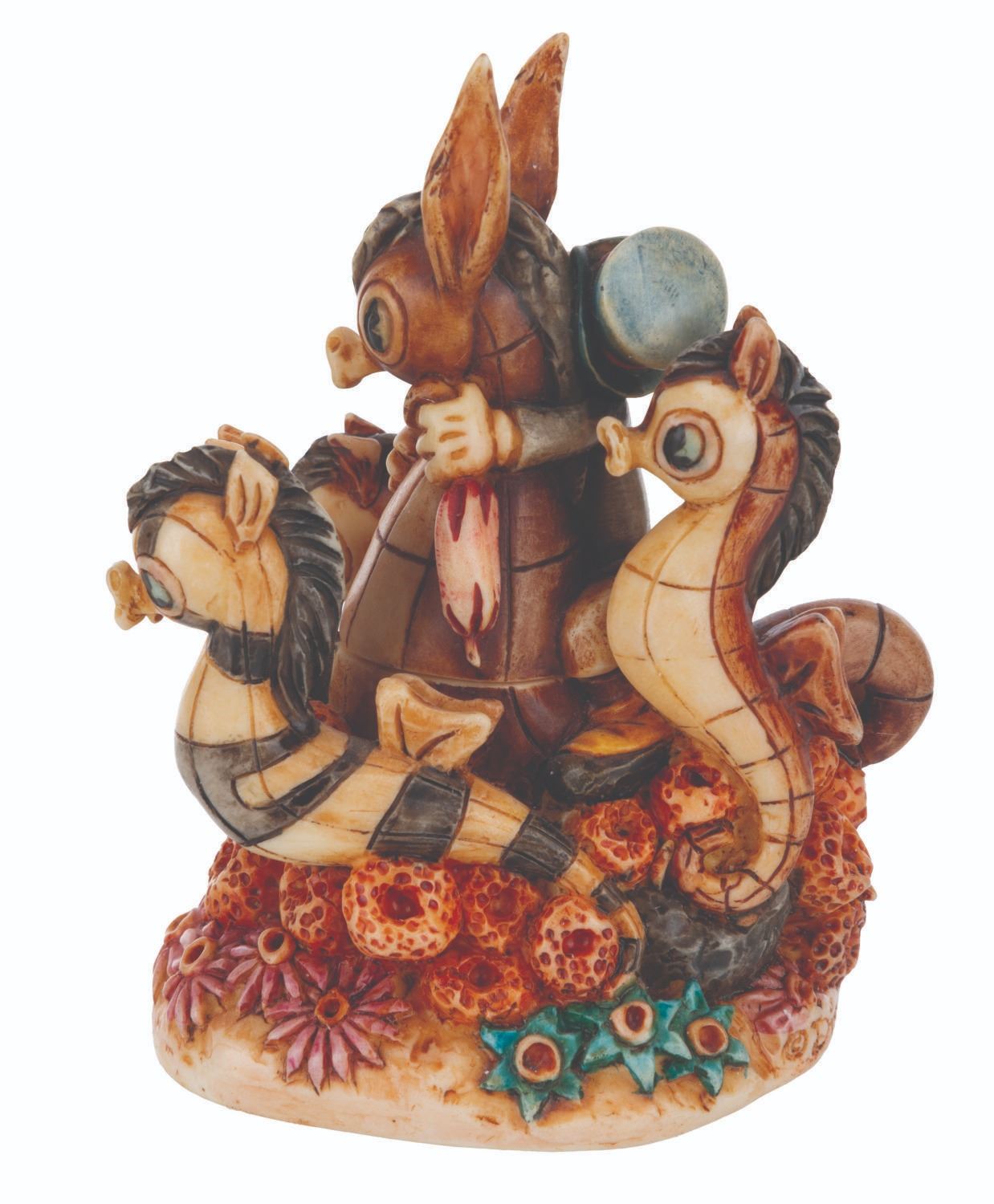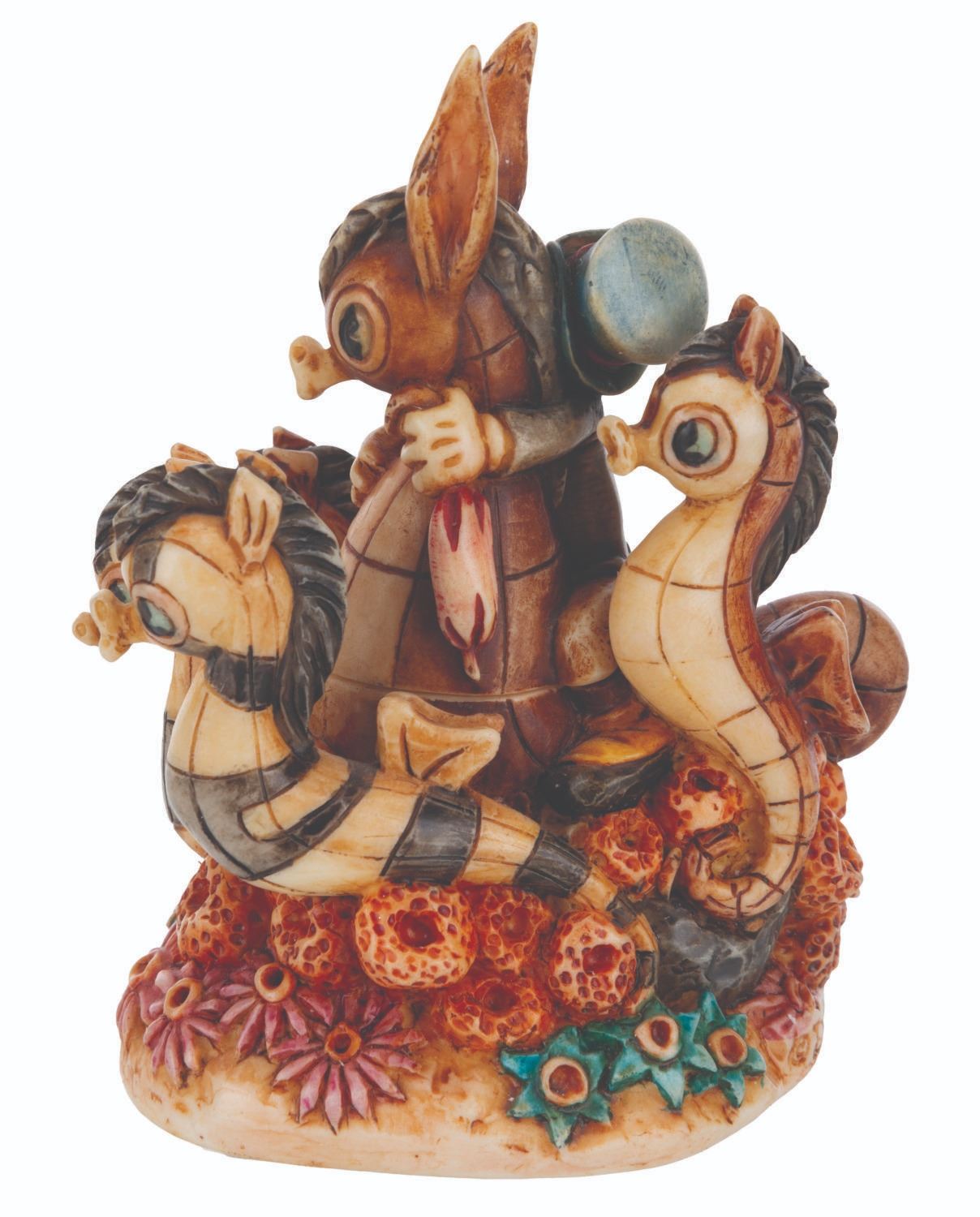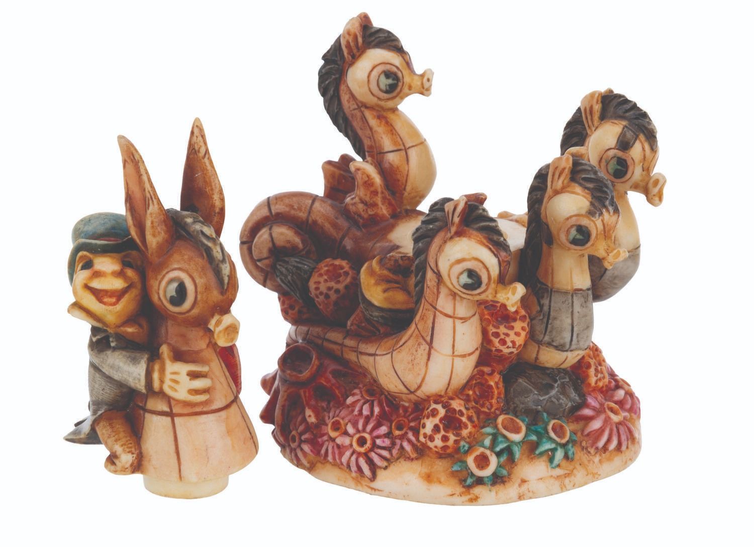 (Harmony Kingdom, 2004) A trinket box figurine titled "Jiminy Cricket and Seahorses" released in a limited edition of 500 by Disney Auctions. Jiminy himself is the “lid” of the figural box, with a starfish hidden inside. Standing 4.25” tall and 3.5” in diameter, the box is in fine condition.
