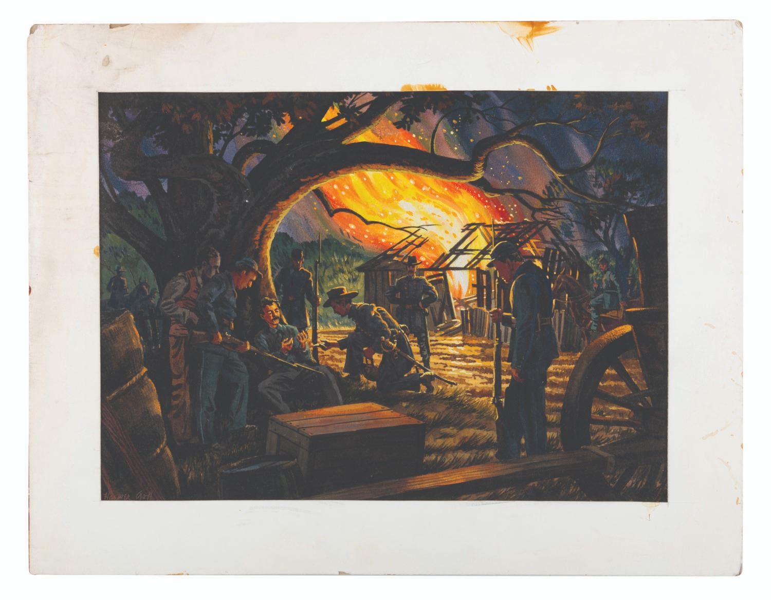 (Goff, 1946) An original painting by Harper Goff for “Blood on the Moon,” a February 1946 article in Coronet magazine. Seven original pieces by Goff appeared in the article, which recounted the assassination of President Abraham Lincoln. This impressive painting of John Wilkes Booth’s capture differs slightly from the article’s final version, with Booth in a different color shirt and pose, and the staging adjusted on the right side. With an image size of 11.25” x 15.25” in a 15” x 19.25” matte, the painting by the Disney Legend is in very good condition with a minor scuff, while the matte is in fair condition with stains, creases, tears, and wear.