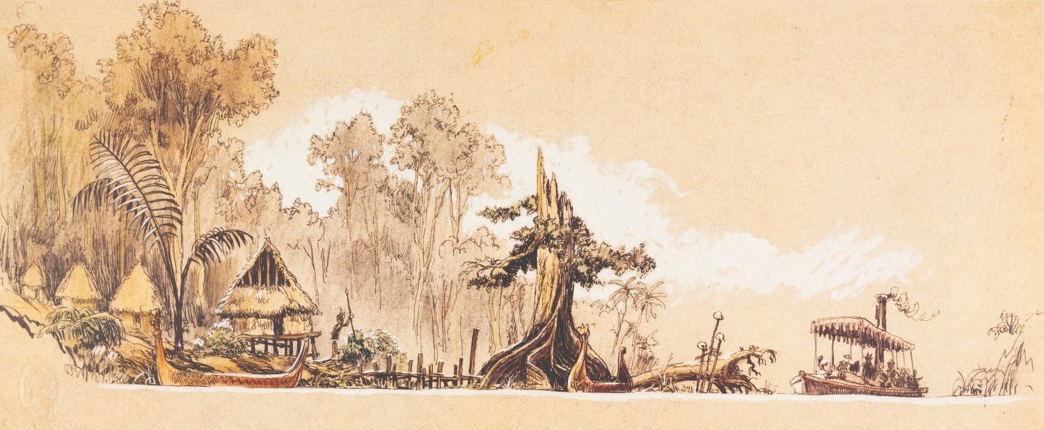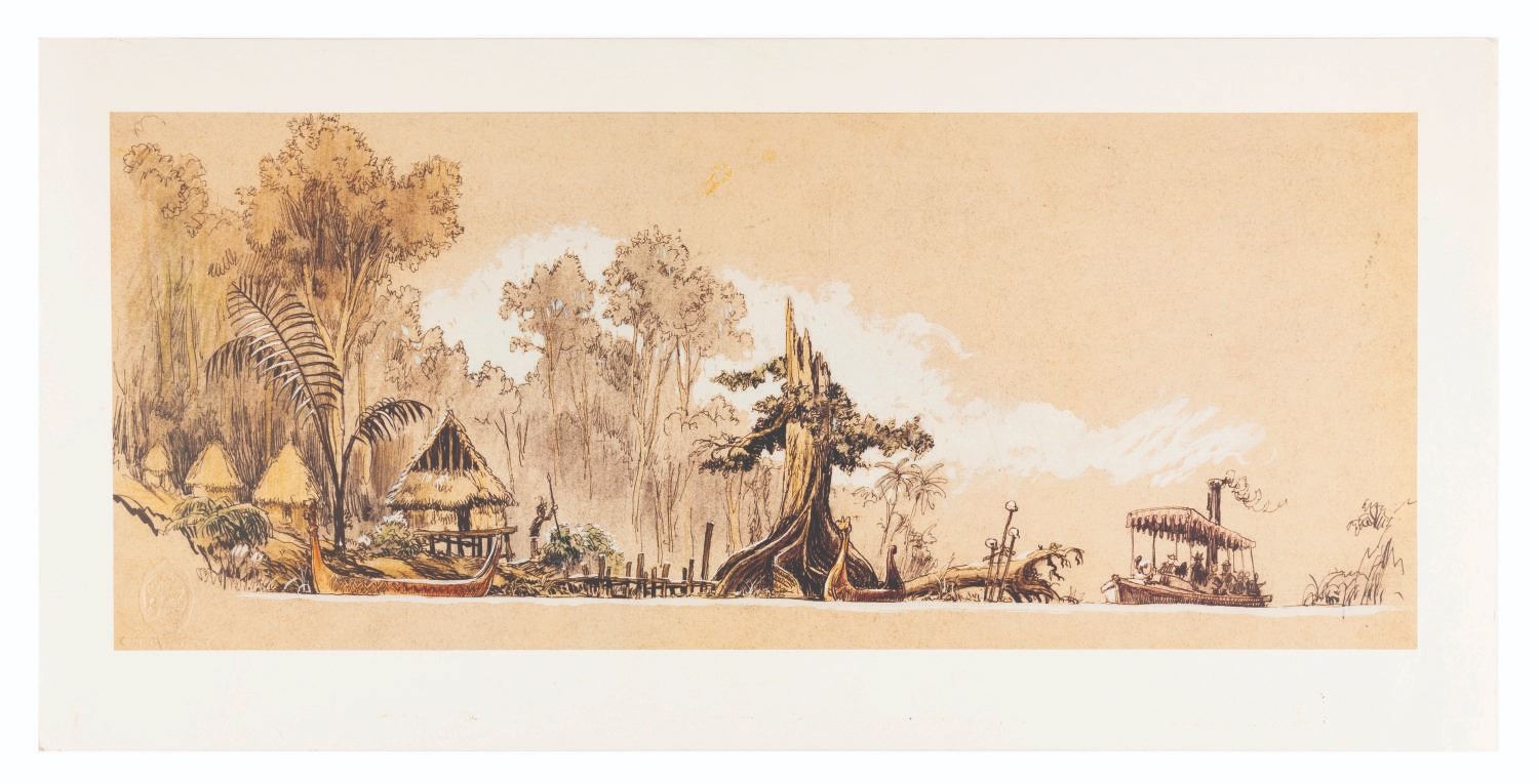 (Disneyland, 1987) A Disney Gallery lithographic print of concept art for the Jungle Cruise by Imagineer Harper Goff. The print retains a debossed Disney Gallery stamp at the lower left. While this print was released in a signed limited edition of 300, this unsigned print is unnumbered. Measuring 14.25” x 29" with an image size of 10.75” x 25.75” the piece is in good condition with light wear and soiling.