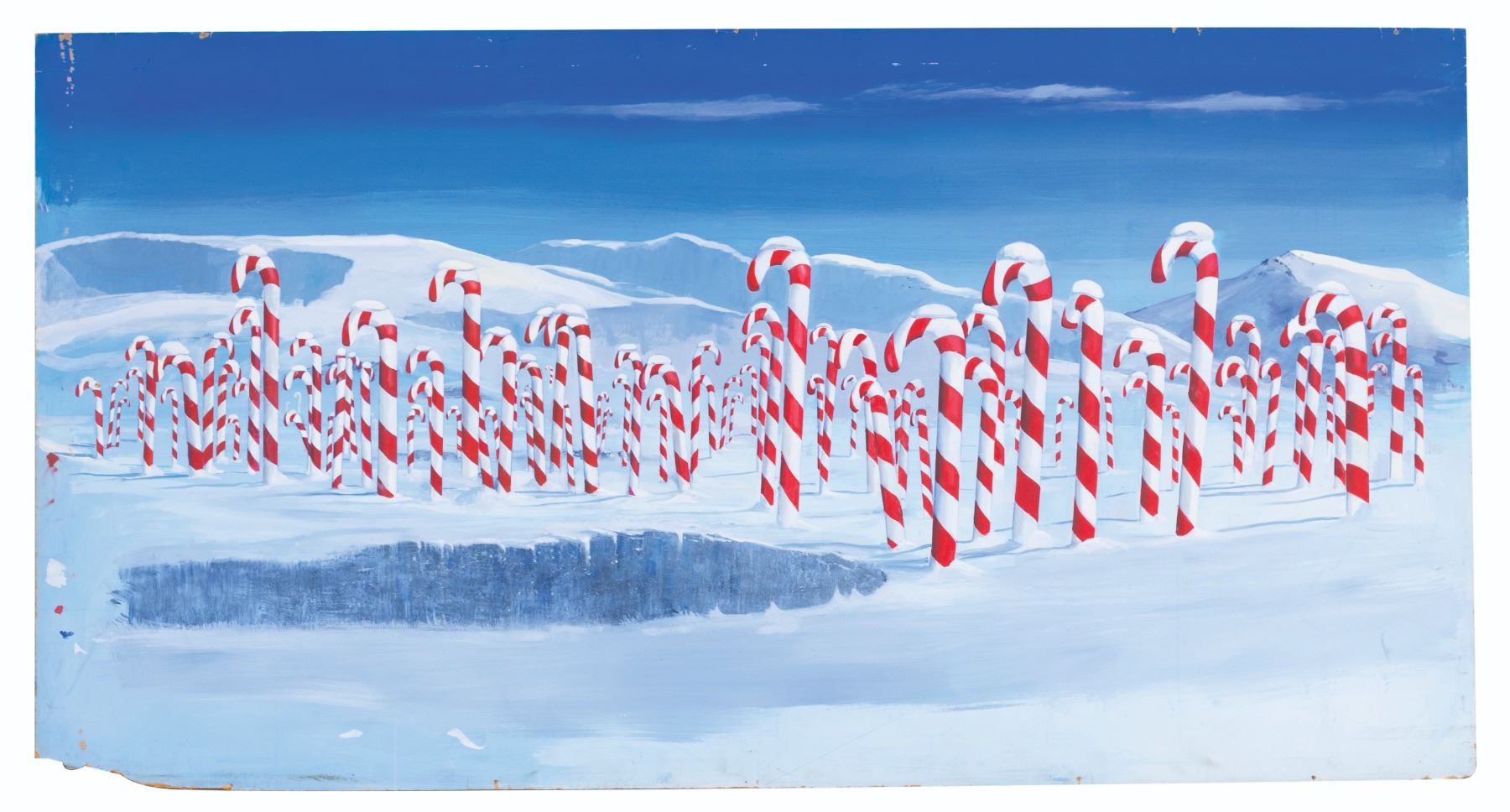 (New Line Cinema, 2003) A large original background concept painting by acclaimed artist Harrison Ellenshaw for the Will Ferrell Christmas classic “Elf.” Throughout his illustrious career, the matte artist and effects wizard contributed to groundbreaking films including “Star Wars,” “The Black Hole,” TRON,” and “Dick Tracy.” Ellenshaw’s depiction of the Candy Cane Forest inspired the final version which Buddy the Elf walks through in the film, filled with red and white candy canes as tall as trees. Measuring 80” x 42.5” tall, the acrylic painting is in good condition with wear from production use including scrapes, scuffs, stains, paint loss, edge cracks up to 3” long, and a 2” x 11” section missing at the bottom left corner. This item requires special shipping arrangements. Please inquire before bidding.